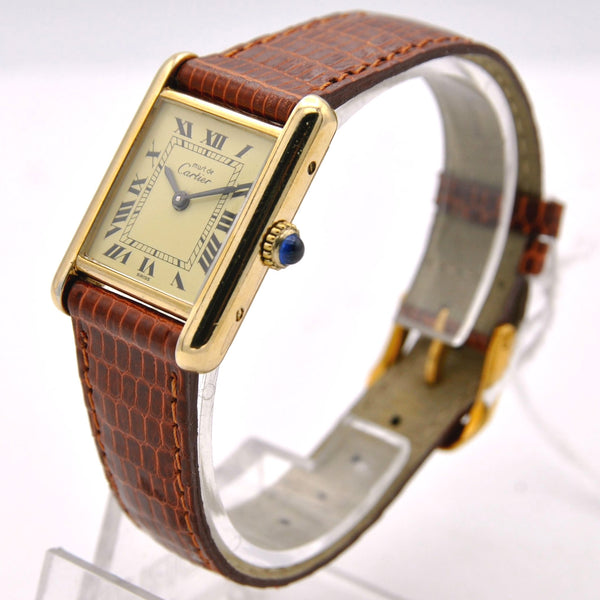 The Cartier Tank is over 100 years old and is still one of the most recognisable watch designs ever made. It was inspired by the top view of the First World War Tanks, where the tracks ran around the body of the vehicle, and during an age where machines were inspiring design everywhere through design movement including Cubism, Bauhaus and de Stijl. When it was first designed in 1919, the simple design followed Louis Cartier’s design codes from his earlier wristwatches; the railway-style minute tracking, Roman numerals, blue steel hands, the cabochon winding crown and, Cartier’s own invention, the deployment buckle. It was also at this time that Edmond Jaeger designed the movements, which were made by LeCoultre. In the 50 years since the first Cartier Tank was sold, only 6,000 were ever produced (6 were produced in the first year and 33 in the second), making Tanks from this age incredibly rare.It wasn’t until 1976 that the in-house Must de Cartier Tank was launched, the first product in the in-house Must line. These Tanks were made of vermeil, or silver gilt, which is gold-plated sterling silver. This made the new line more affordable whilst still having the prestige of being made from a precious metal. Various sizes, dial colours and finishes were then produced for both men and women. The Must de Cartier line was faded out at the beginning of the 21st century.
