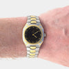 Here we have a 1986 Omega Seamaster Polaris Two-Tone gold and steel piece on a Bracelet 386.0822 with a 31.5mm brushed stainless steel / Gold cushion-shaped case that flows over your wrist thanks to the integrated H-Link bracelet, and a lug-to-lug length of 42mm and a case thickness of just 6.5mm ensure a comfortable fit. On the right side is a signed crown and the gold geometric-shaped bezel surrounds a flat crystal. A raised outer minute chapter ring has cream lume surrounding dots with gold markings and gold-toned hands. Slender baton hands filled with lume are complemented by a tapered second hand, at 12 o’clock we have the Omega motif and at 6 o’clock “Seamaster” The watch holds a secret ! But with a turn of the crown you see the time in a digital format, see the seconds ticking away, display the date and the day, see a second time zone, start a stopwatch or even set an alarm. completes this striking timepiece. On the reverse, a screwed on brushed case back engraved with Omega Seamaster, Hippocampus inside a quality and innovative Quartz Omega Cal 1665 movement, Instructions here! The watch comes paired with its Omega 18mm H-link steel and gold integrated bracelet and signed concealed deployant clasp, links are provided and will fit up to a 7.5-inch wrist,