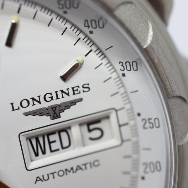 Underneath the sapphire crystal is the crisp, original, white dial. Applied, silvered baton markers indicate the hours. At 3 o’clock is the day date window, with ‘Longines,’ their logo and ‘automatic’ above and below it. At 6 o’clock is the 12-hour recorder subsidiary dial, at 9 o’clock the subsidiary seconds dial and at 12 o’clock is the 30-minute recorder. The tachymetre scale sits on the outer ring of the dial, curving up into the bezel, and is tracked with the red, flyback hand. Black, pencil hour and minute hands sit in the centre of the dial and give a sharp contrast to the white of the dial making for an easy read.