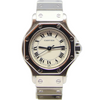 You can't get more stylish than this octagonal, ladies-sized, 24mm, stainless steel case with cabochon stone crown and stainless steel bezel with screw detailing. The sapphire crystal protects a clean white dial with Roman numerals marking the hours. Blued steel handset surrounded by the inner minute track. Screw-in case back houses the Cartier Automatic caliber. Fitted on its original,, stainless steel bracelet with screw detailing and signed folding clasp.