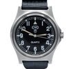 Underneath the domed crystal sits a matte black dial. The dial has a mixture of large, lumed Arabic numerals and a lumed triangle at 12 o'clock, all inside a an outer minute-tracking ring. Just below the triangle is 'CWC' in its oval logo and a circled 'T' to indicate the use of Tritium. At 6 o'clock is 'Quartz' painted in white. Lumed hour and minute hands sit at the centre pinion, along with a long, white, central seconds hand.