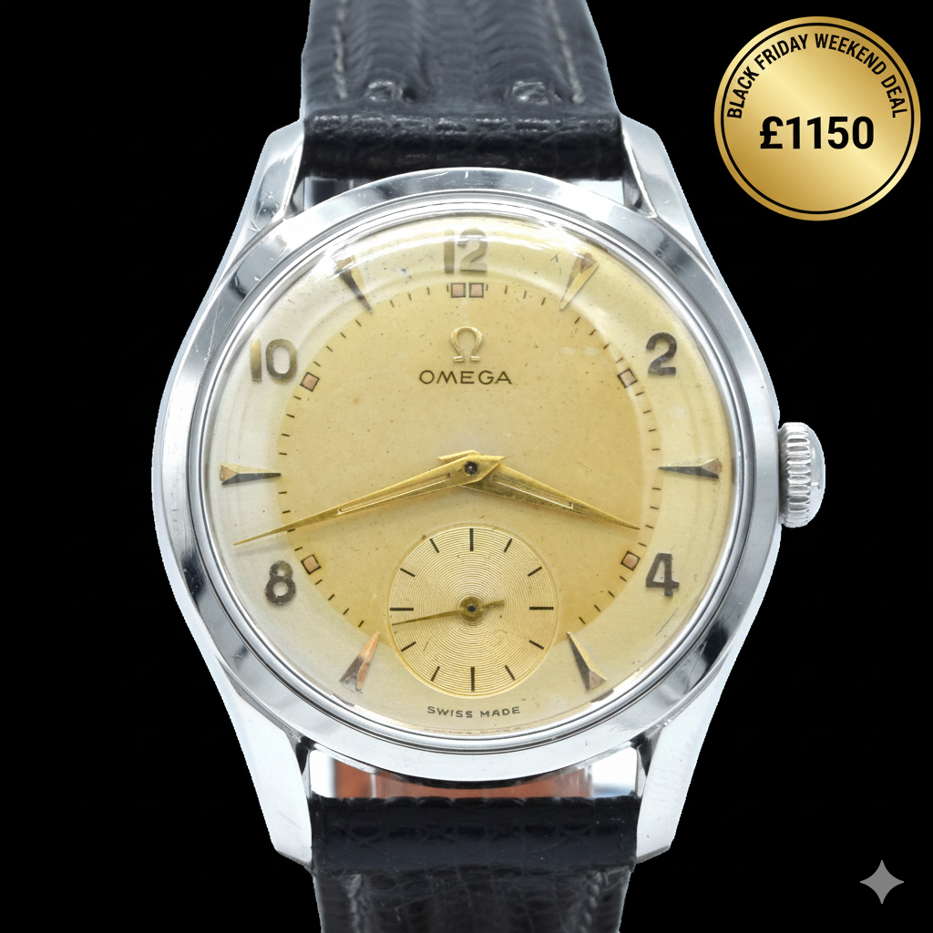 Another piece where the pictures do the talking. This really is a classic 1950s example. The pictures only giving a feel for how attractive it really is on the wrist. We opted for black ribbed lizard style straps but strap options are endless. This one needs to be seen to be believed, its about as good a vintage, preowned model 2639 Omega as you will find. All original and a very attractive patina to the quite unique dial. Perfect for the vintage watch newbie, the hardened collector or anyone in fact. with original dials on watches available like this then why buy restored ?