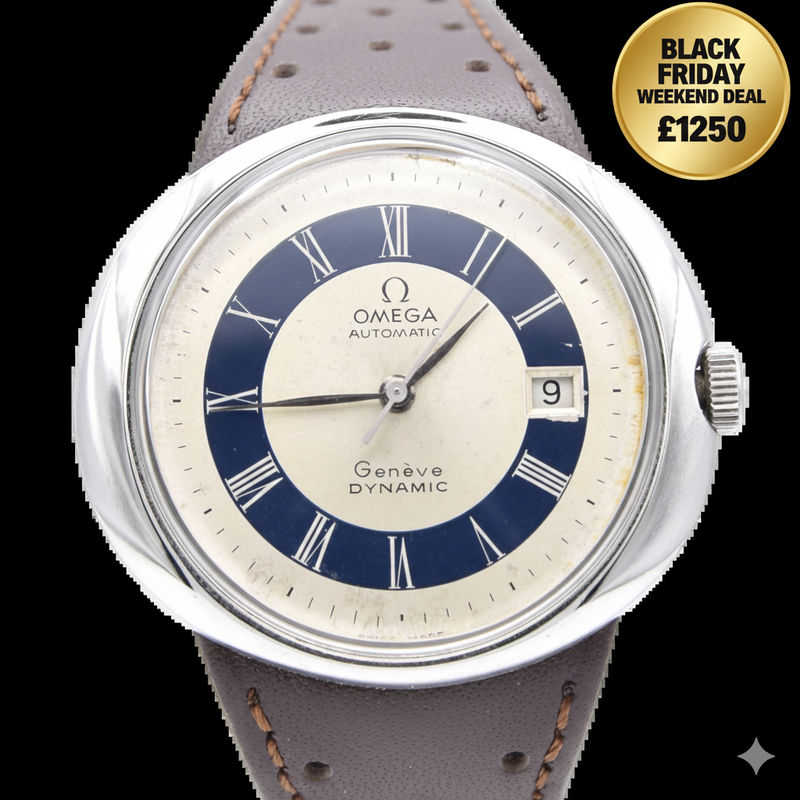 We have here one of our favourite Omegas from the late 1960s/1970s - the Dynamic! The original two-tone, bullseye Tuxedo Roman dial has a white outer minute track with slim, painted, white Roman numerals markers that run around the inner blue ring. At 3 o'clock is the unusual, date function, With the original omega glass with emblem on the crystal. At the centre of the dial are the chrome sword type hour and minute hands, which are nicely complemented by the chrome central seconds hand. This watch in our opinion is one of the rarely seen dial variations making the usually sporty Dynamic more dressy.