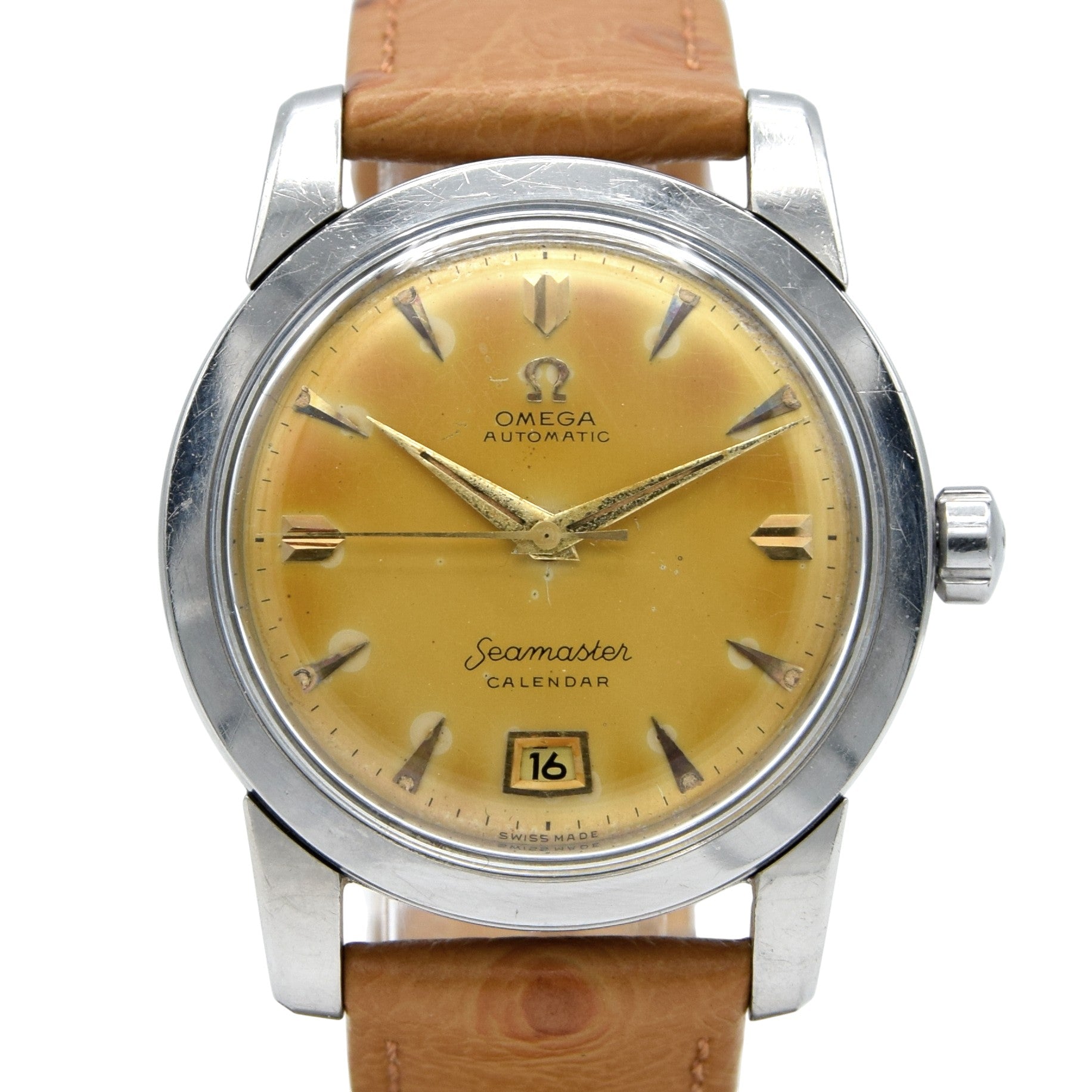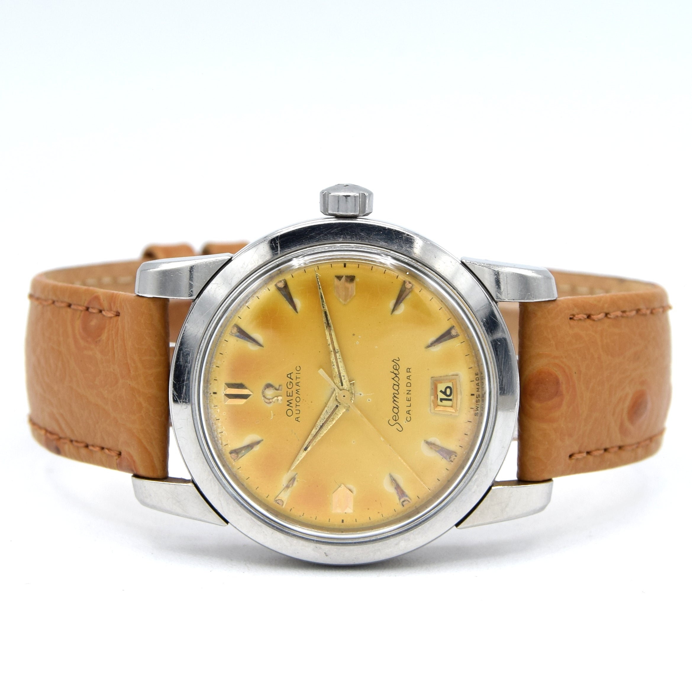 We have here a stunning Omega Seamaster 2757 from 1952 and one of the first seamasters with the date function. The Striking original dial is the first thing to hit you on this 1952 Omega Seamaster Calendar (Ref. 2757) and exhibits a striking and "honest" patina that tells the story of over 70 years of life. For a watch of this era—specifically one of the very first automatic calendars Omega produced—this level of aging is highly characteristic and often sought after by collectors for its unique character. The original finish (likely an eggshell or silvered dial) has matured into a deep, warm honey or mustard-yellow hue. This transition is often caused by the aging of the protective nitrocellulose lacquer when exposed to UV light and ambient humidity. It gives the watch a "sun-baked" aesthetic that is far more vibrant than a standard silver dial.The date function sits at 3 o'clock and is outlined with a window. The baton markers are differentiated at 12, 6 and 9 o'clock to help make for an easy read. And even with the aged lume the sword-type, Gilt hour, minute and central seconds hands also contribute to this.