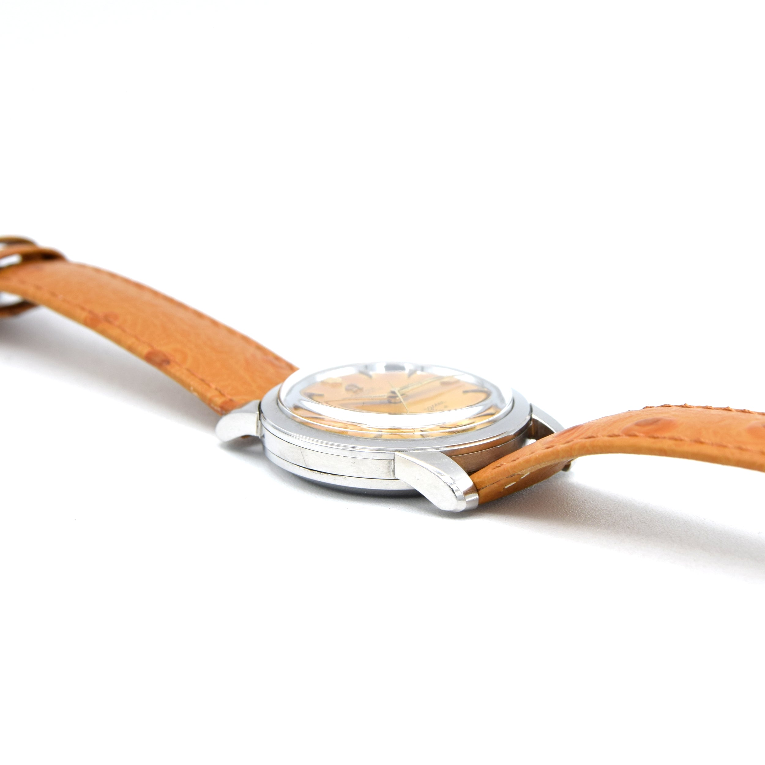 The 34.5mm, stainless steel, clip-on case has the pre & correct non hippocampus back and on this occasion we are leaving the case in its unpolished original condition as people are preferring this. It's got the original clover omega crown and a new glass! for the Inside, we have an unusual calendar system and Omega's automatic caliber 355 fully serviced by us and running strongly. We've paired the watch on a tan ostrich grain leather, stitch strap but it looks good on anything.