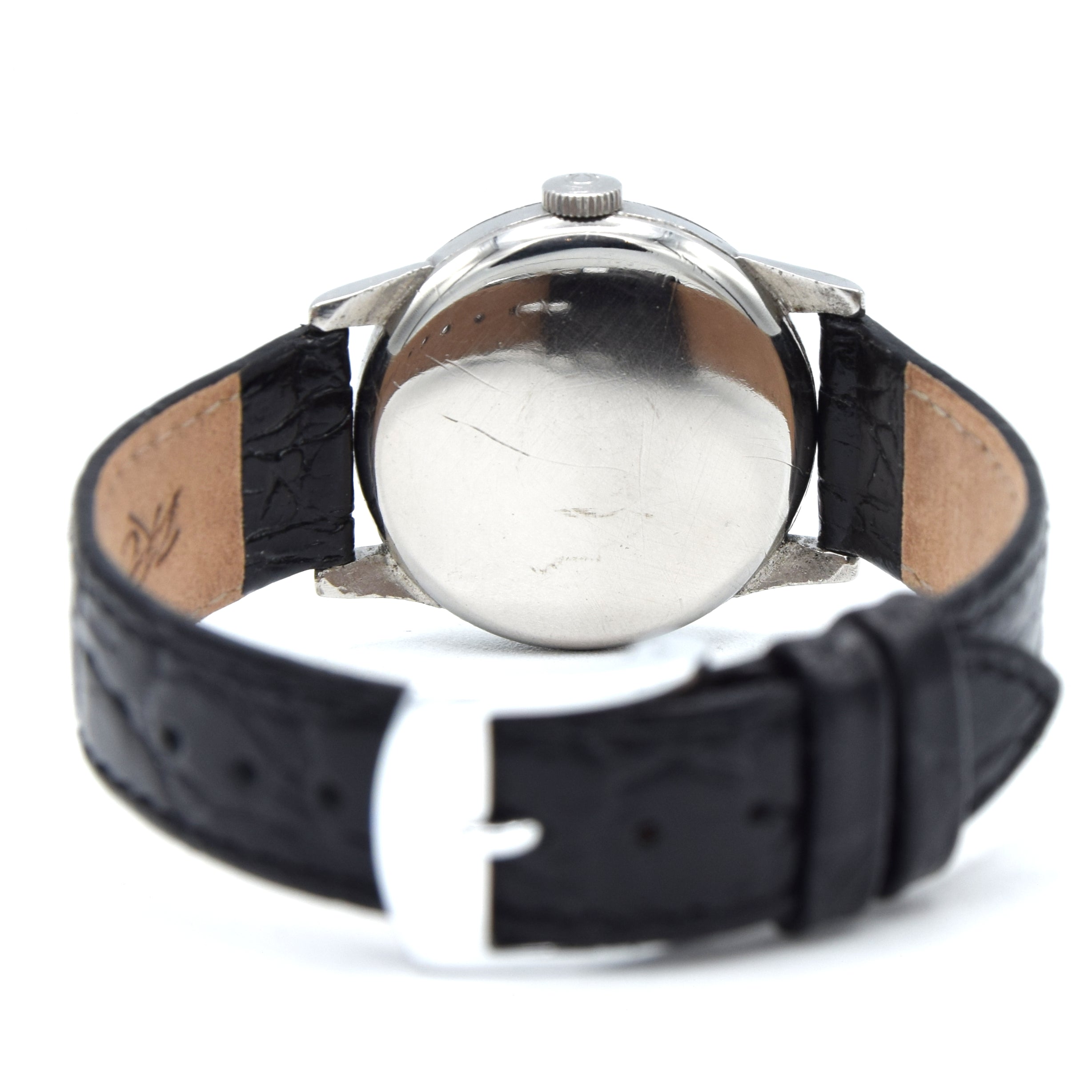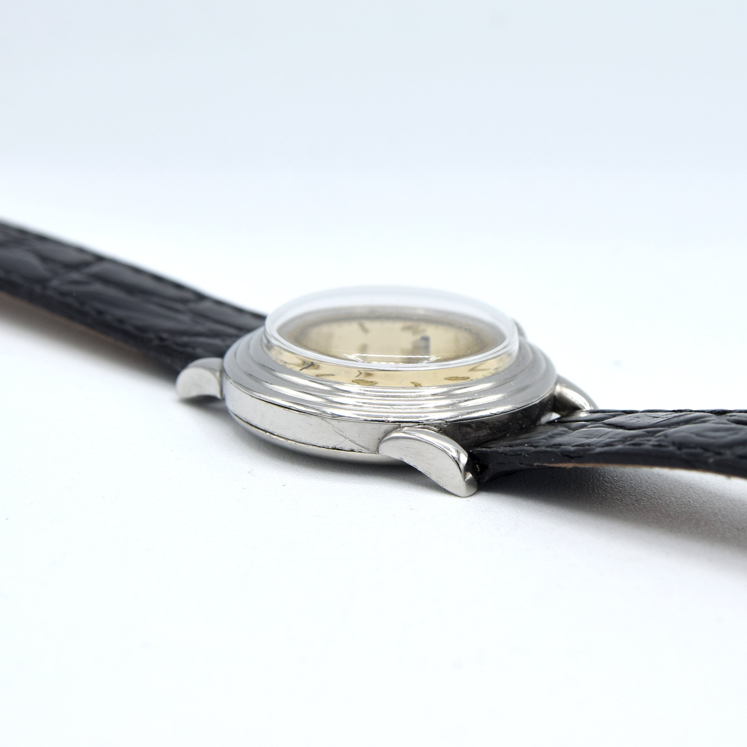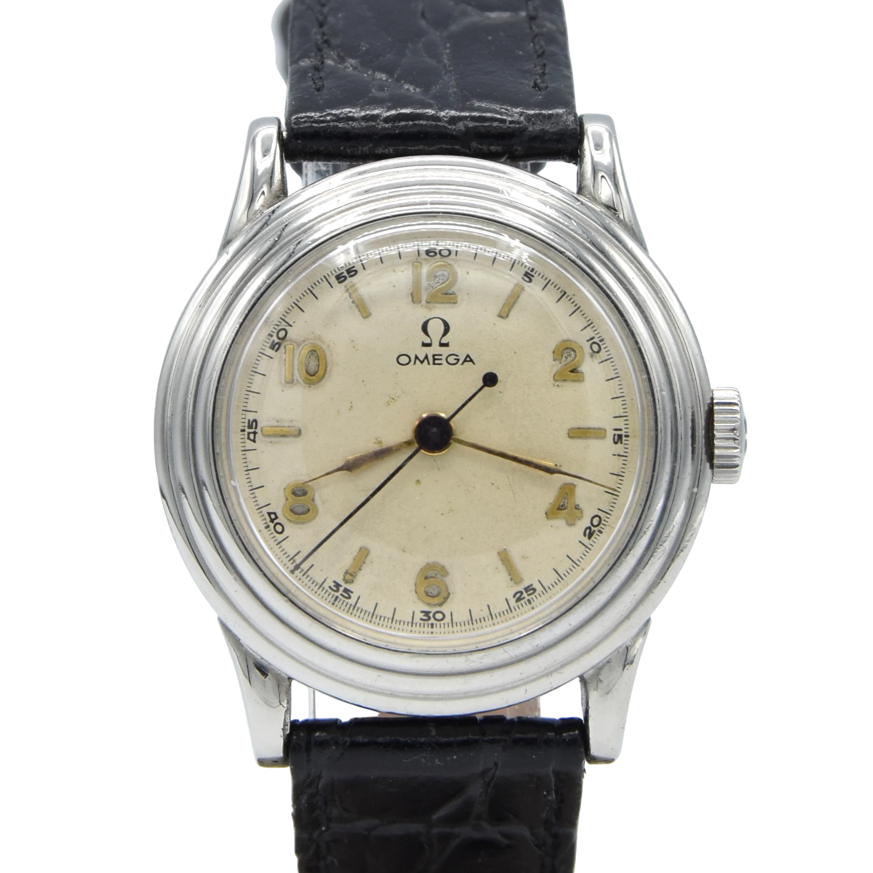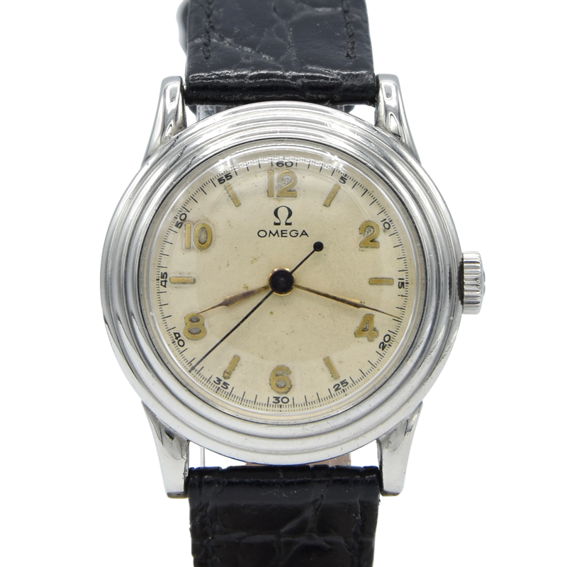 Housed in this unusual three piece - fully omega signed staybrite steel case, with a circular stepped ring bezel and slightly horned lugs . Fully serviced by us and running strongly. The same omega caliber 23.4sc movement was used in the 1940 British Air ministry Omega “Weems” RAF Mk VIIA Wristwatch 6b/159