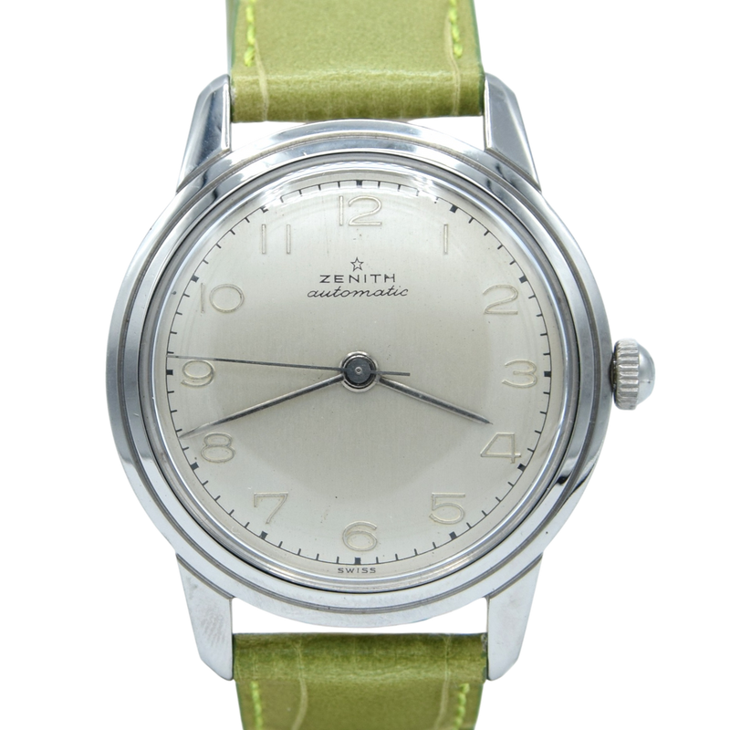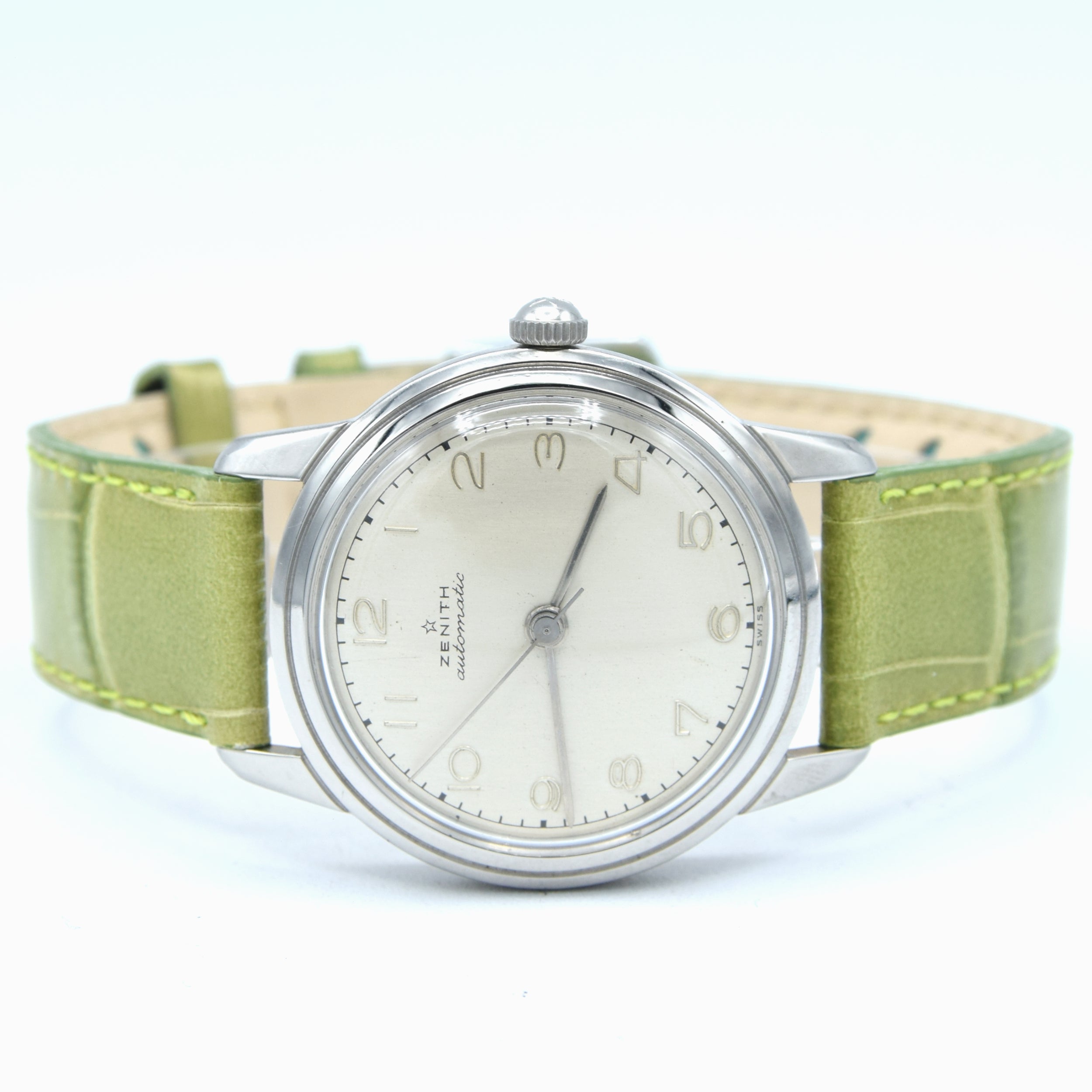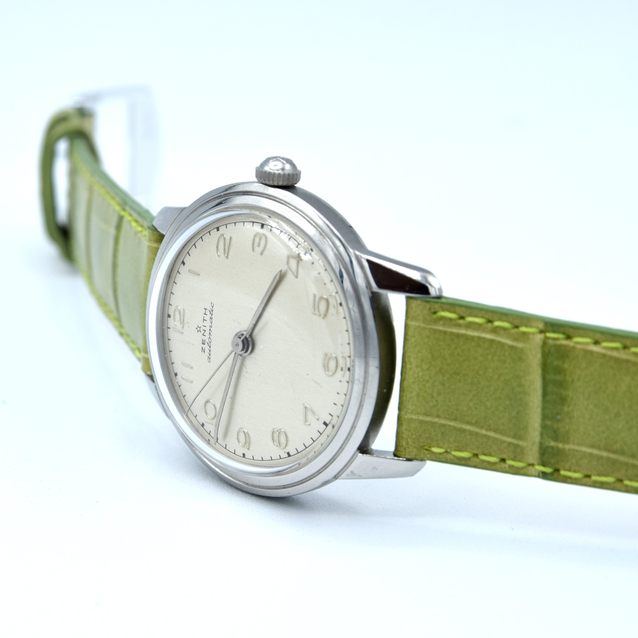 The watch is presented in a classic 35mm steel case and features a charming vintage aesthetic. A classic round stainless steel case, characteristic of dress watches from the late 1940s to early 1950s. Notice the attractive double circle banded bezel and slightly sculped lugs. The case back is of the snap-on type, Signed internally with "Acier Inoxydable" (French for stainless steel), "Zenith," and "Swiss Made". Also original star signed Zenith Crown.