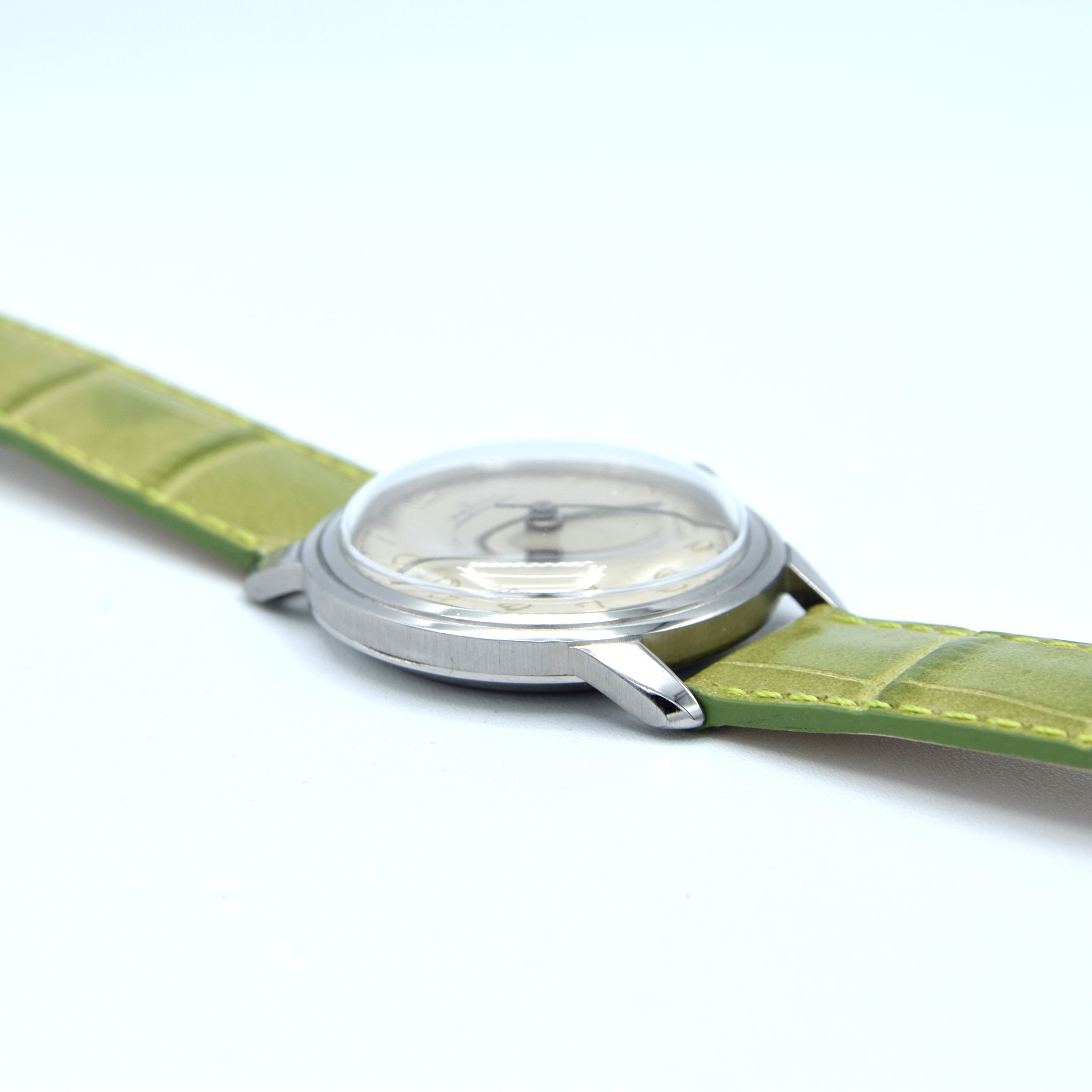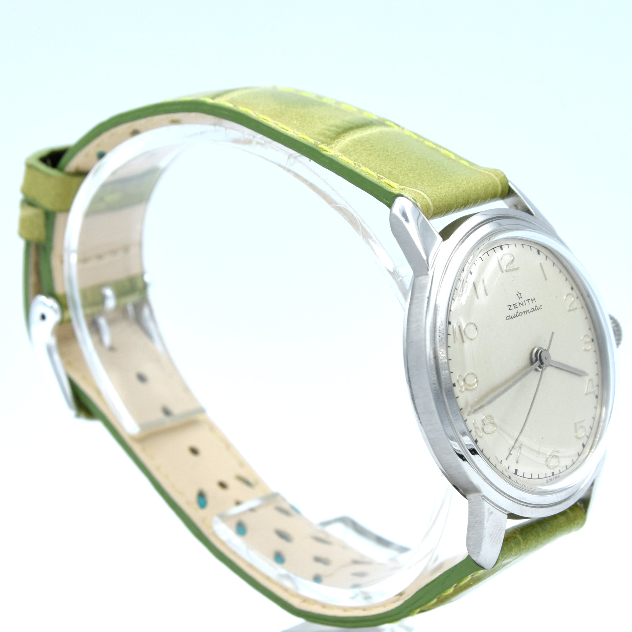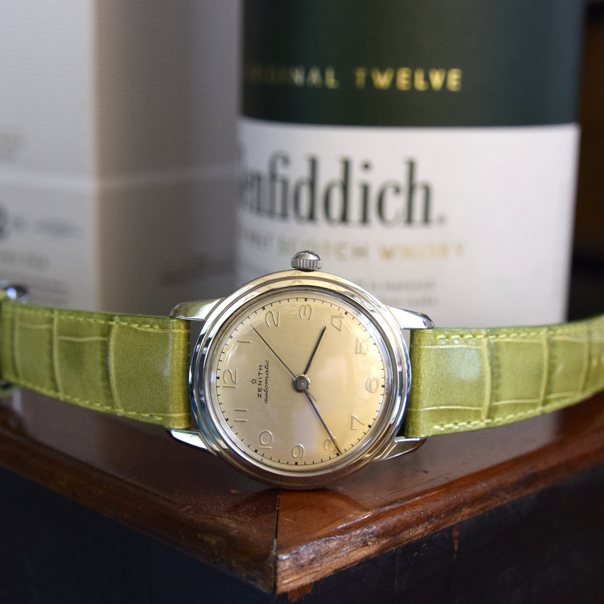 The watch is presented in a classic 35mm steel case and features a charming vintage aesthetic. A classic round stainless steel case, characteristic of dress watches from the late 1940s to early 1950s. Notice the attractive double circle banded bezel and slightly sculped lugs. The case back is of the snap-on type, Signed internally with "Acier Inoxydable" (French for stainless steel), "Zenith," and "Swiss Made". Also original star signed Zenith Crown.