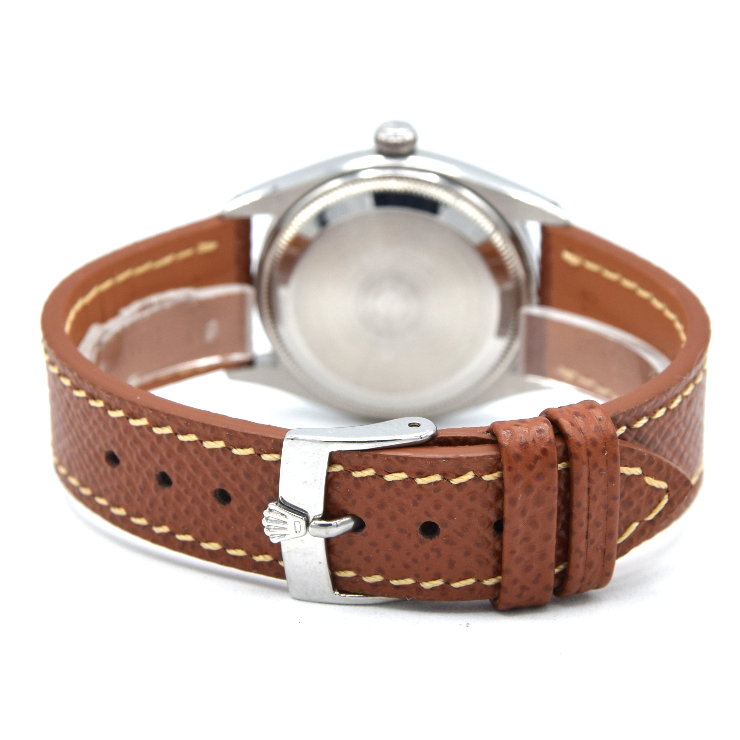 The 34.5mm, stainless steel, three-piece, Oyster case is a comfortable wear for both men and women. The watch has the signature Rolex Oyster, screw-down crown as well as a domed crystal and polished bezel, drawing your eyes into that amazing dial. Inside is the automatic Rolex caliber 1030, fully serviced by us and running strongly.