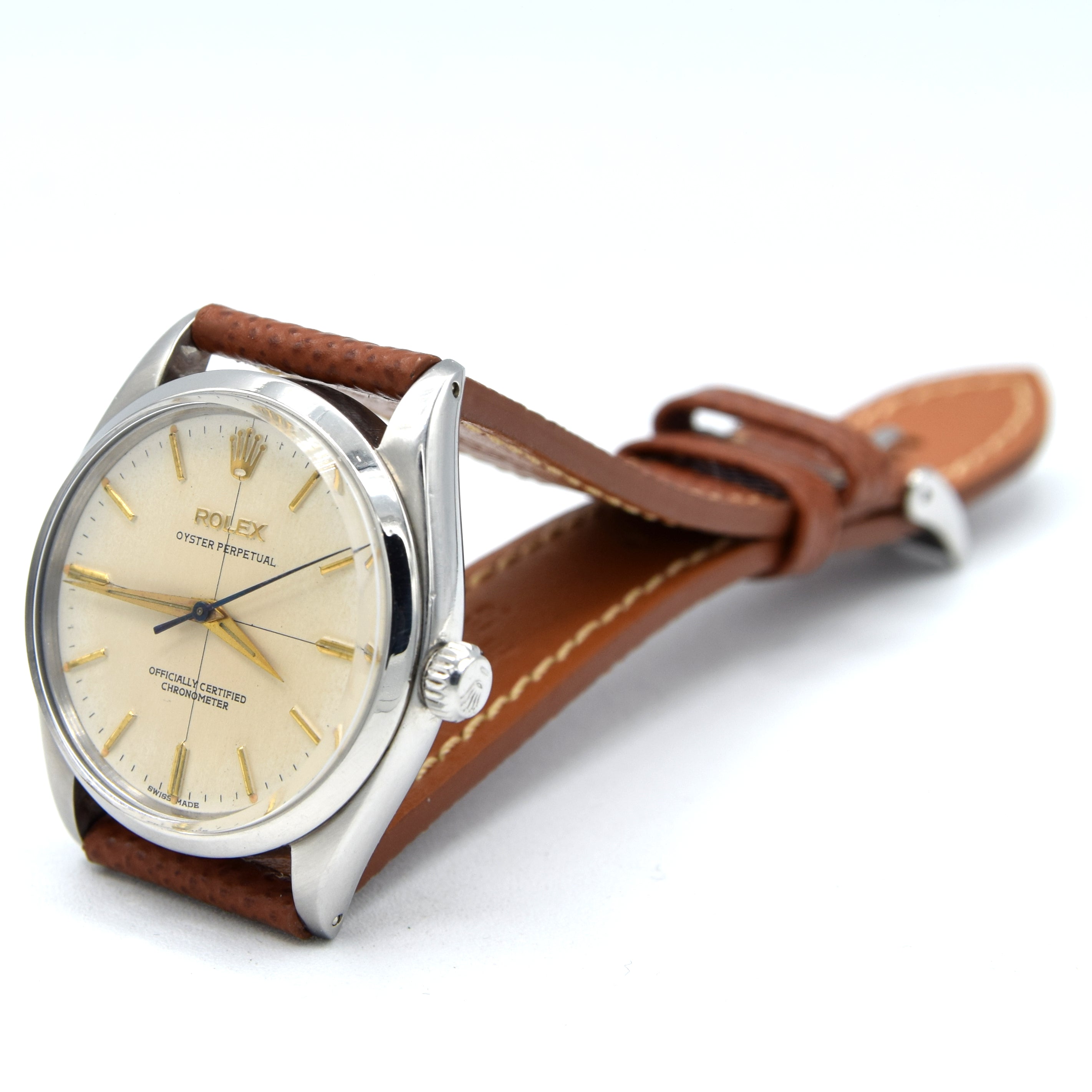 This is a stunningly presented 1959 Rolex Oyster Perpetual, Model 6564, housed in the timeless 34mm stainless steel Oyster case with a polished smooth bezel.