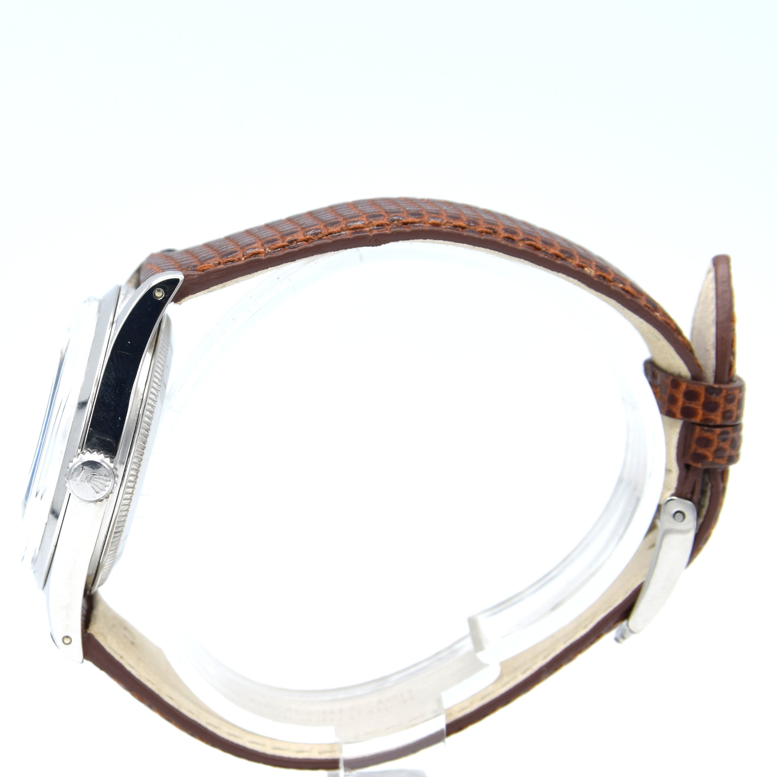 The 33mm, stainless steel, three-piece, Oyster case is a comfortable wear for both men and women. The watch has the signature Rolex Oyster, screw-down crown as well as a domed crystal and polished bezel, drawing your eyes into that amazing dial. Inside is the automatic Rolex caliber 1030, fully serviced by us and running strongly.