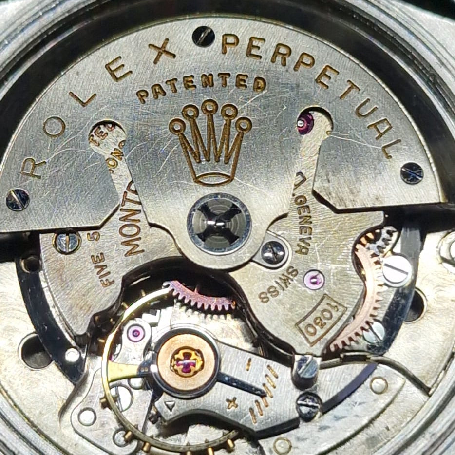 Powering this timepiece is the famous Rolex Calibre 1030. Introduced in 1950, the 1030 was a landmark movement for Rolex—it was their first complete in-house calibre and featured the "Butterfly" rotor, a bi-directional winding mechanism that set the standard for automatic watches.