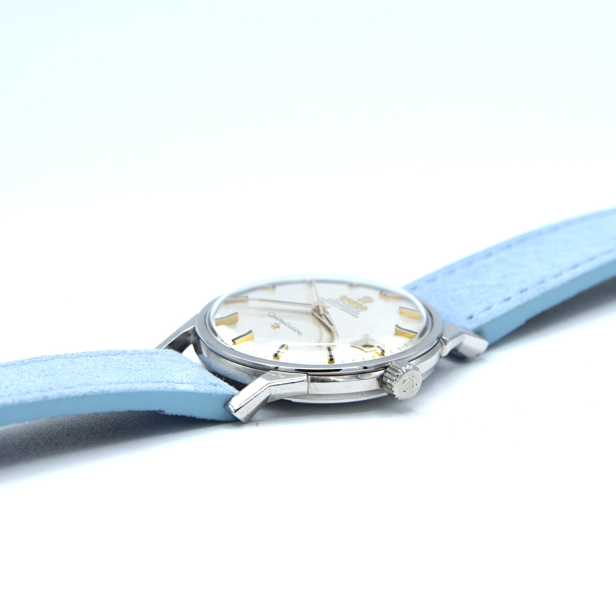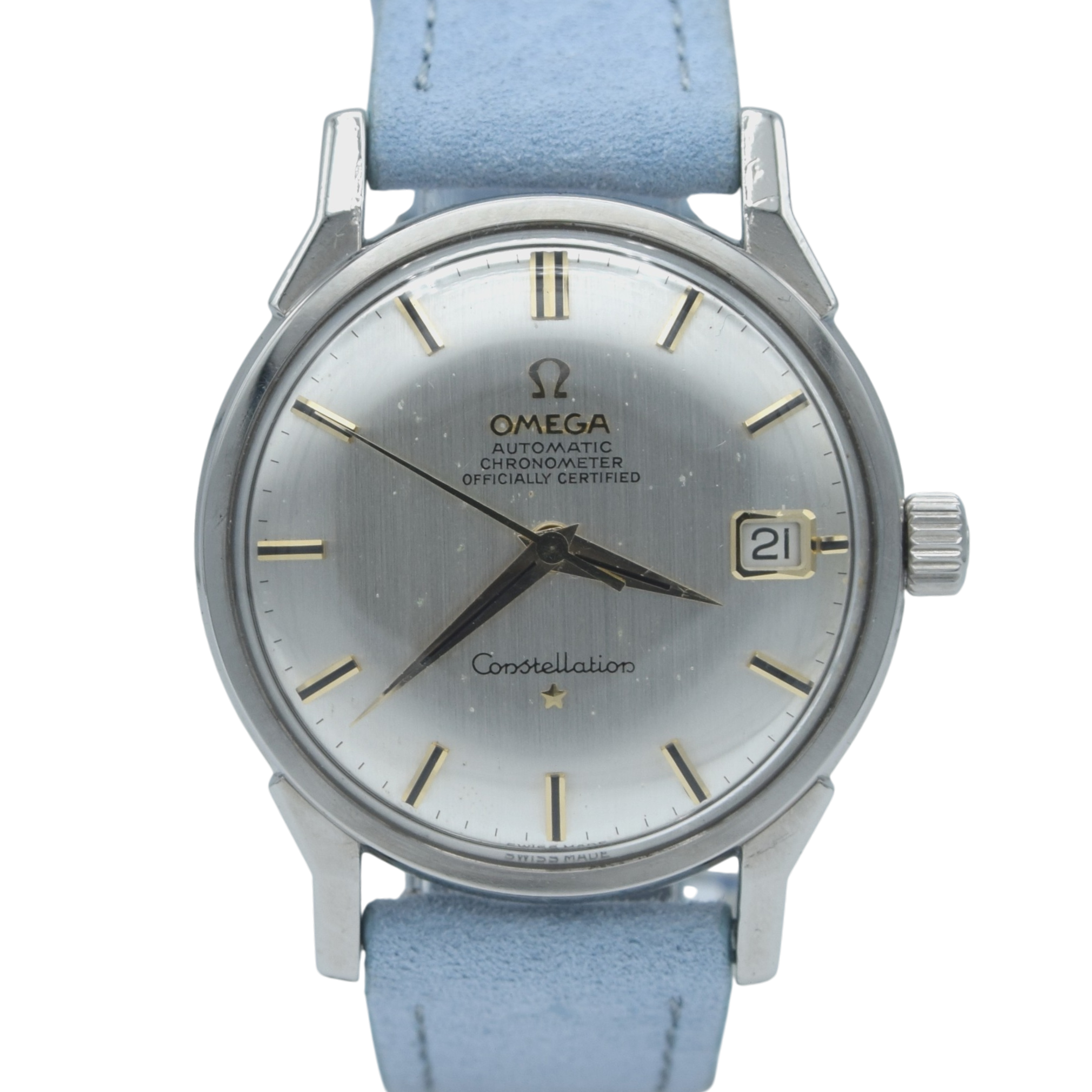 We have here a classic 1960s Omega Constellation, model 168.005, with a stunning, original, Satin silvered dial and elegant onyx filled baton markers and double markers at 12, 6 and 9 o'clock. Some age spots are present on the dial but this doesnt detract in our opinion and just confirms its vinateg .This is the model with the date function (the non-date is 167.005), which sits at 3 o'clock. The dial is signed 'Omega, Automatic, Chronometer, Officially Certified,' with the famous Omega logo at 12 o'clock and 'Constellation,' with the Connie's star emblem at 6.There are rumours that Gerald Genta designed these Omega Constellation Dog Leg models and we love how angular they are. They complement the sleek and simple nature of the Constellation. The chronometer-tested caliber 561 sits in the stainless steel, screw-back case, which features the signature Constellation logo (the Geneva observatory) on the case back. Fully serviced by our on-site workshop, our watchmakers usually obtain a better amplitude and higher performance than our non-chronometer watches. We've paired the watch on a more modern trend blue suede strap to dress it up but it looks great on anything.