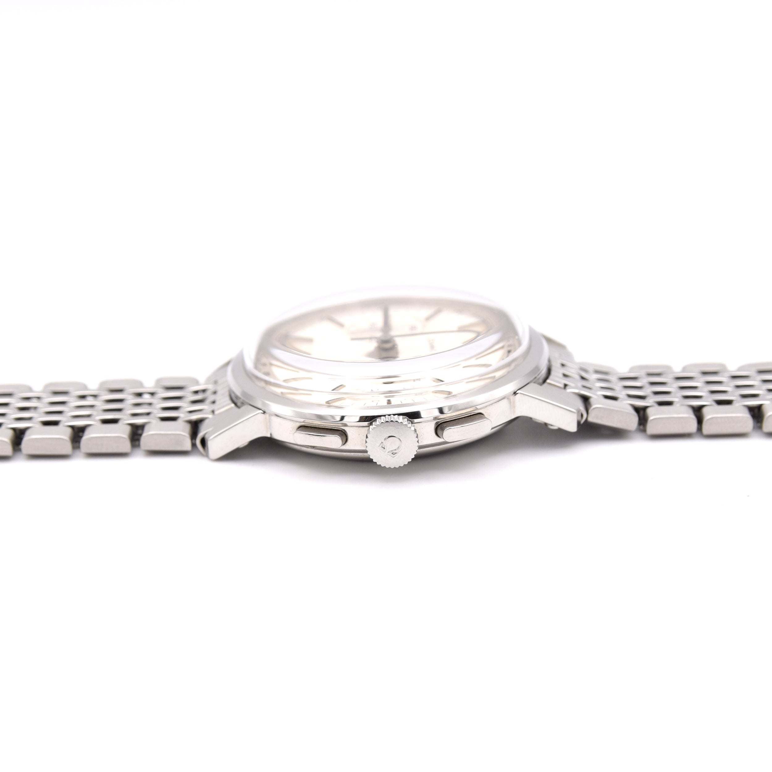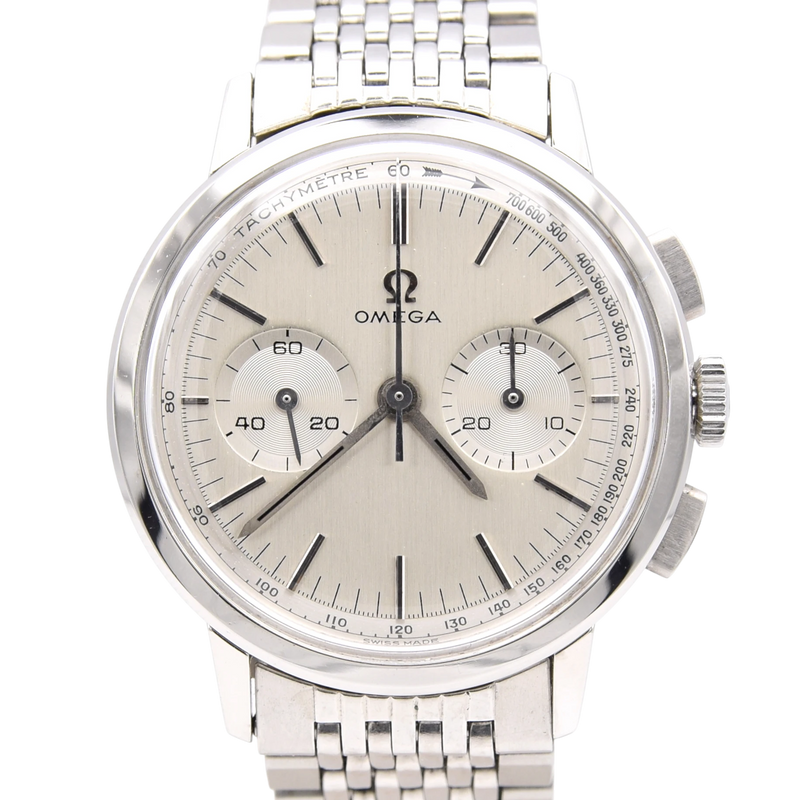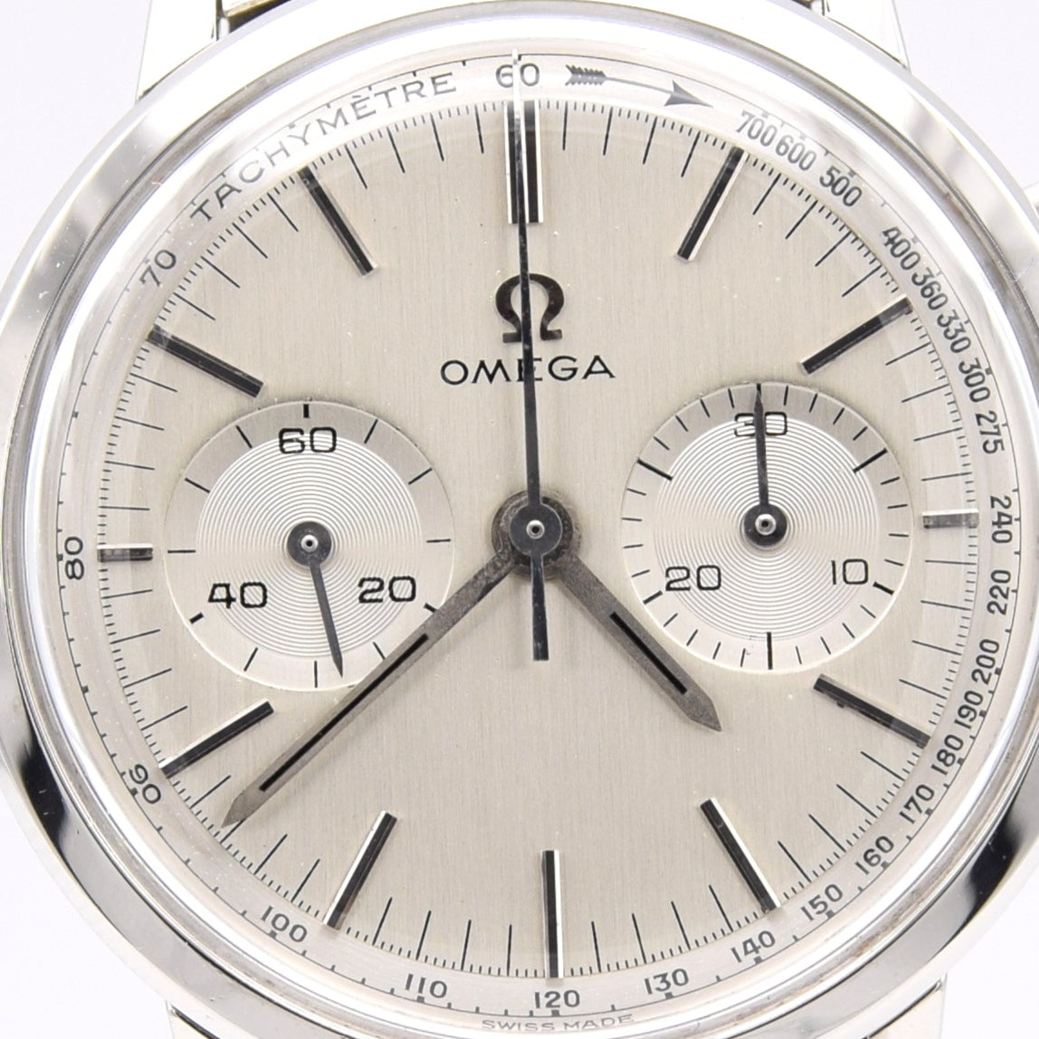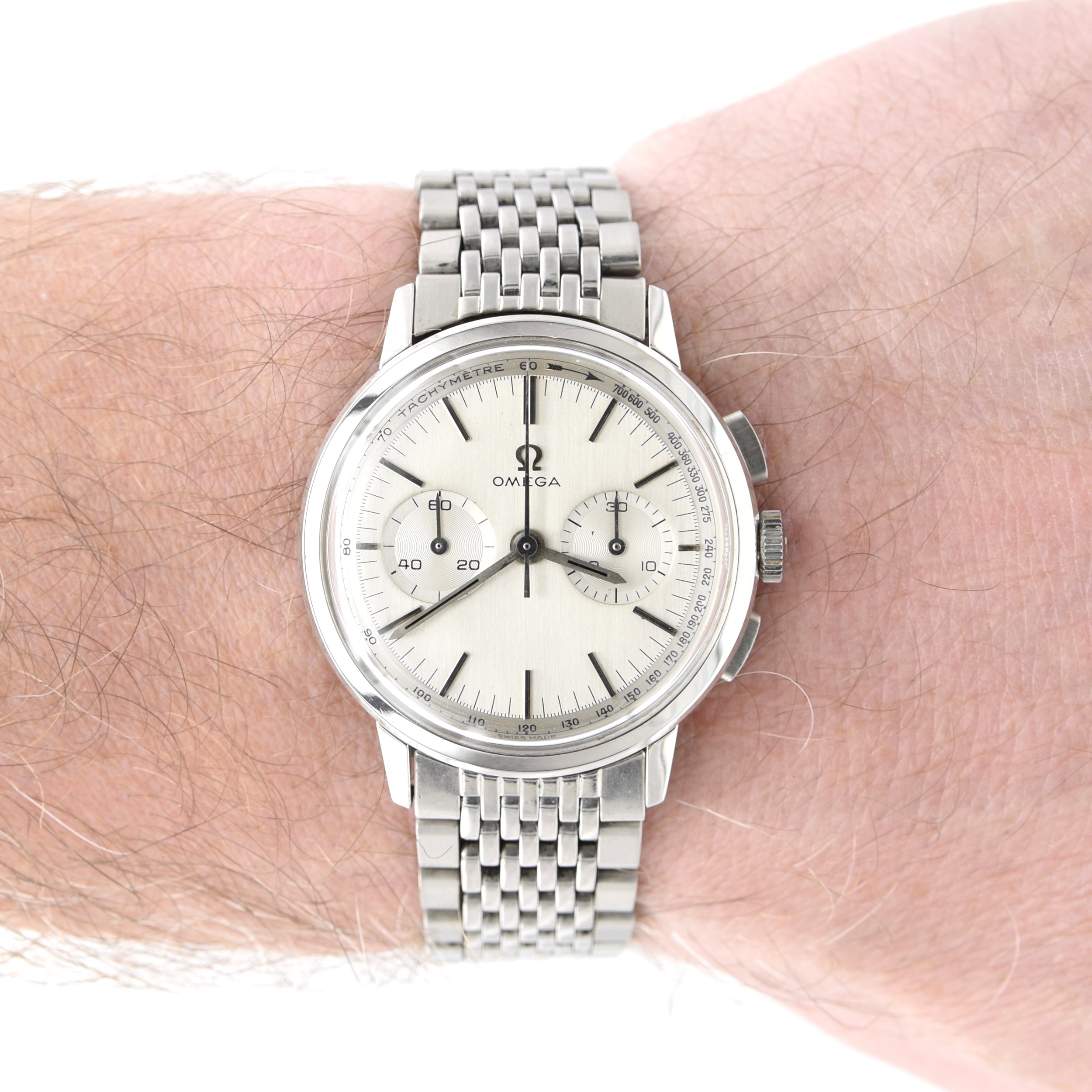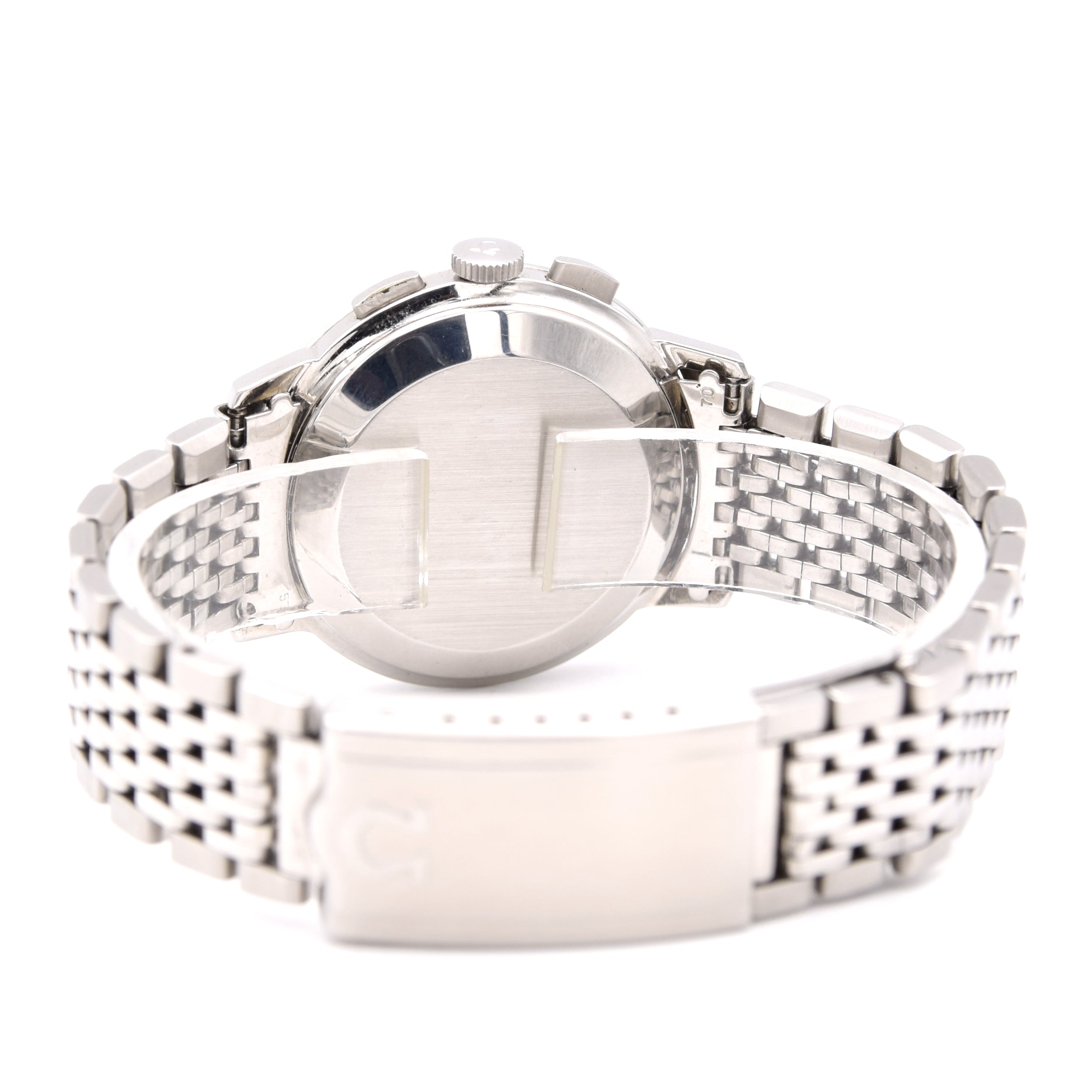 Dial & Hands: Totally original and in superfine sharp condition .This omega timepiece showcases an attractive silver-colored (or white) dial with a two-register chronograph layout. Minimalist and symmetrical with applied omega Sign and Tachymetric outer scale .
