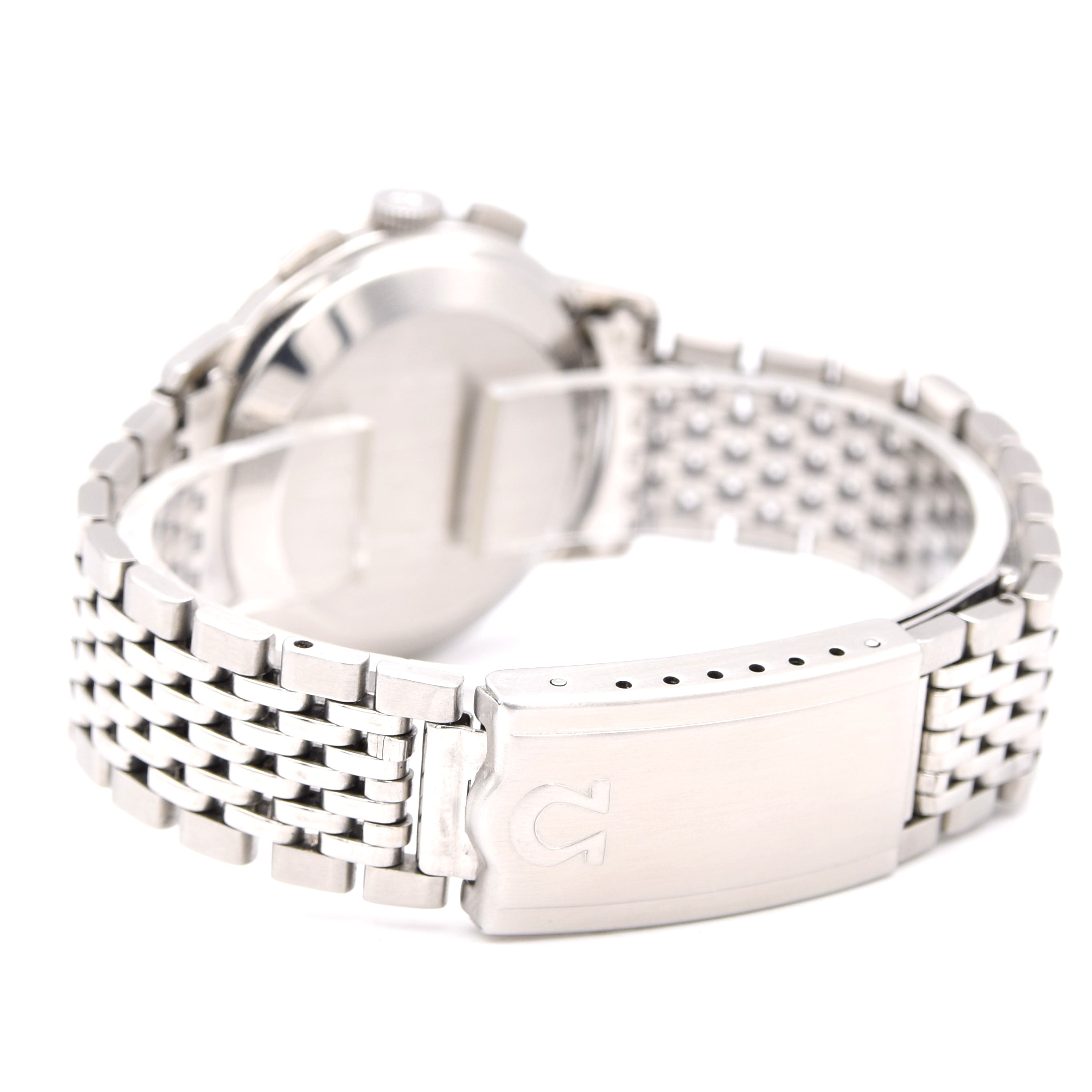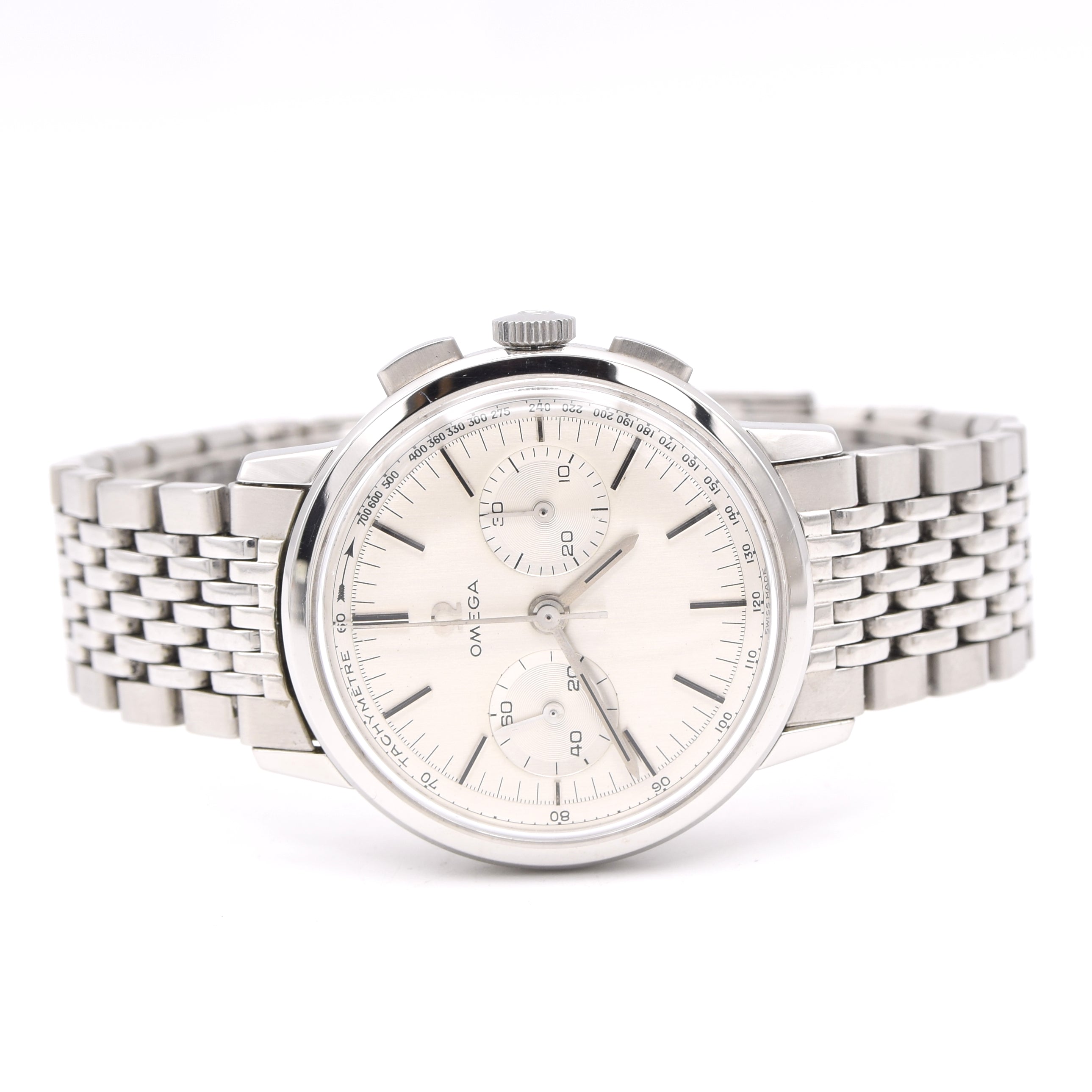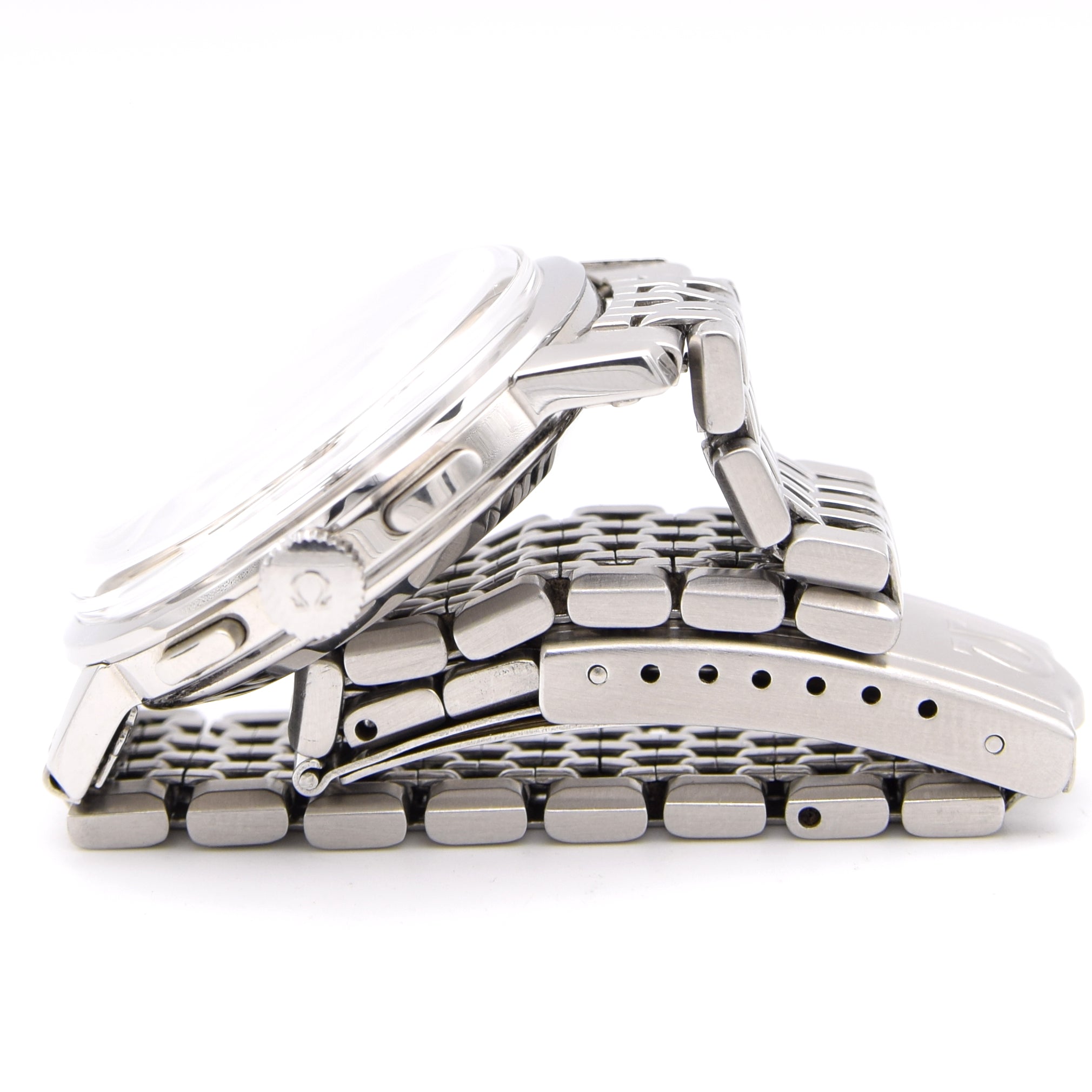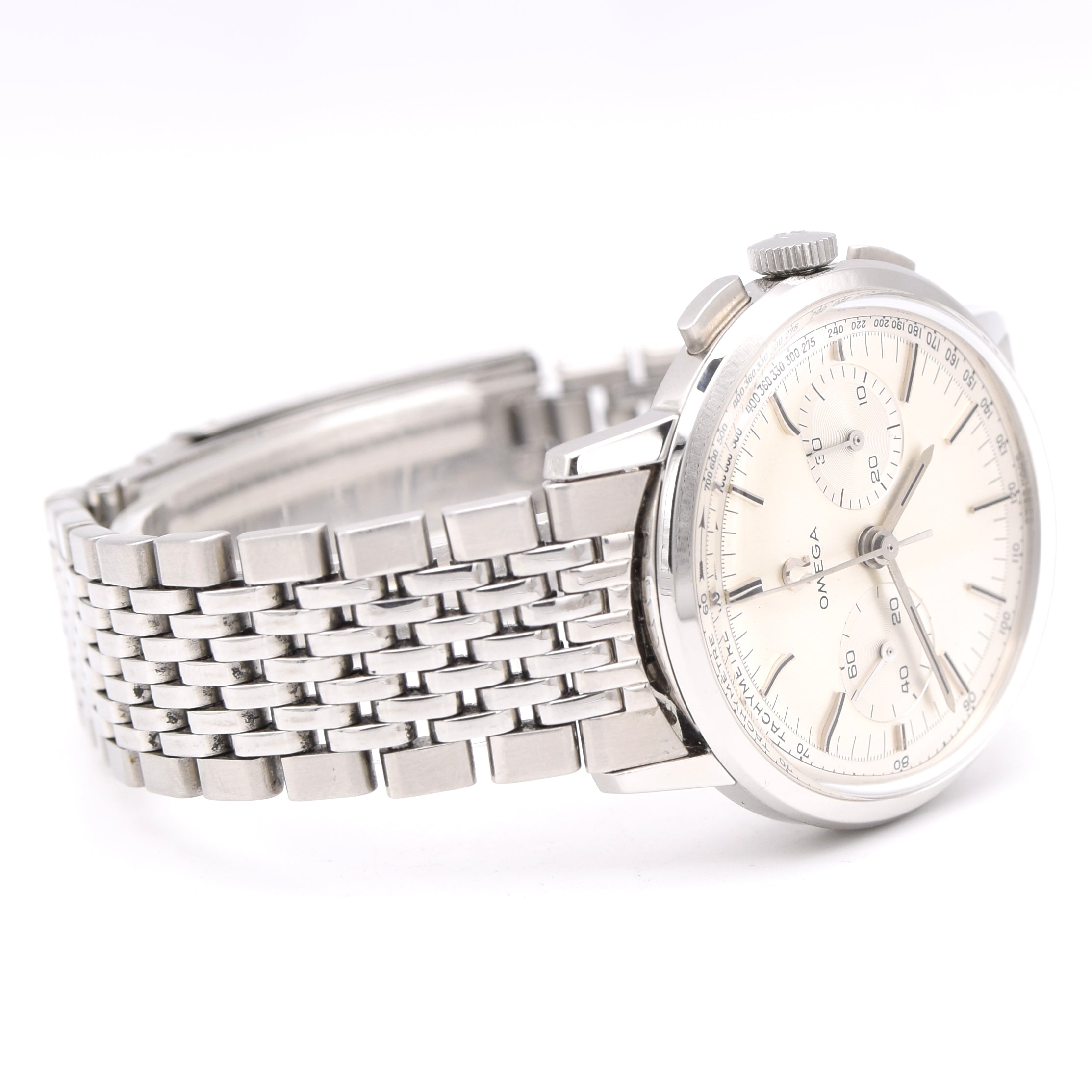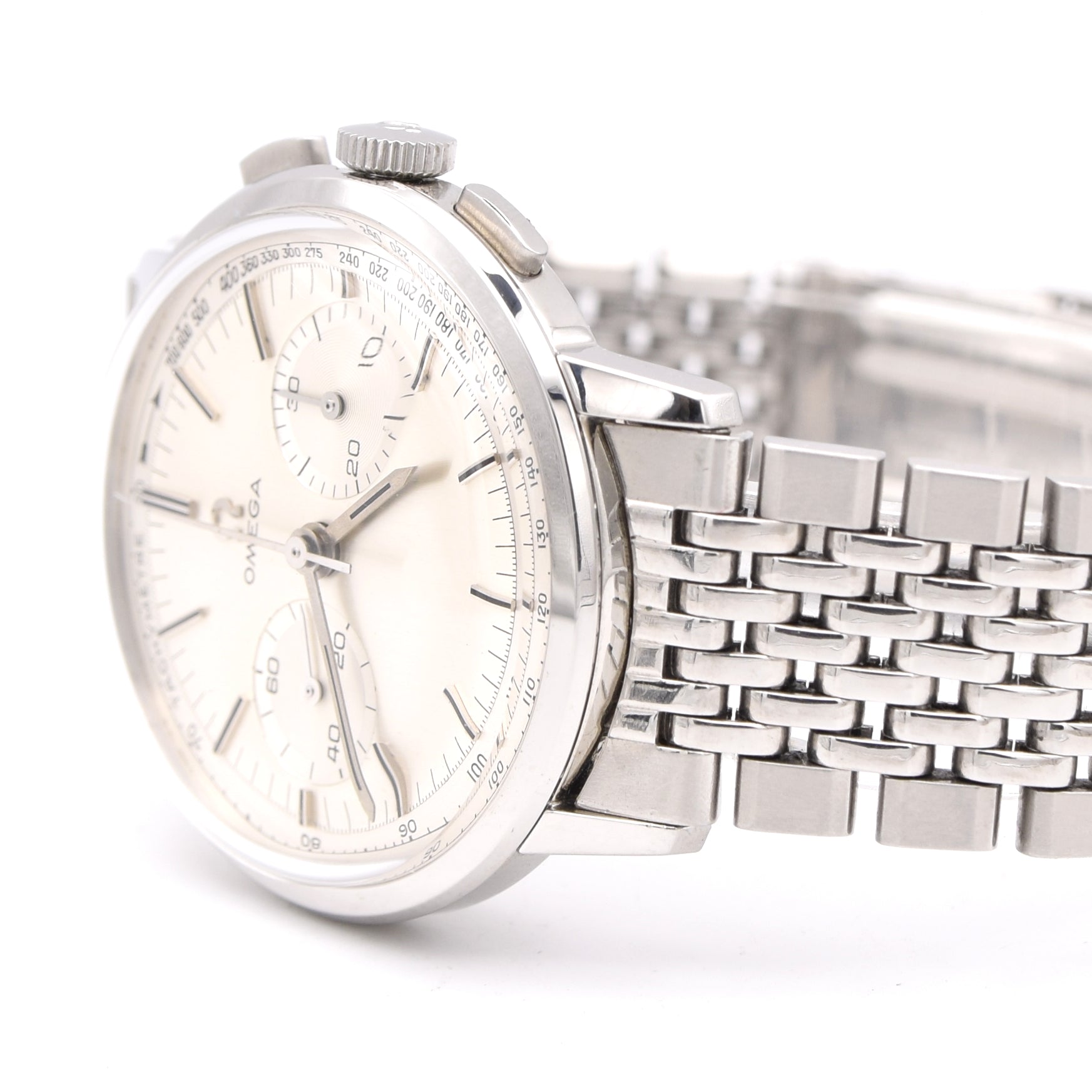 Dial & Hands: Totally original and in superfine sharp condition .This omega timepiece showcases an attractive silver-colored (or white) dial with a two-register chronograph layout. Minimalist and symmetrical with applied omega Sign and Tachymetric outer scale .
