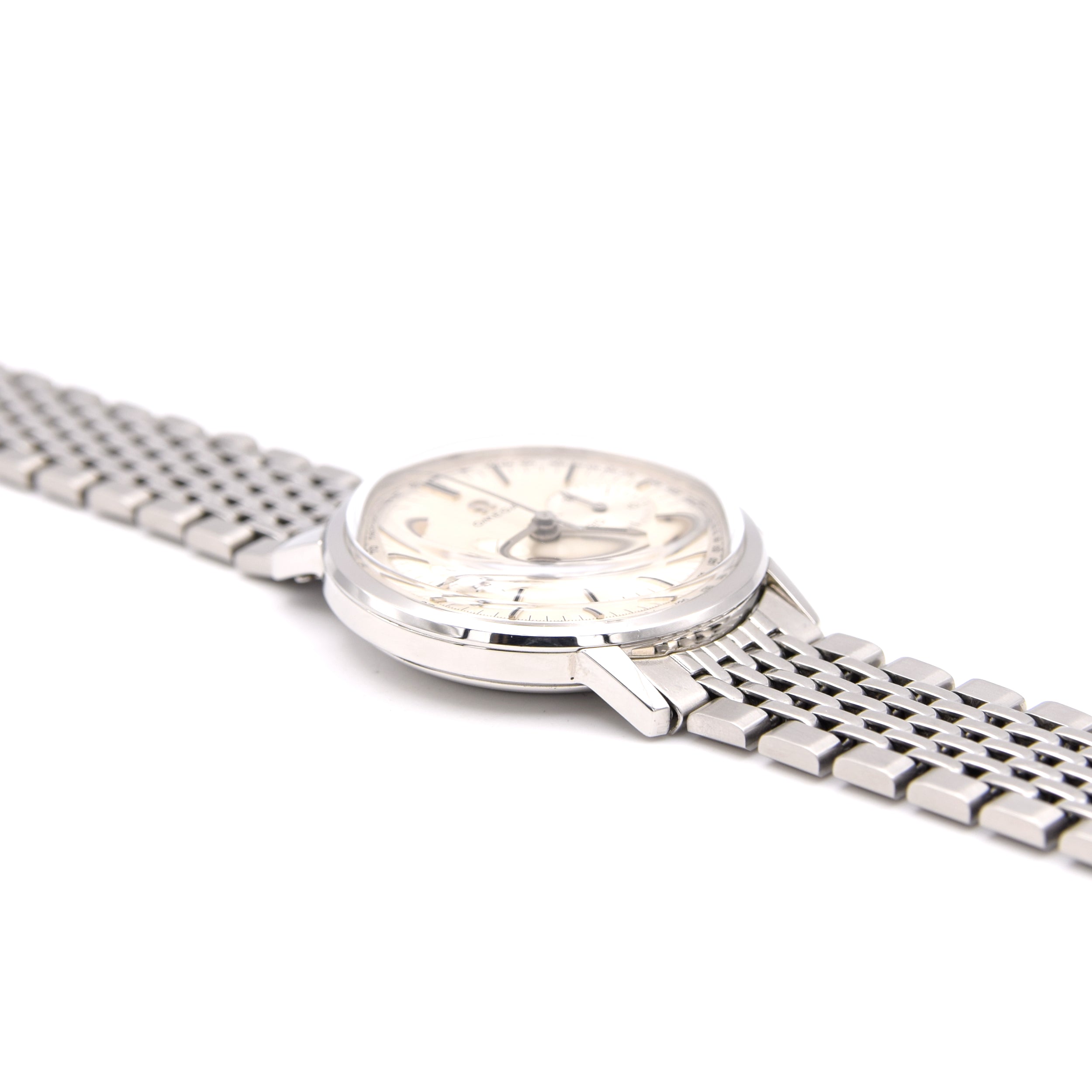 The case diameter is 35 mm (excluding the crown), a classic and modest size for the era that still commands a substantial wrist presence. Especially on the flat grain of rice link omega