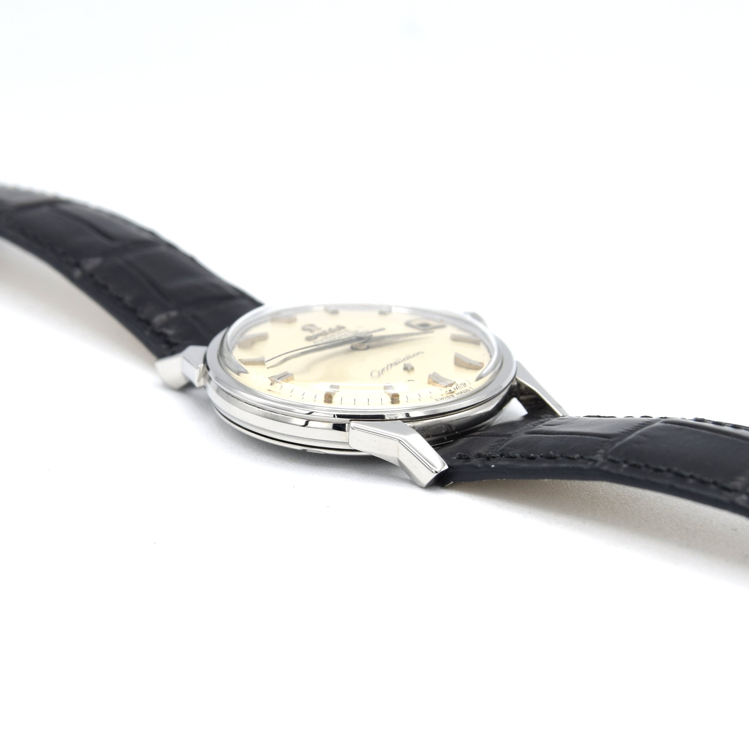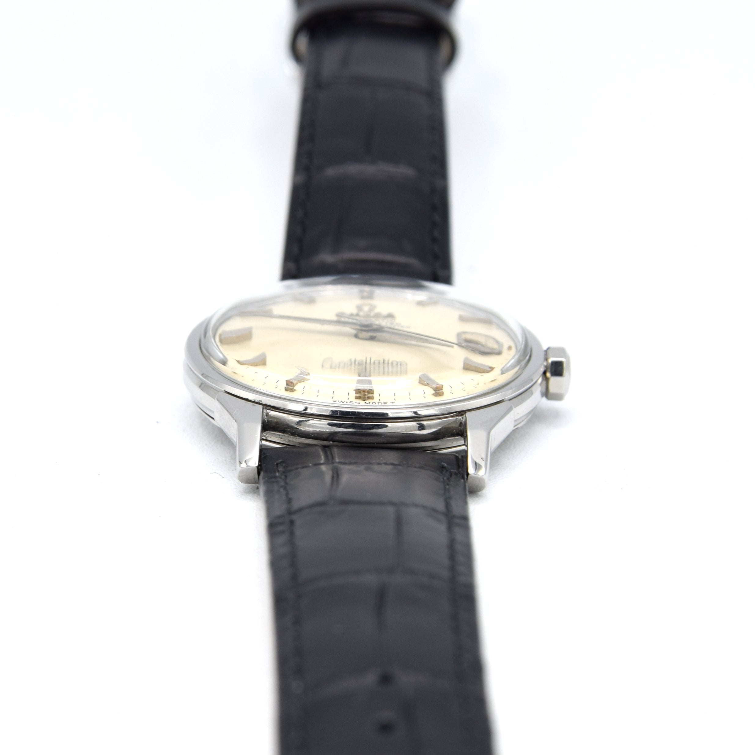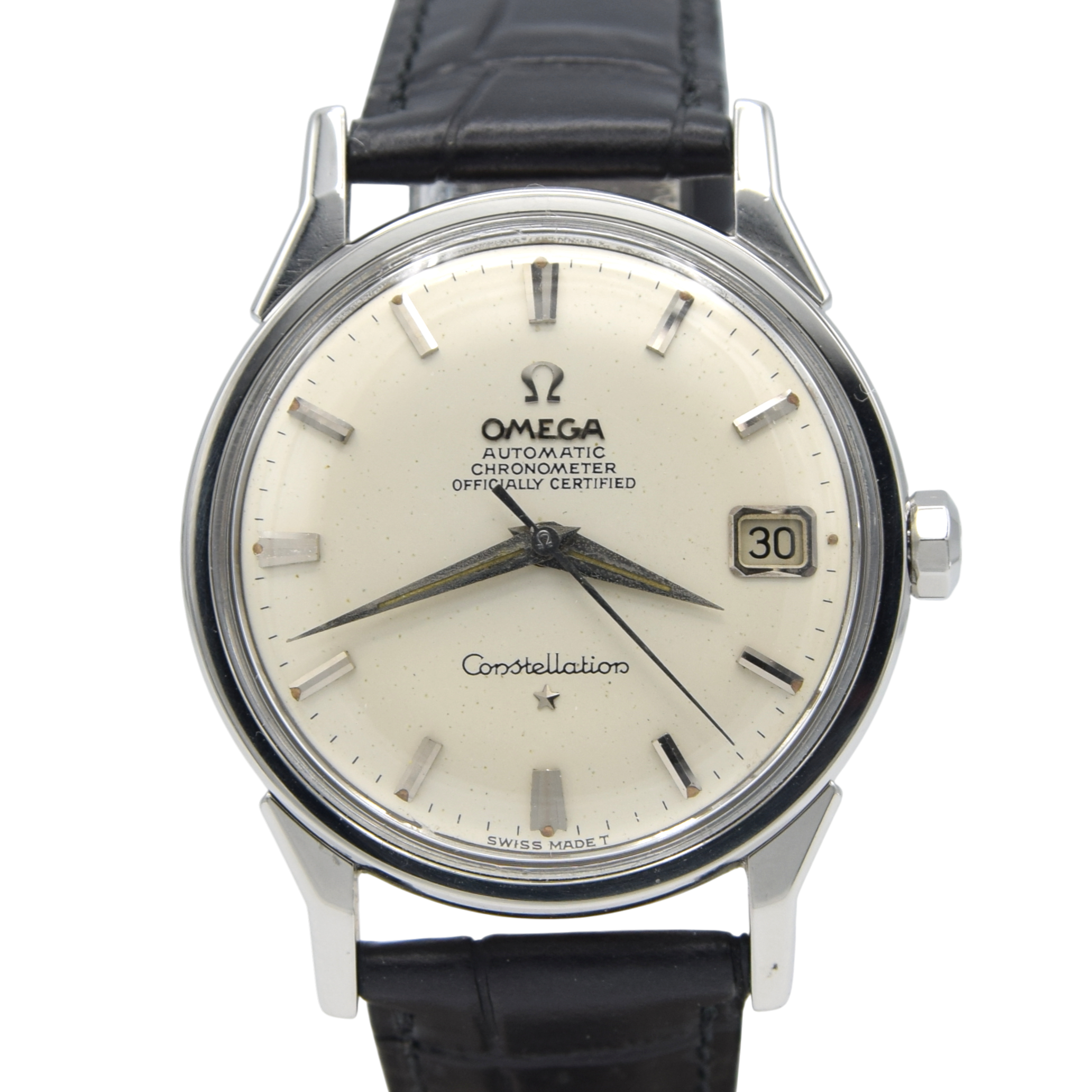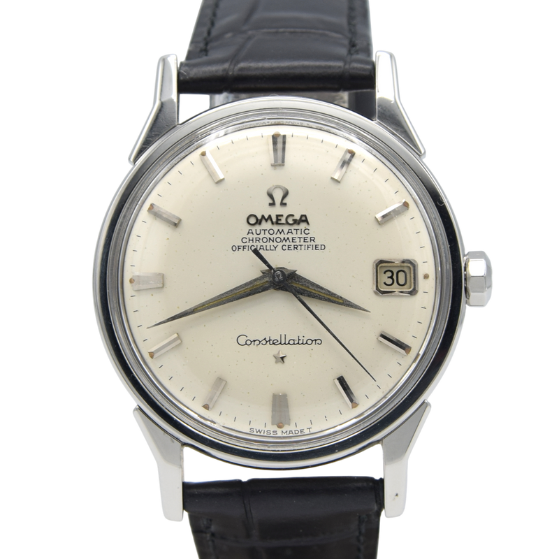 We have here a classic 1960s Omega Constellation, model 168.005, with a stunning, original, silvered dial and elegant baton markers and double markers at 12, 6 and 9 o'clock. The dial shows some even spotting confirming its character and originality. This is the model with the date function (the non-date is 167.005), which sits at 3 o'clock. The dial is signed 'Omega, Automatic, Chronometer, Officially Certified,' with the famous Omega logo at 12 o'clock and 'Constellation,' with the Connie's star emblem at 6.There are rumours that Gerald Genta designed these Omega Constellation Dog Leg models and we love how angular they are. They complement the sleek and simple nature of the Constellation. The chronometer-tested caliber 561 sits in the stainless steel, screw-back case, which features the signature Constellation logo (the Geneva observatory) on the case back. Fully serviced by our on-site workshop, our watchmakers usually obtain a better amplitude and higher performance than our non-chronometer watches. We've paired the watch on a black leather strap to dress it up but it looks great on anything.
