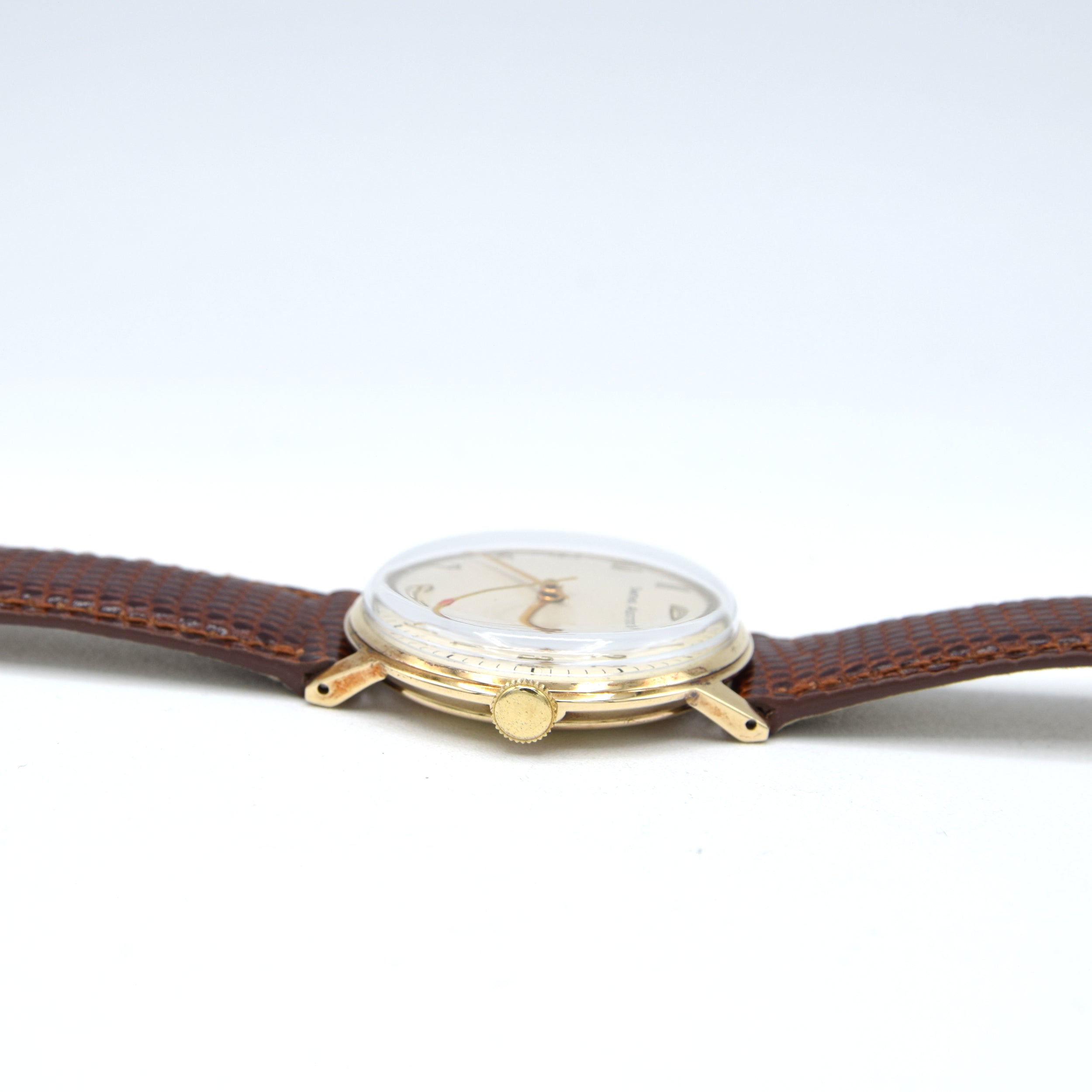 The watch features a notably attractive cream-white dial that has aged gracefully. The dial’s most distinctive feature is the full set of applied Arabic numerals (1 through 12), which are gold-toned and catch the light beautifully, giving the watch a clear, classic, and highly legible appearance. The delicate minute track and subtle red-tipped seconds hand complete the elegant design.