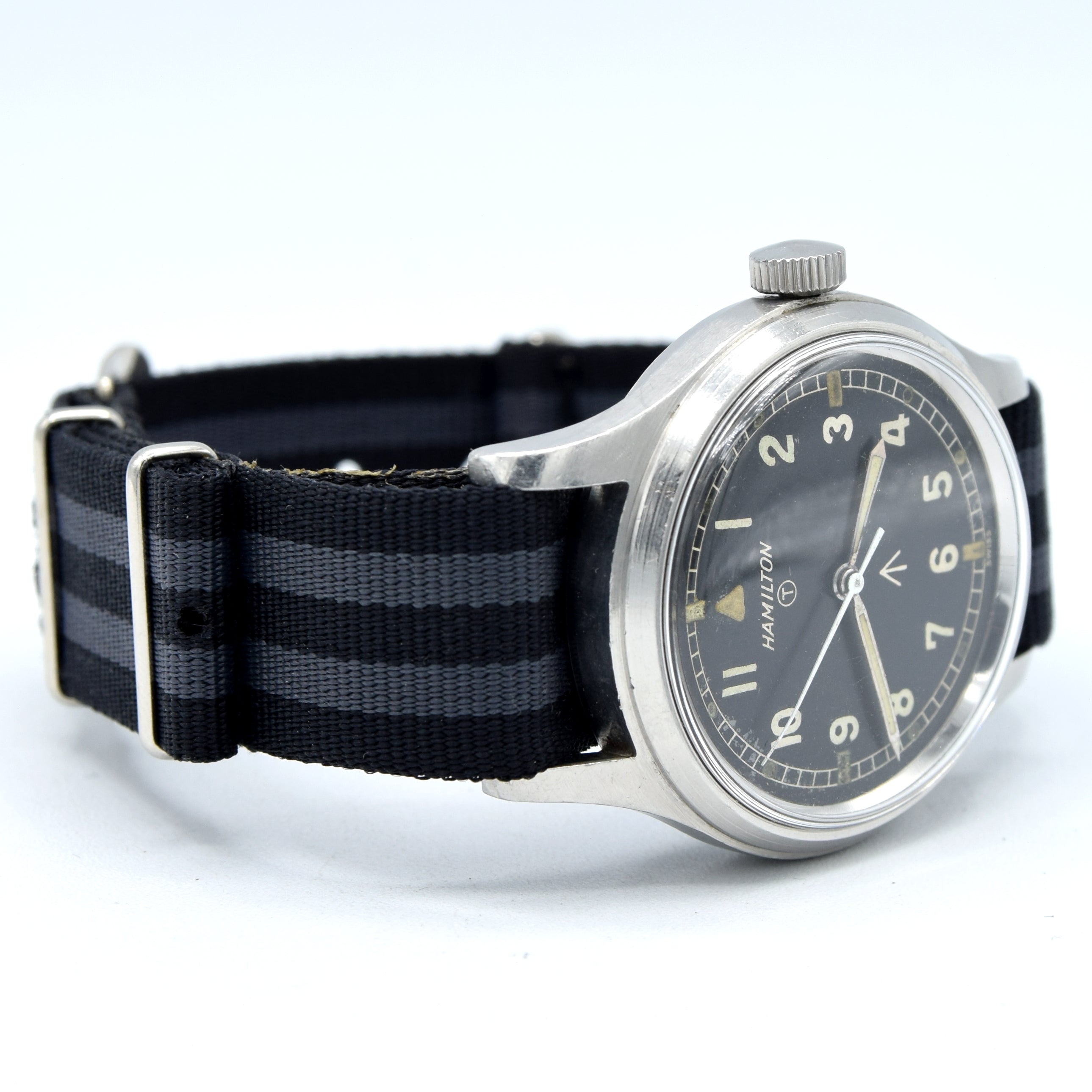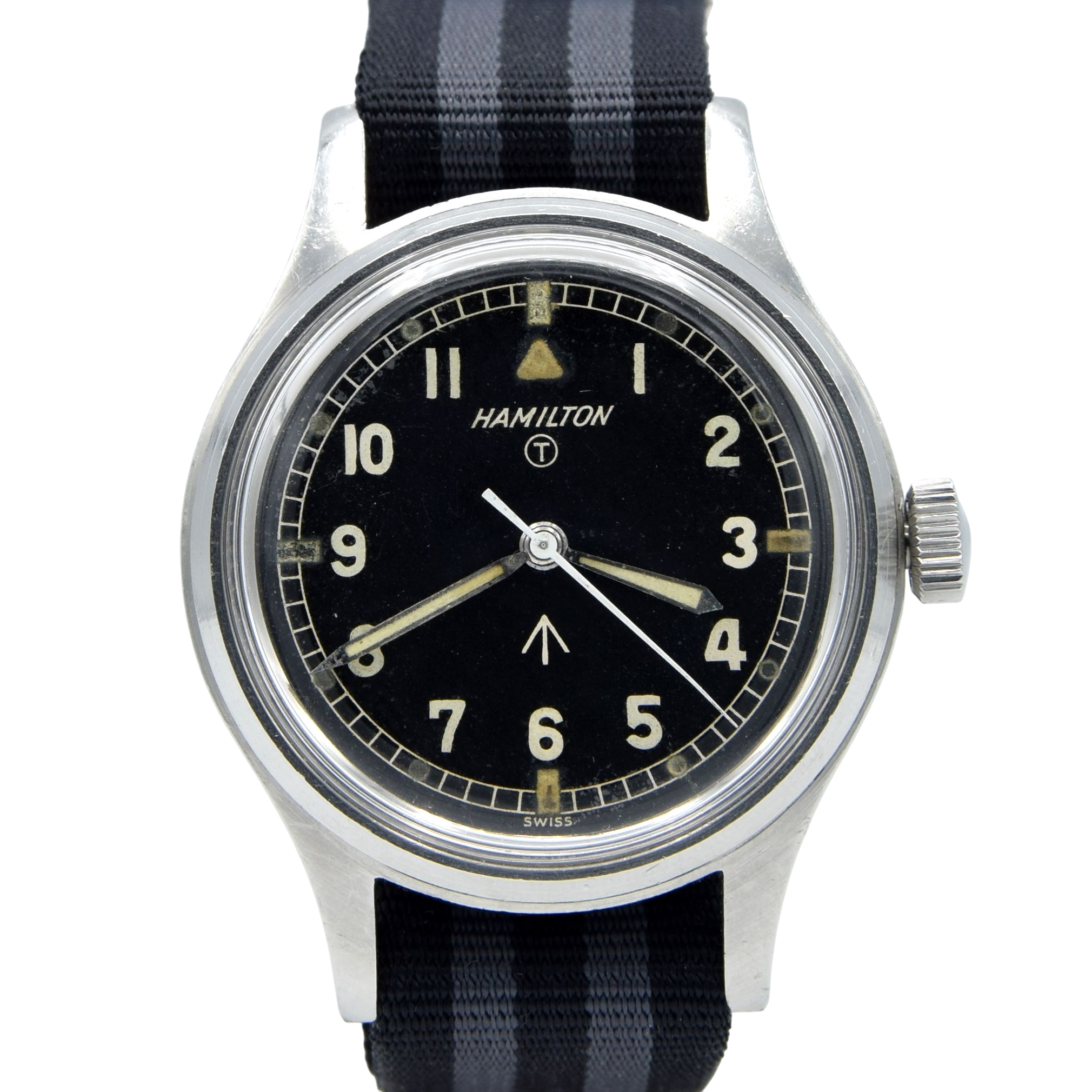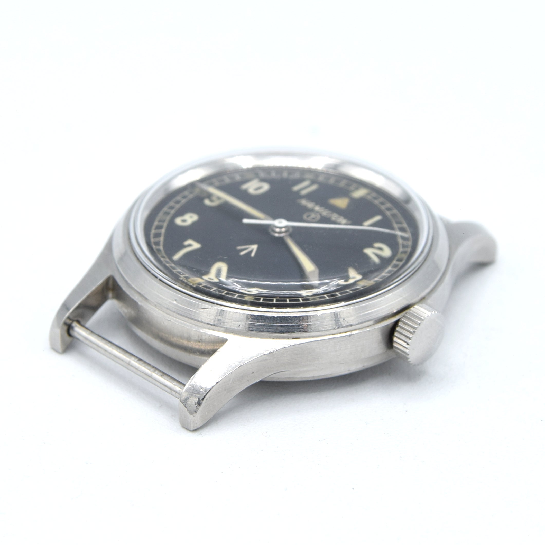 You've got all the classic military features on this watch. Black dial with applied Arabic numerals, tritium luminous markers, Broad Arrow and tritium 'T' on the dial, case back markings, military case and fixed lugs. It is also the rare hacking version of the Hamilton RAF watches.