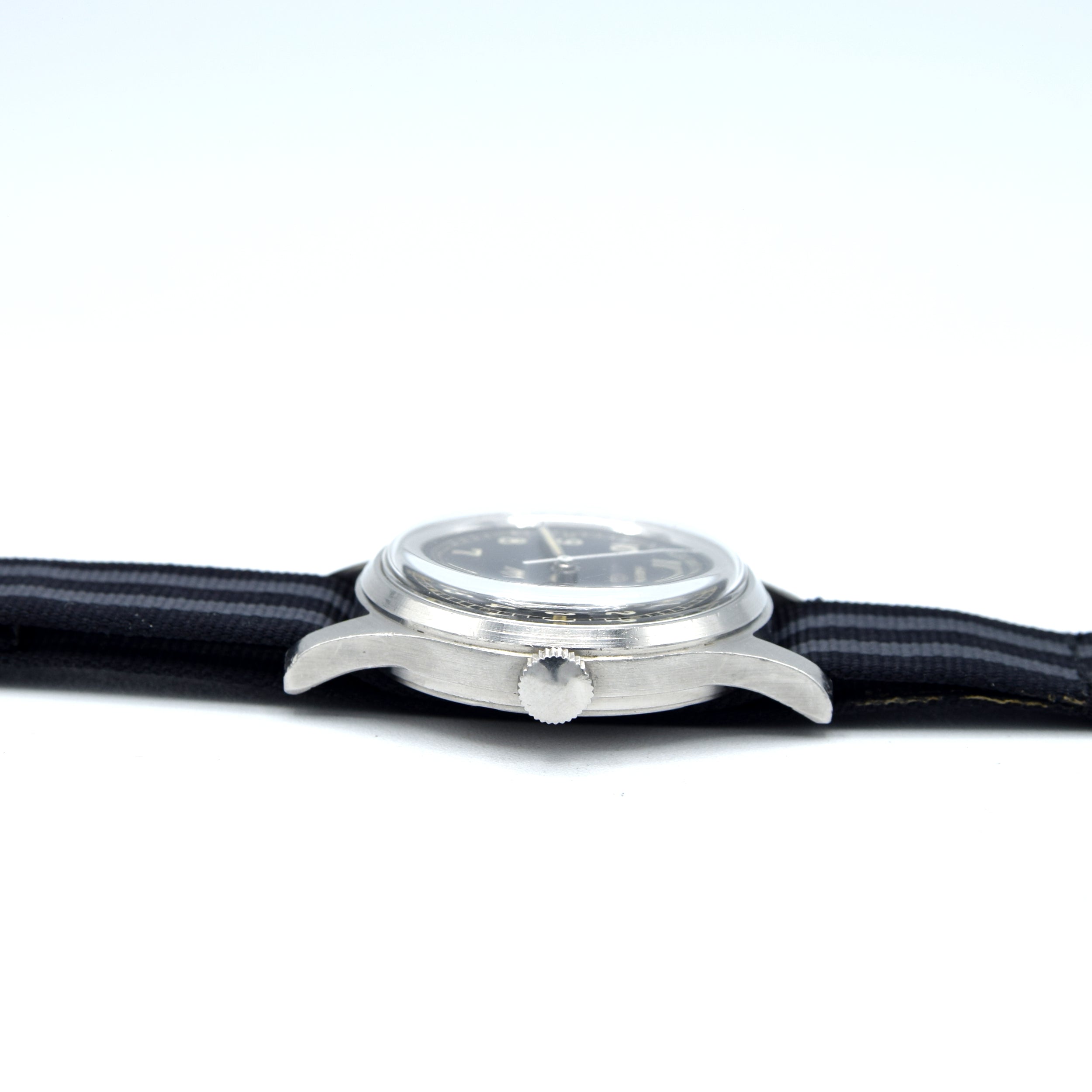 The Mk 11 Connection: The Mk 11 specification was developed by the British MoD shortly after WWII to create the ultimate navigation watch for pilots. Watches meeting this spec had to withstand extreme temperature changes, high altitudes, and magnetic interference. While the IWC and JLC versions often grab the headlines, this Hamilton was built to the same exacting standards, ensuring incredible resilience and accuracy. This specific 6B/9614045 H-67 reference distinguishes itself on the caseback and includes the all-important hacking function, making it functionally superior to the standard H-variant.