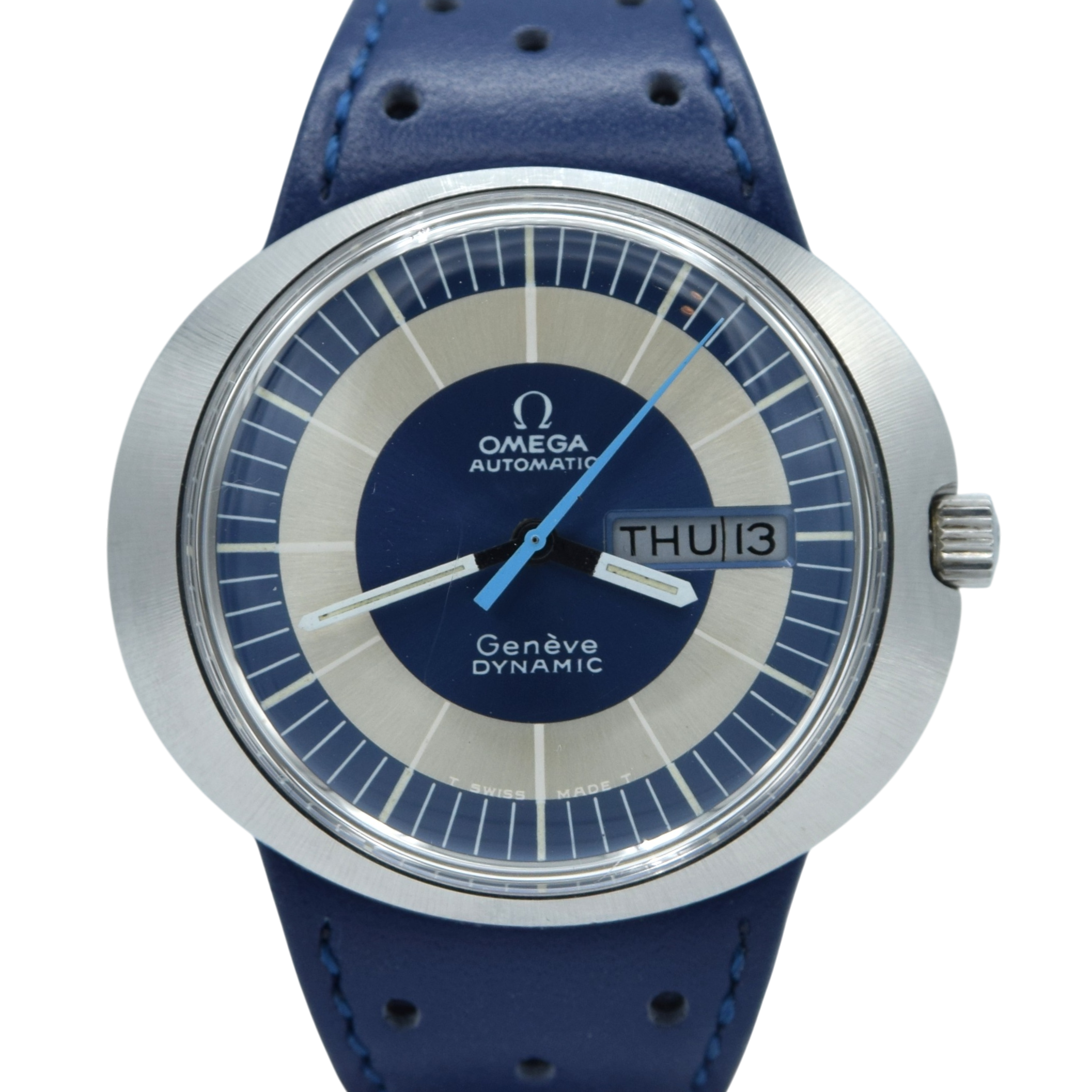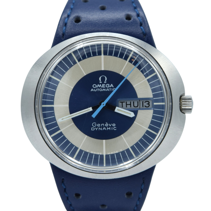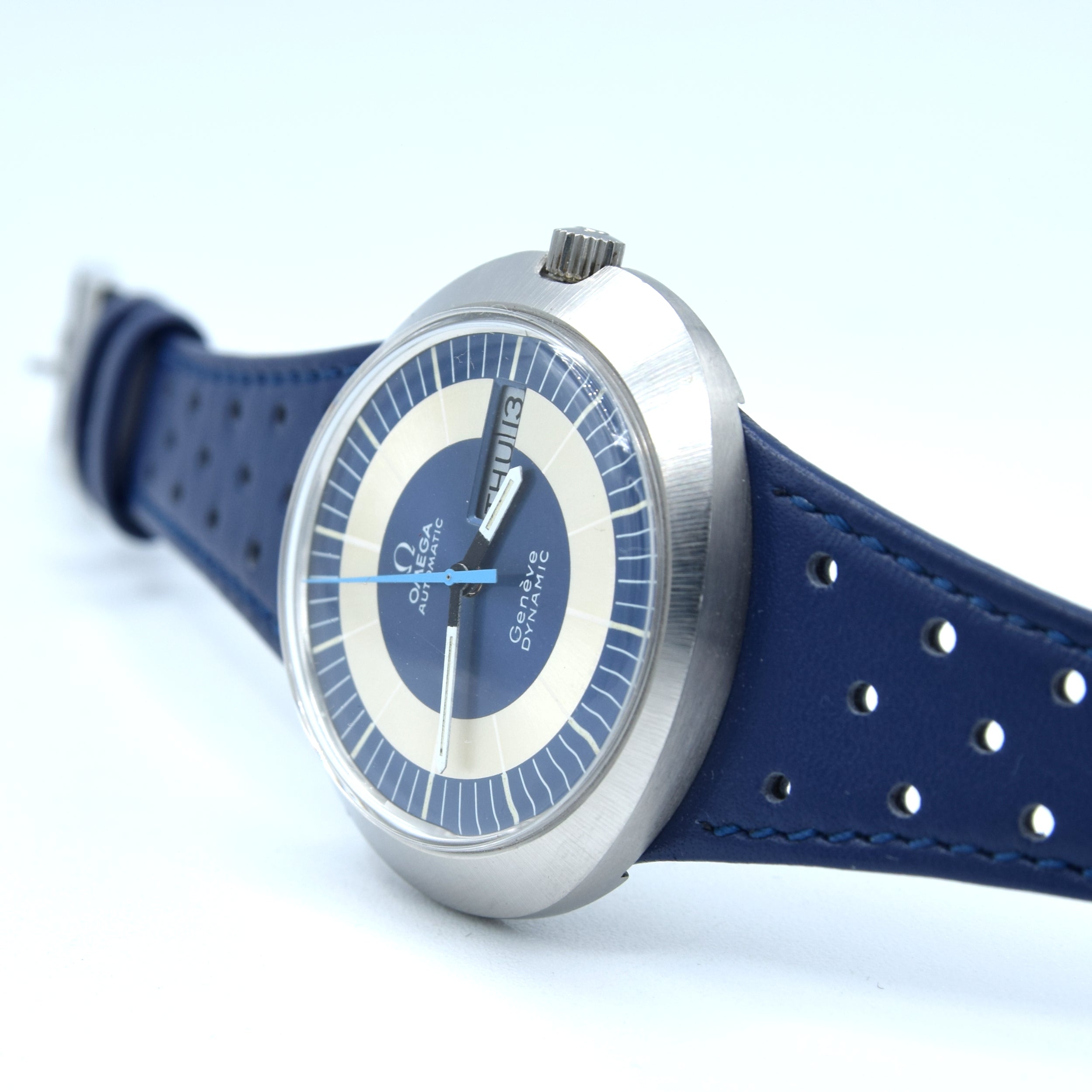 We have here one of our favourite Omegas from the late 1960s/1970s - the Dynamic! The original two-tone, bullseye dial has a blue outer minute track with slim, painted, white baton markers that extend into the inner silver ring. At 3 o'clock is the unusual, day/date function, with a cyclops magnification on the crystal. At the centre of the dial are the baton hour and minute hands, which are nicely complemented by the blue central seconds hand. One of the best condition original dials ive seen in a while and unpolished case.