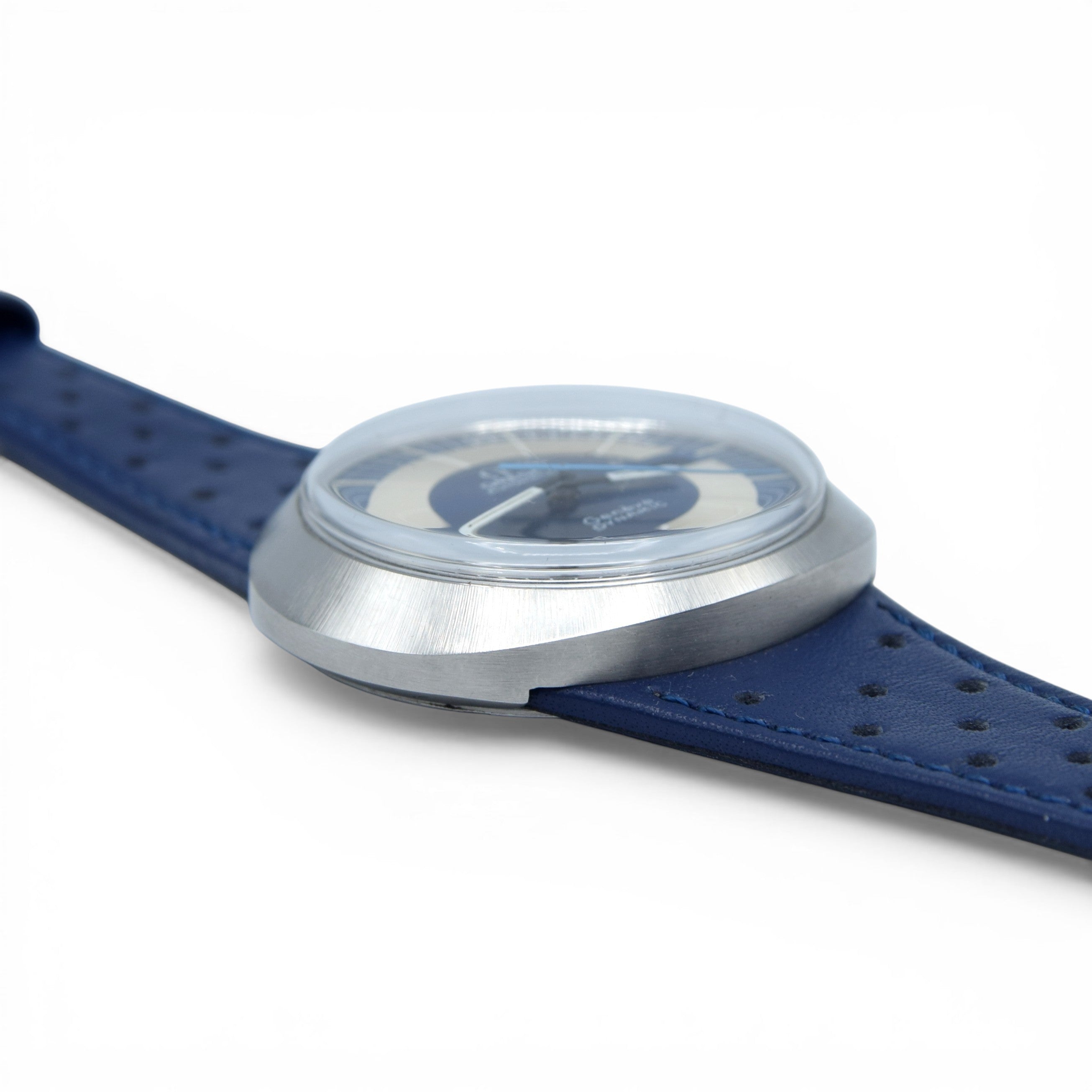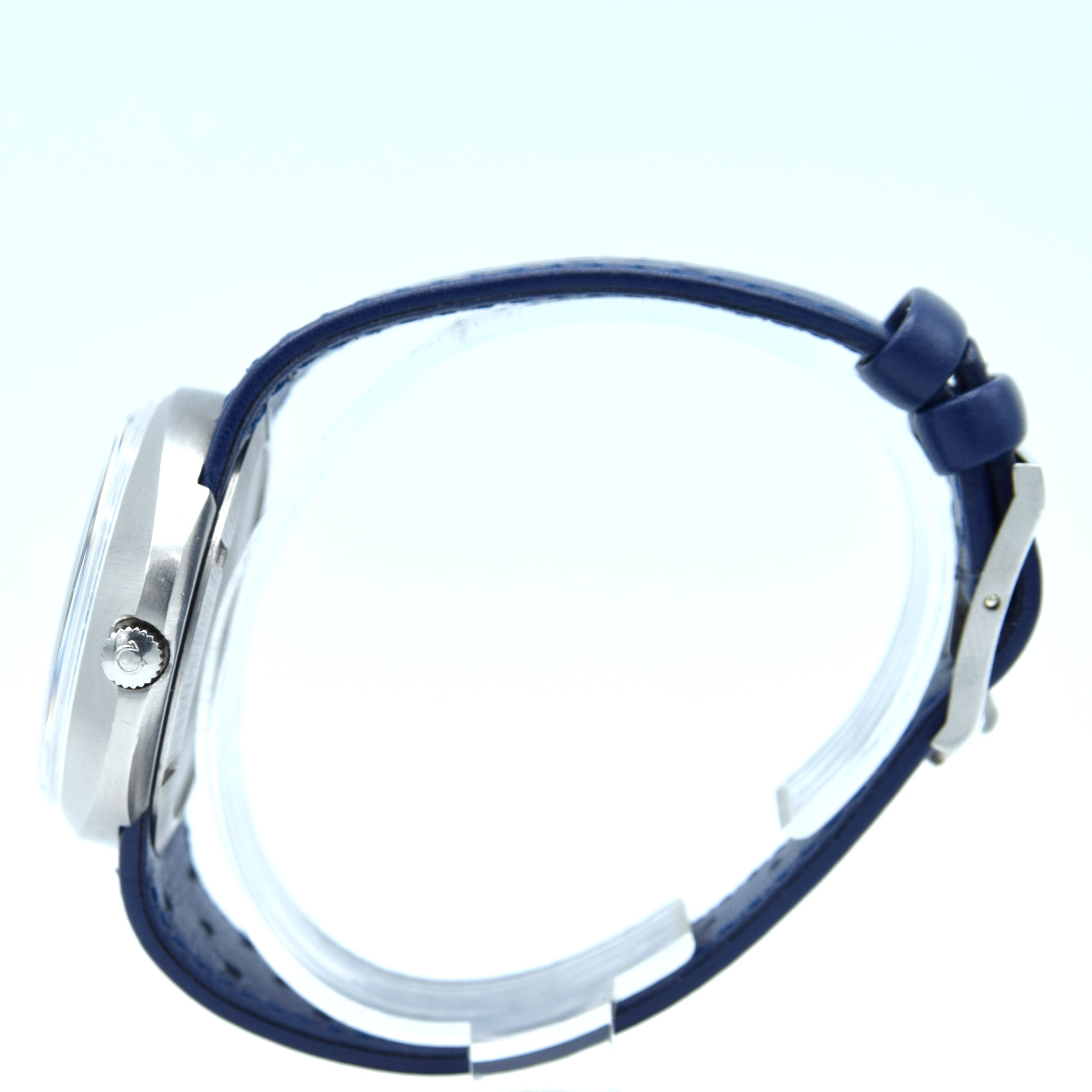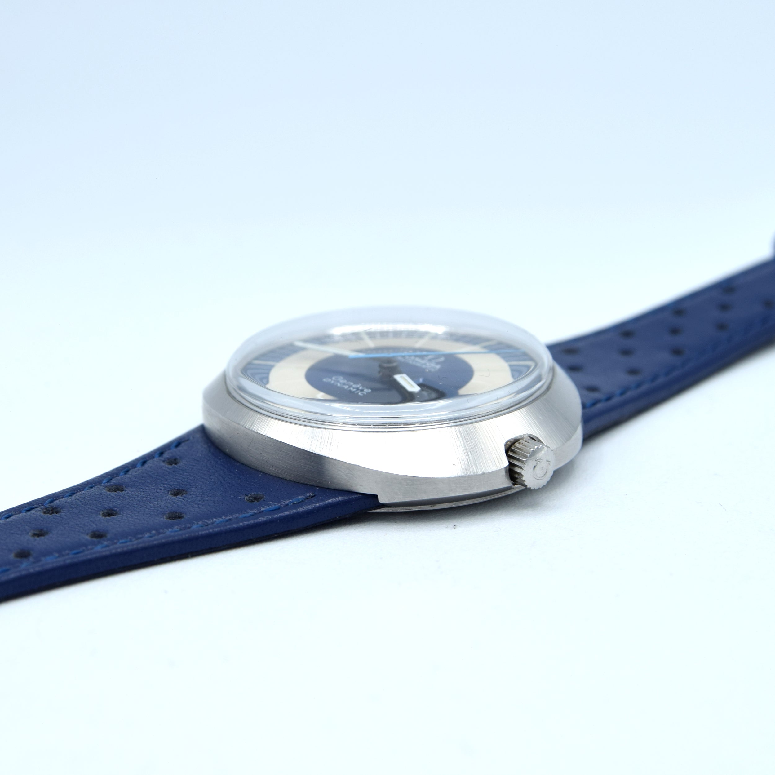 We have here one of our favourite Omegas from the late 1960s/1970s - the Dynamic! The original two-tone, bullseye dial has a blue outer minute track with slim, painted, white baton markers that extend into the inner silver ring. At 3 o'clock is the unusual, day/date function, with a cyclops magnification on the crystal. At the centre of the dial are the baton hour and minute hands, which are nicely complemented by the blue central seconds hand. One of the best condition original dials ive seen in a while and unpolished case.