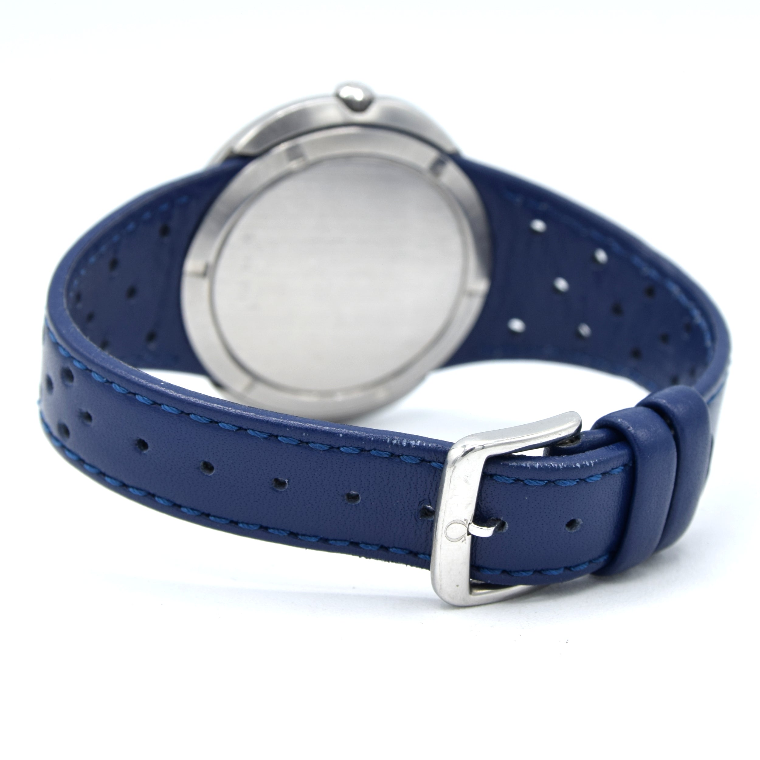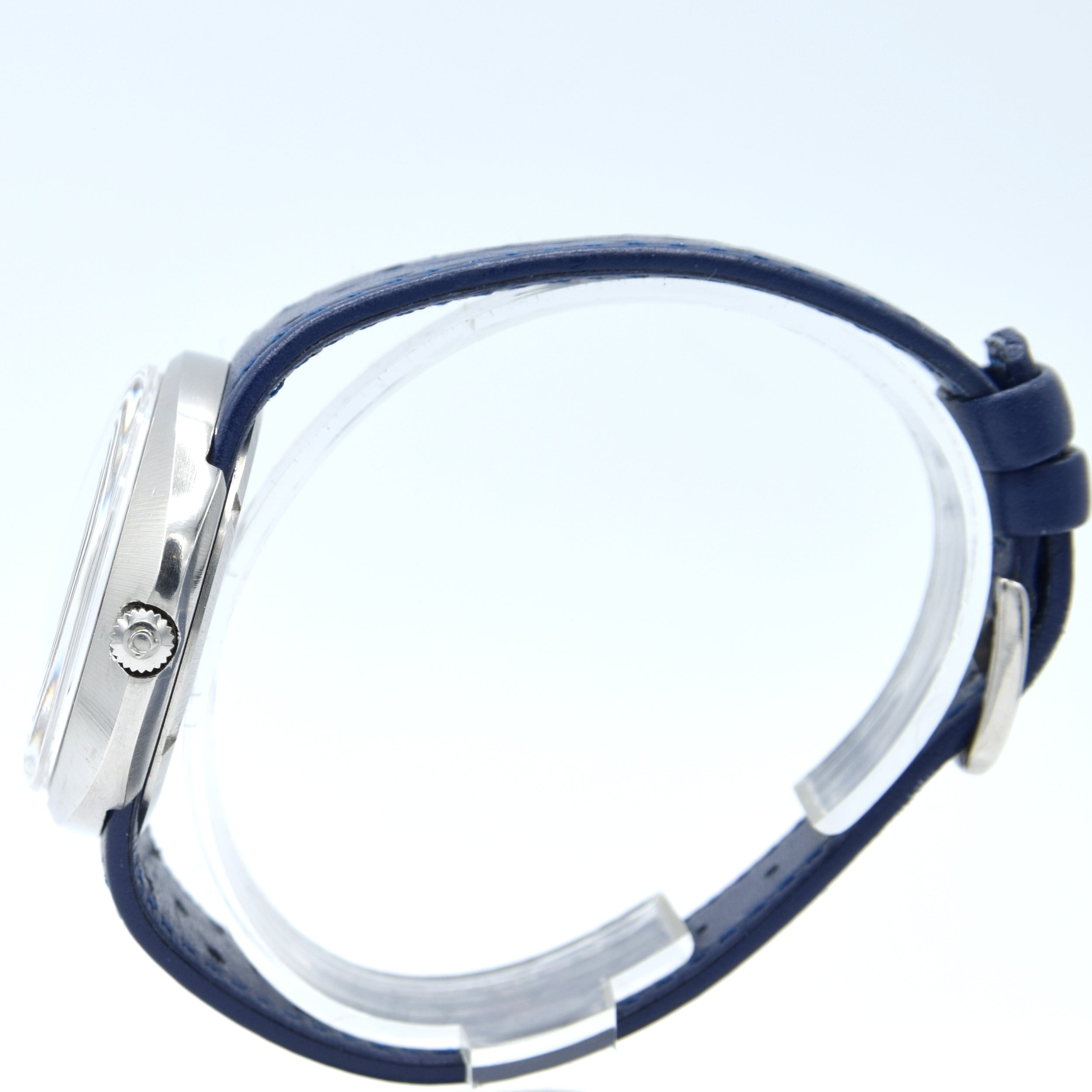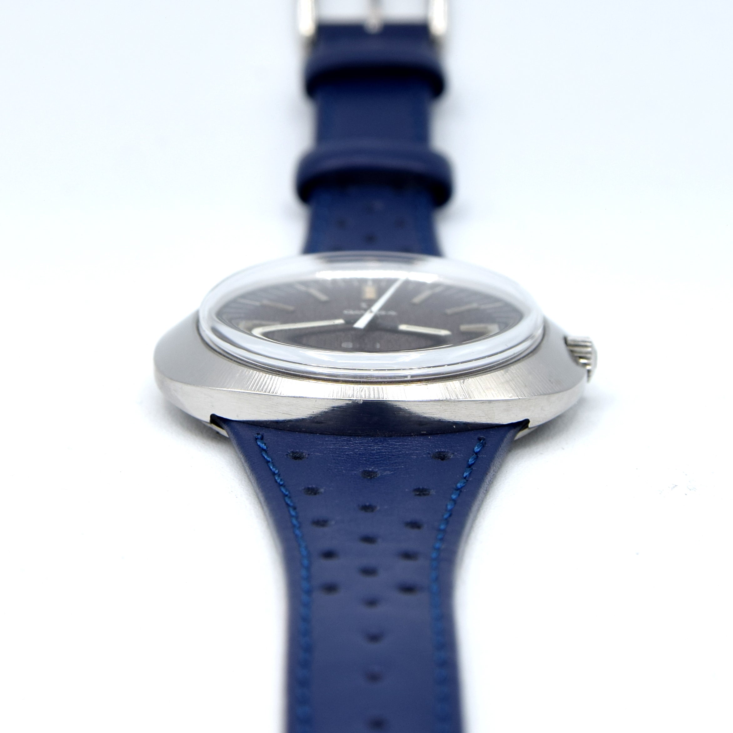 Inside the case is the workhorse Omega caliber 601 manually wound, fully serviced by us and running strongly. paired on an aftermarket blue racing strap, and original omega buckle keeping its sporty feel but it looks good on anything.