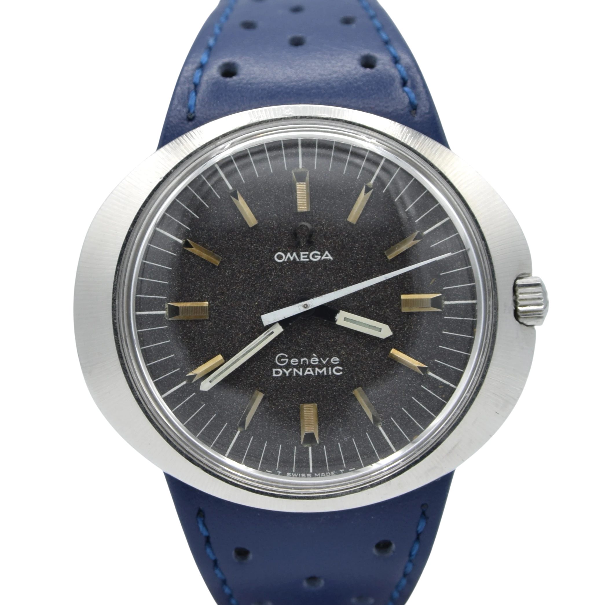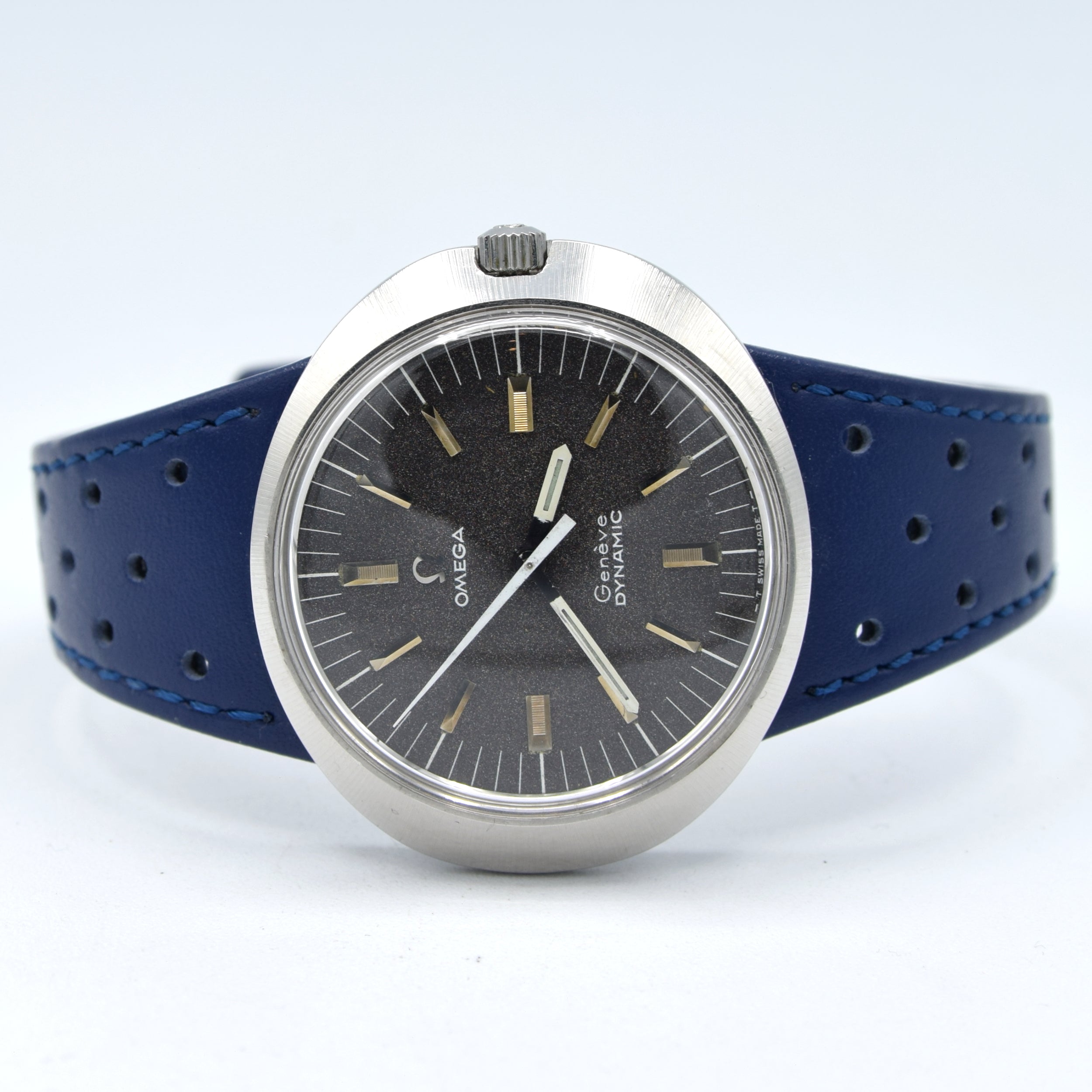 We have here one of our favourite Omegas from the late 1960s/1970s - the Dynamic! The original matte dusted grey dial is simply beautiful! The colour changes in different light , deep graphite grey , applied faceted and ridged indexes, luminescent dots above, black and white luminescent hands (please note that luminescence will have naturally dulled with age), White centre seconds, outer white minute track The outer minute track is like a bursting star with slim, white, painted baton markers that extend to the inner ring. At the centre of the dial are the stick hour and minute hands and are nicely complemented by the light central seconds hand.