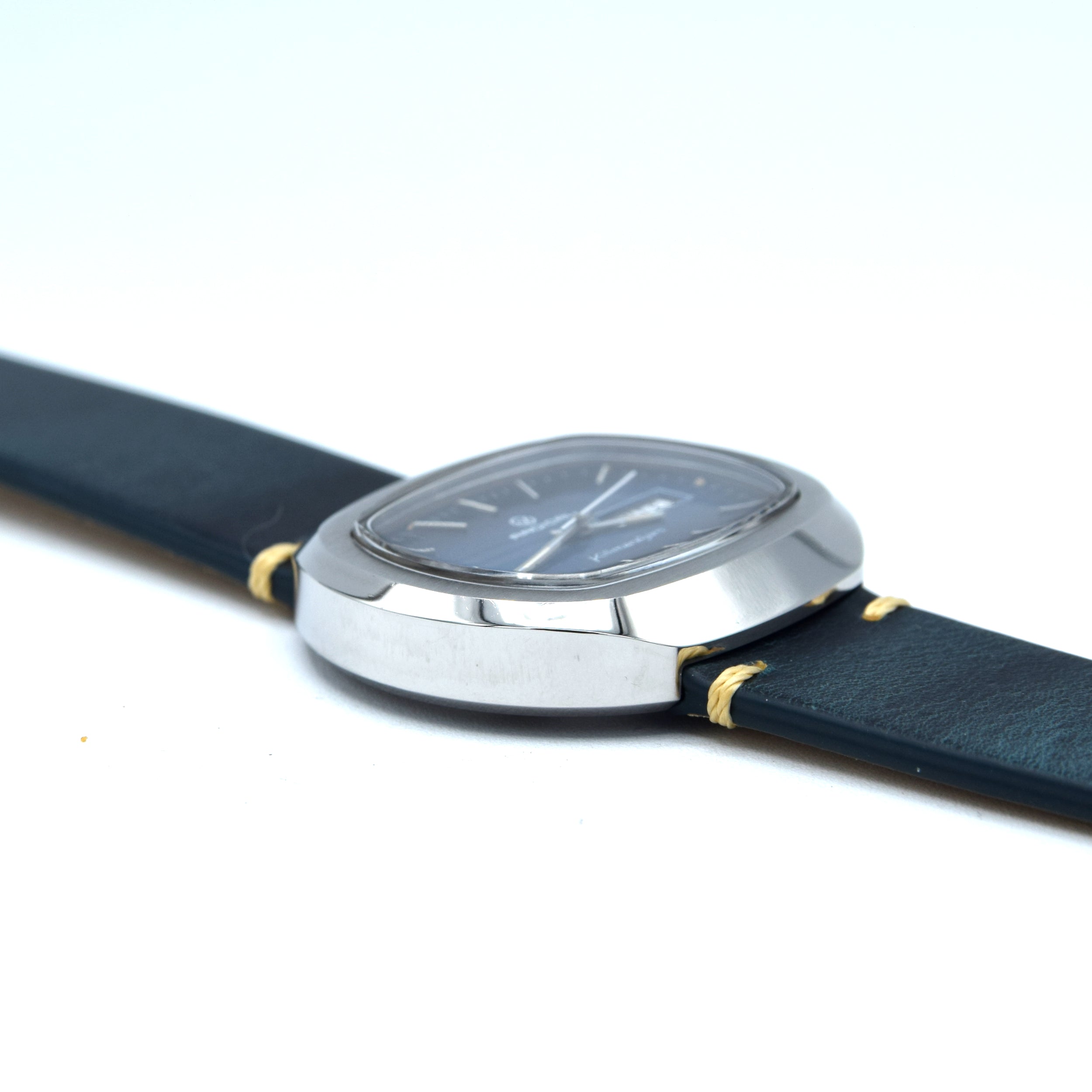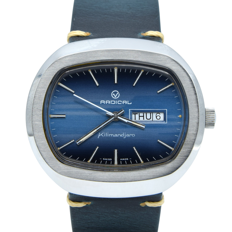 On offer here is a distinctively 1970s New Old Stock Radical Kilimandjaro electric blue dial "Shutter" or "Venetian Blind" effect or The design is meant to create a "holographic" or "3D" illusion. By placing the darkest shadow right across the center axis (from 9 to 3), it creates a sense of "gravity" on the dial. In the 1970s, this was the peak of "Space Age" design—trying to make mechanical objects look like high-tech electronic screens. - Day/Date with a polished and brushed stainless steel oval-shaped case. The polished flanks lead to covered lugs with a lug-to-lug length of 37mm and a case thickness of 11mm, ensuring a comfortable fit. On the right side is a signed coin-edged push/pull crown. A brushed smooth bezel holds an oval-shaped crystal above a striking and quite unique effect dial! an outer minute track with lume pips and applied baton indexes mark the hours; at 3 o’clock, a framed day/date window, elegant slim baton hands tipped with lume are complemented by a white seconds hand; at 12 o’clock, we have the motif and at 12 o’clock “Kilimandjaro” completes this sophisticated dress watch. On the reverse, a screwed-down case back with its wax sticker still in place above the engraved details of the watch, inside an automatic MSR S77 Automatic (21 Jewels) beating at 21,600 beats per hour. The watch comes paired with a well-suited blue 22mm padded leather strap which we think looks great!