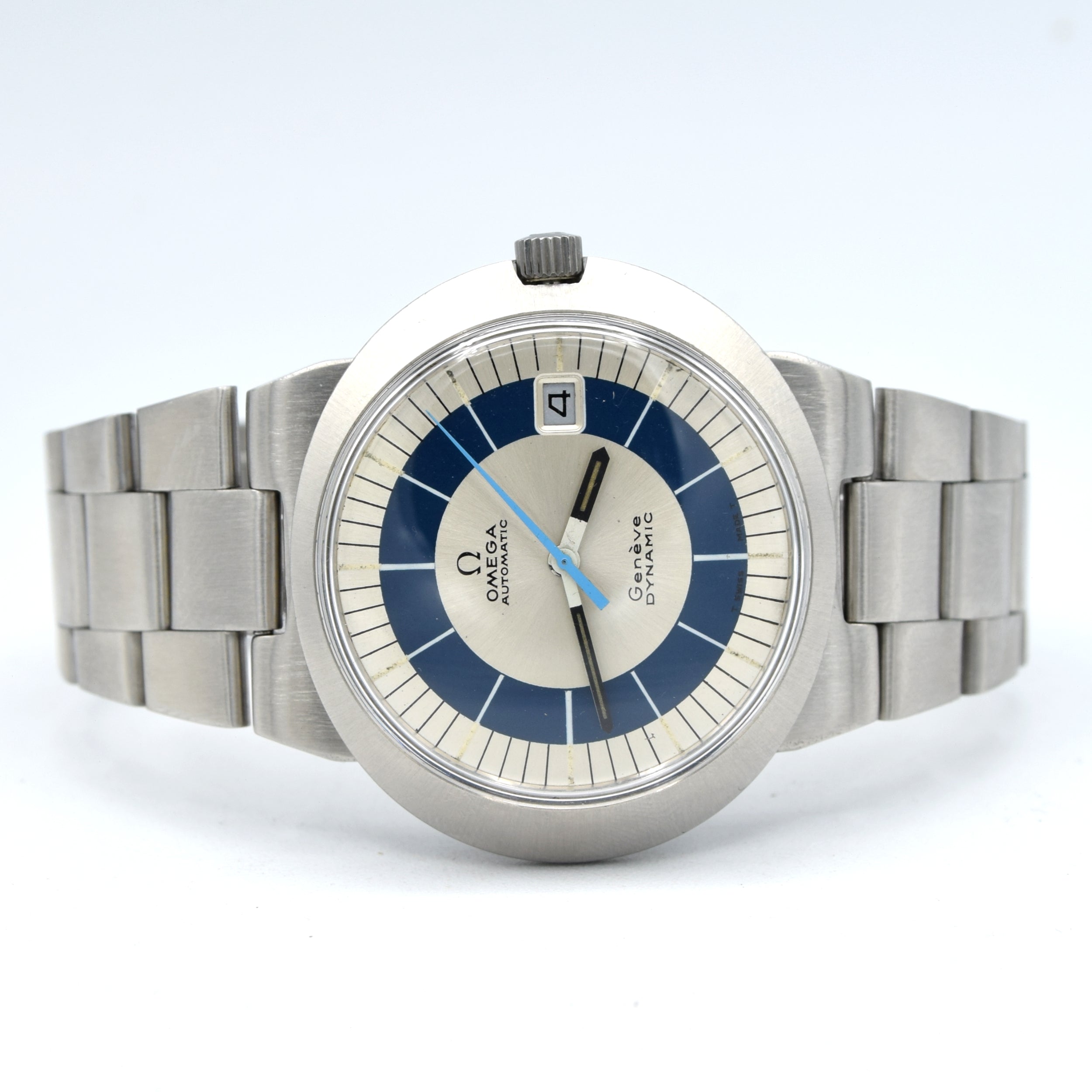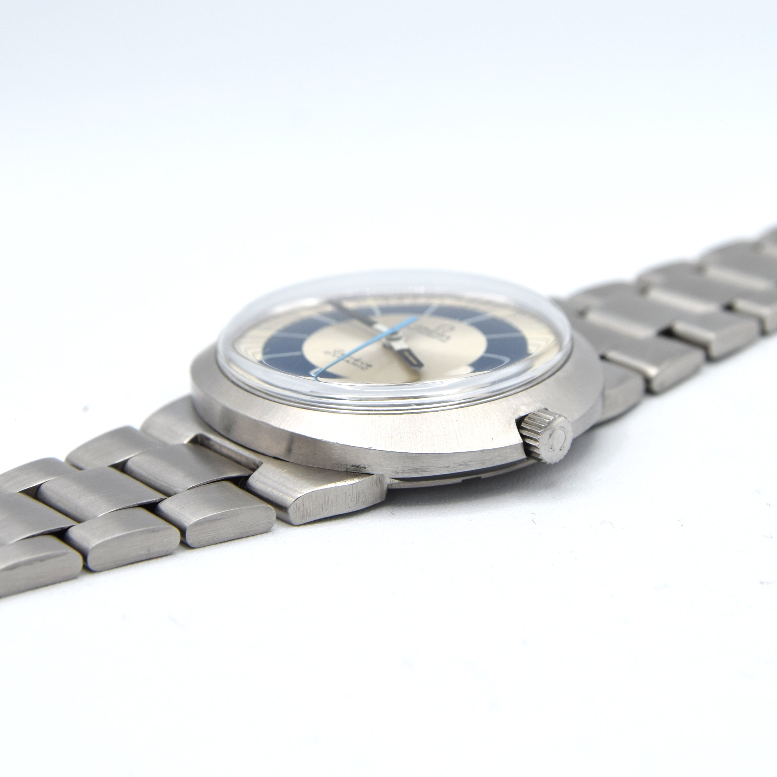 We have here one of our favourite Omegas from the late 1960s/1970s - the Dynamic! The original two-tone, bullseye dial is simply beautiful! The outer minute track is like a bursting star with slim, white, painted baton markers that extend to the inner ring. At 3 o'clock is the unusual date function with push/pull date set. At the centre of the dial are the stick hour and minute hands and are nicely complemented by the sky blue central seconds hand.