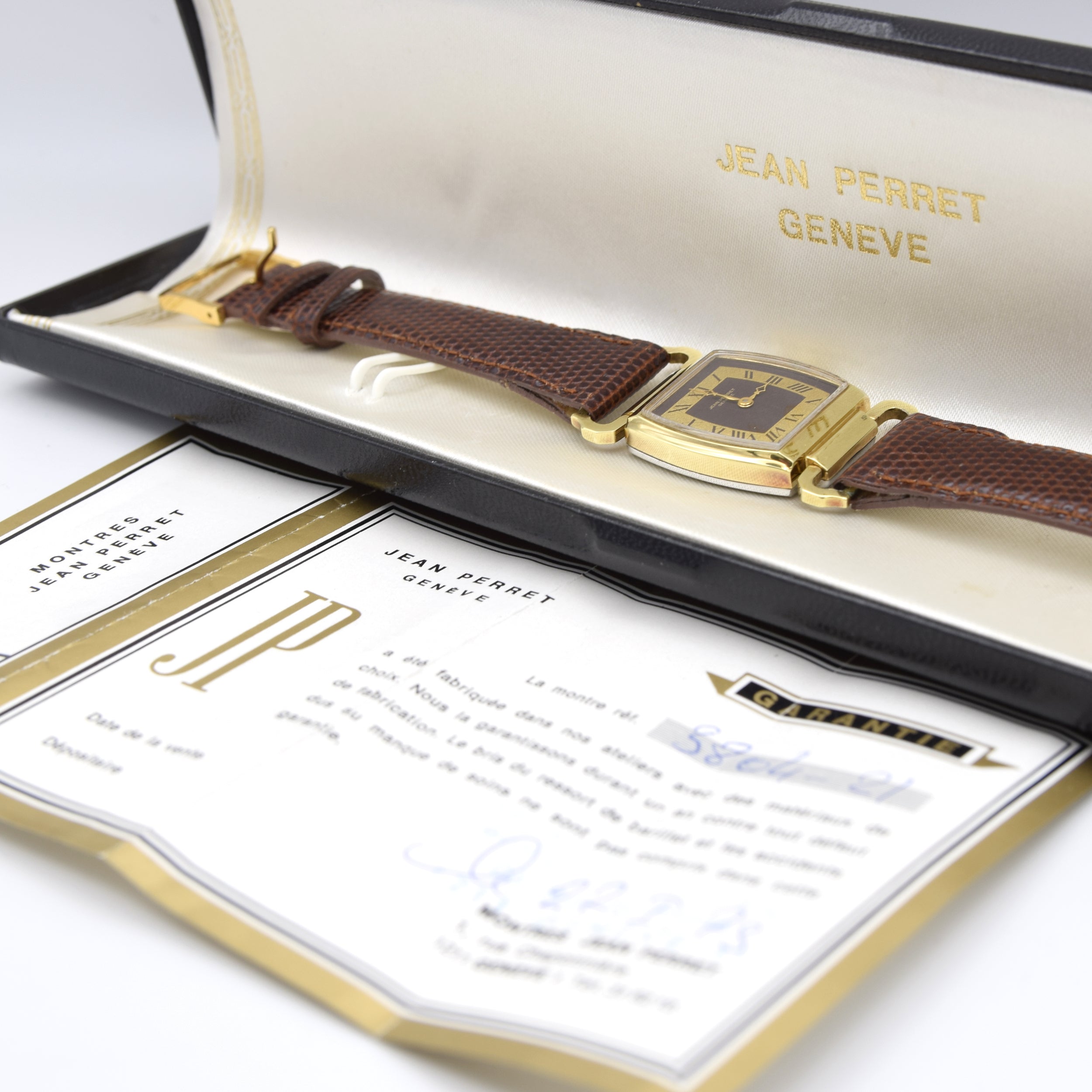 Well now for something very different! , Not only a very individual and attractive design but also with obvious notes from the 1930s and 1940s with an Art Deco feel too. A proper time-capsule piece: an unused (new old stock) Jean Perret Genève tank-style watch with its original presentation box and paperwork dated 22/07/73. The articulated/flexible lug design is a standout detail, and the dial is wonderfully “unusual” in the best way—graphic Roman numerals on a two-tone black/gold layout that screams smart 1970s design.