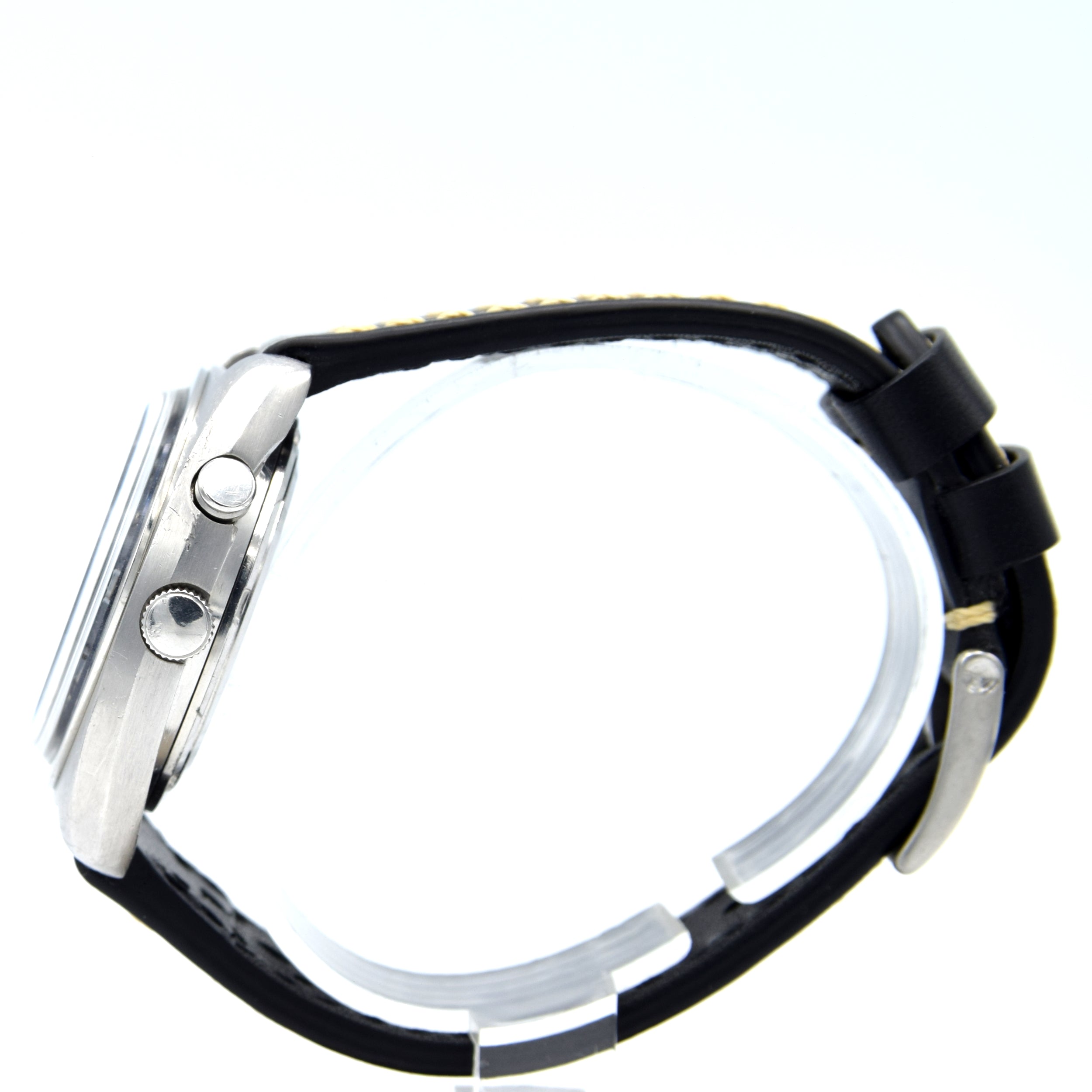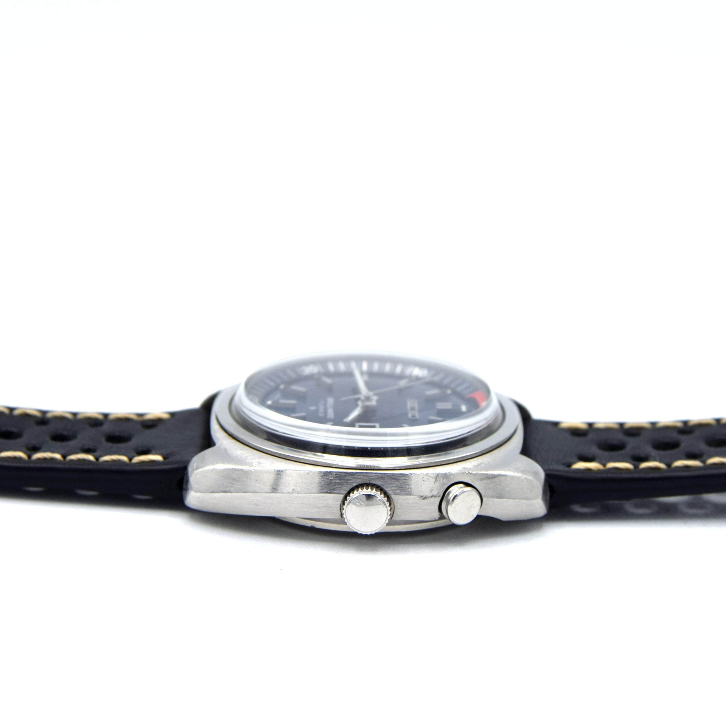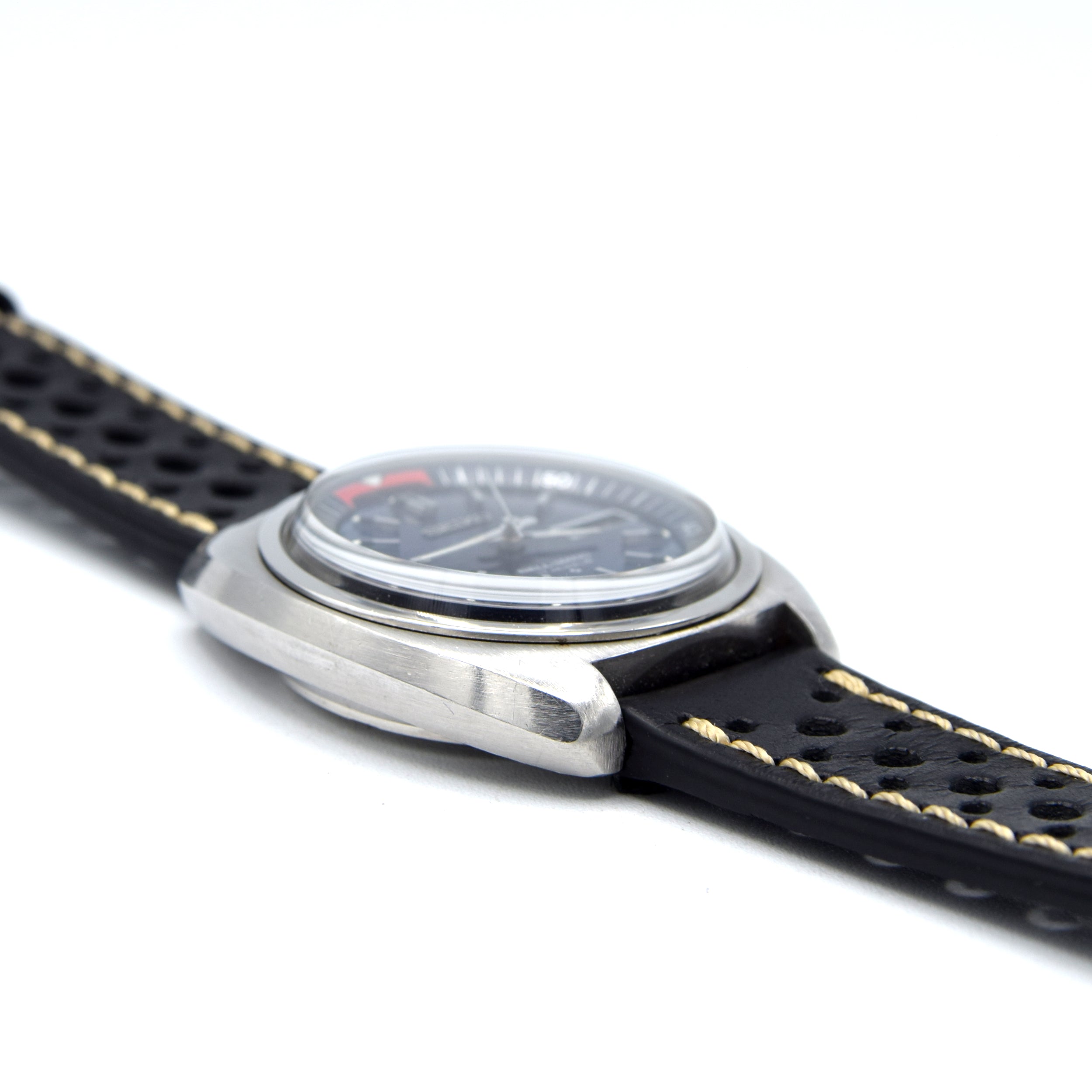 The movement—the Caliber 4006A—is automatic and features a day/date complication with a quick-set date function operated by the pusher at 2 o’clock. This particular piece is presented on a sporty black leather racing-style strap, giving it a fantastic vintage driving watch aesthetic that is perfect for the modern collector.