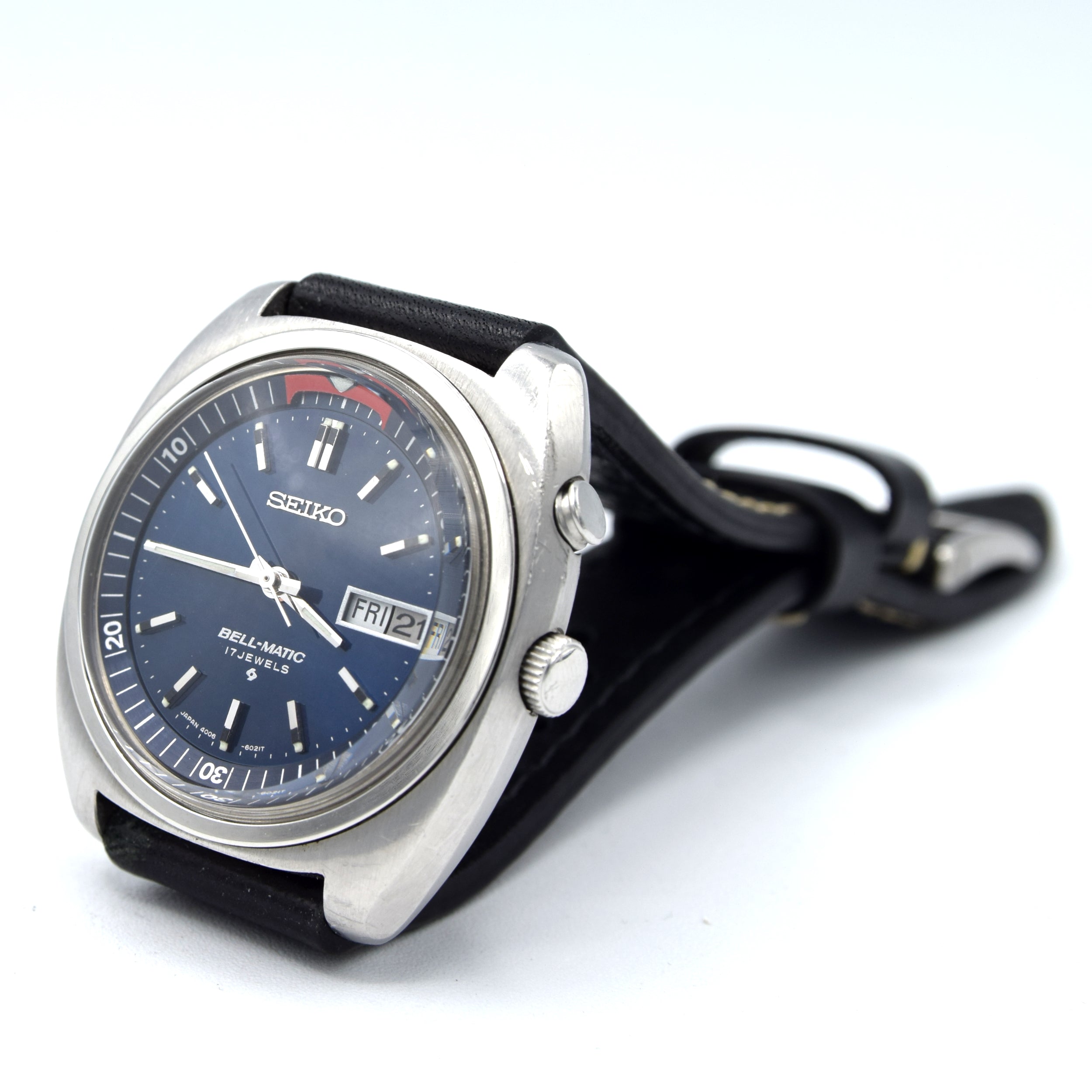 Dive into the daring design of the 1970s with this exceptional Seiko Bell-Matic, Reference 4006-6031. Dating specifically to June 1974, this watch represents Seiko’s bold venture into mechanical complications and a distinctive era of watch design.