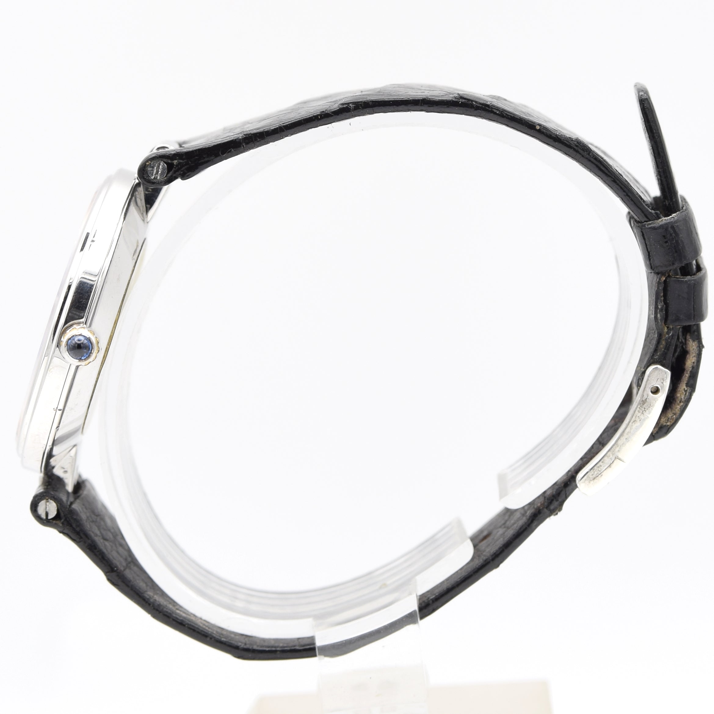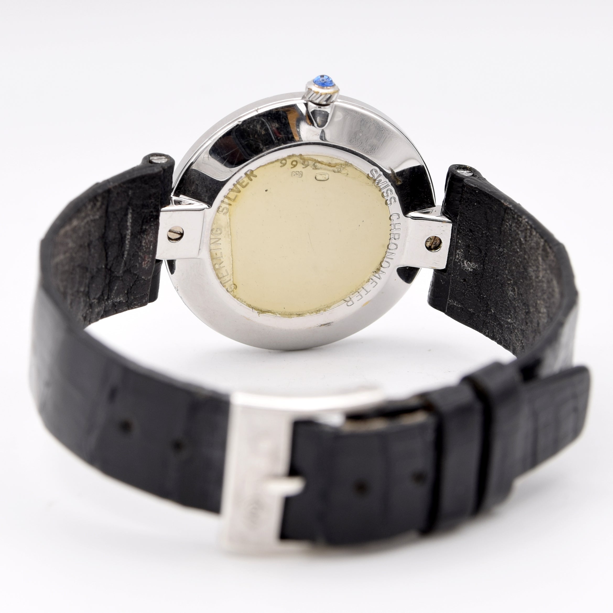 Substantial in size for a dress piece 33x40mm, polished circular banded type solid 925 silver sterling case with Tbar / Vendome lugs houses the swiss High grade ,mechancial manual winding Peseaux caliber 7001 as used by many other watch company's like , Blancpain,Girard-Perregaux,Girard-Perregaux and Corum. fully serviced by us and running strongly. The watch comes paired on its original black crocodile strap to make the dial sing along with its original Makers fully hallmarked silver buckle. Not forgetting its original box. The reverse of the watch still has its original sticker and is also marked - Swiss Chronometer.