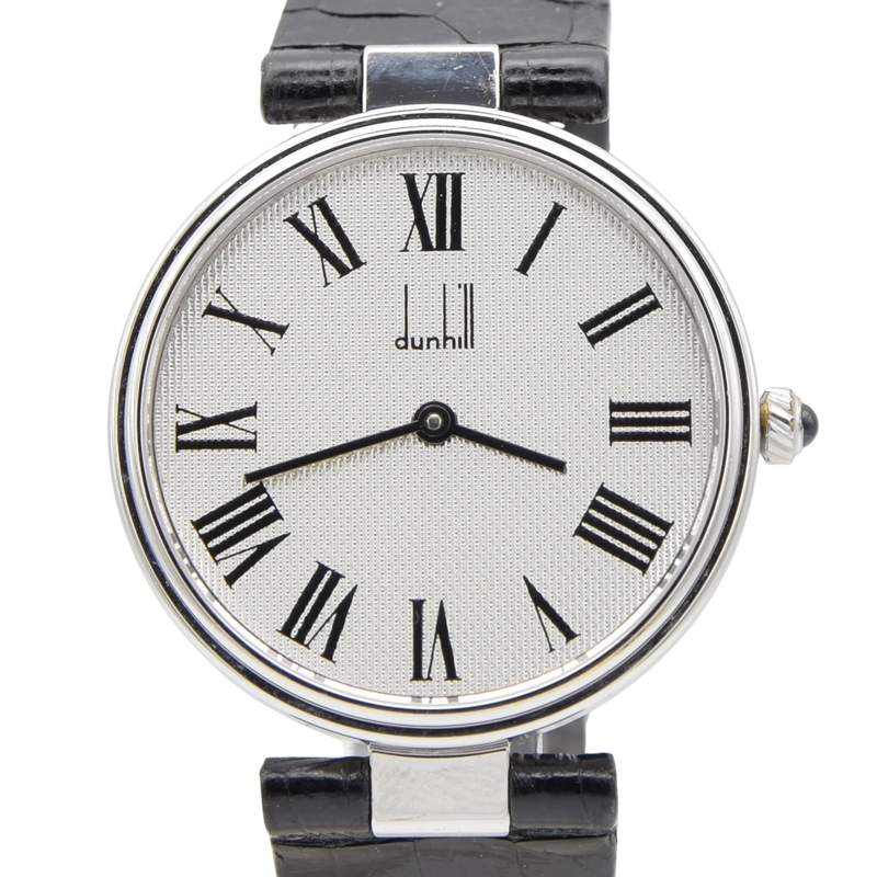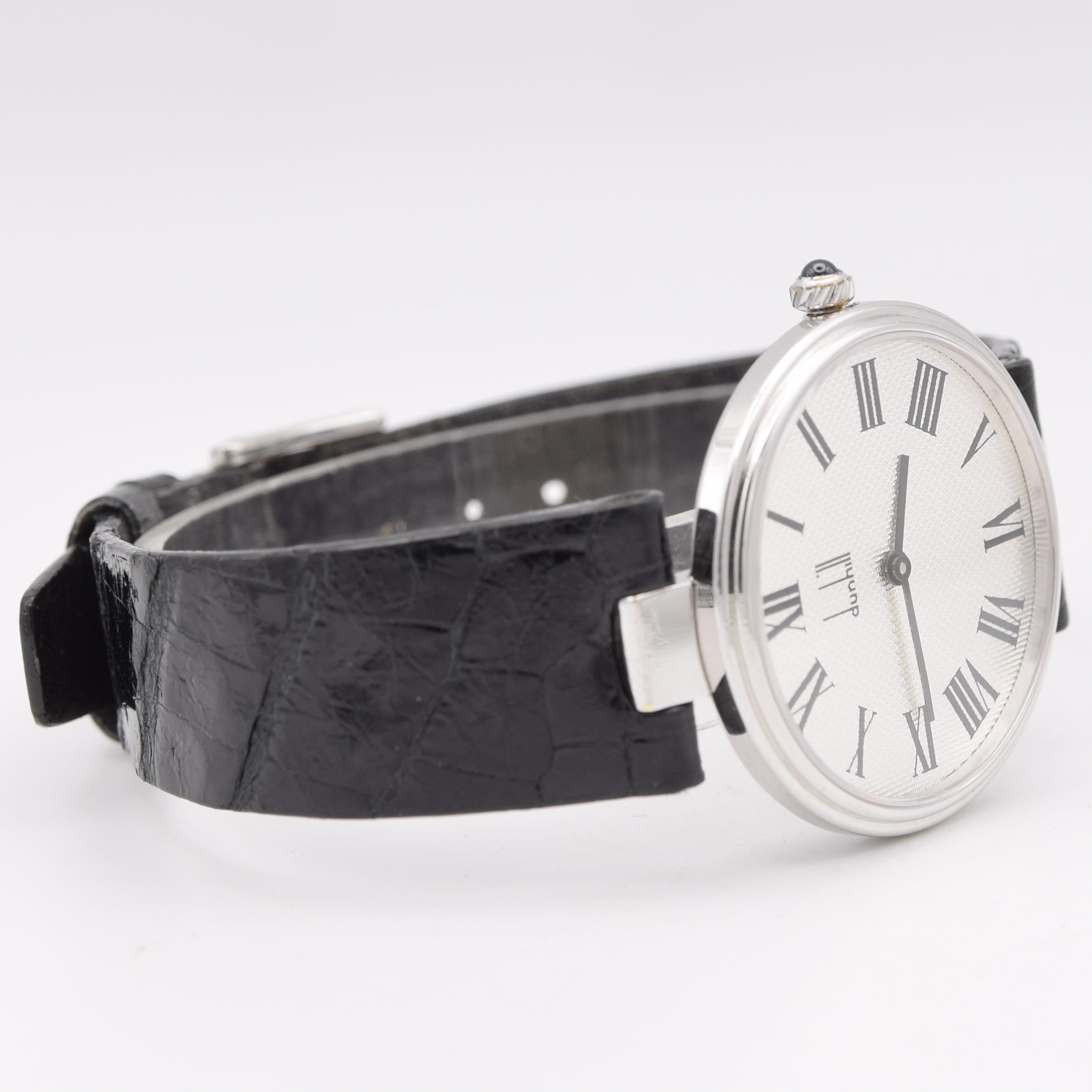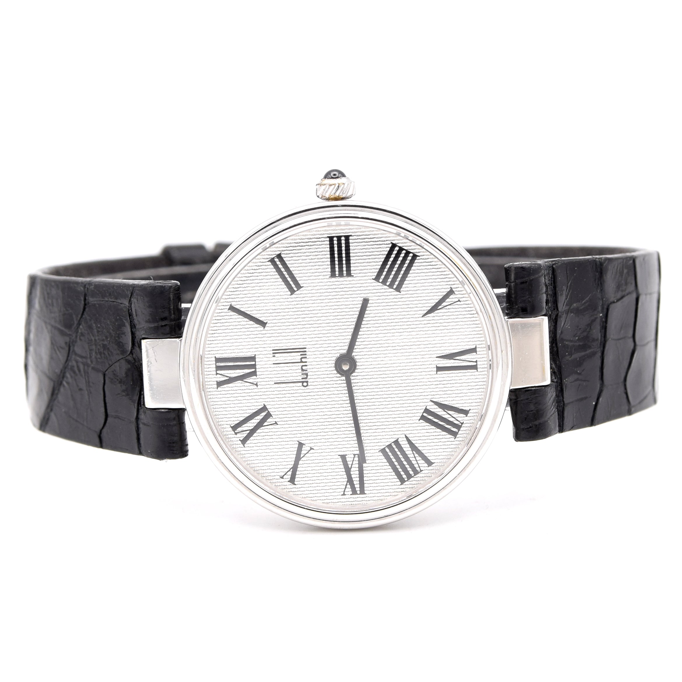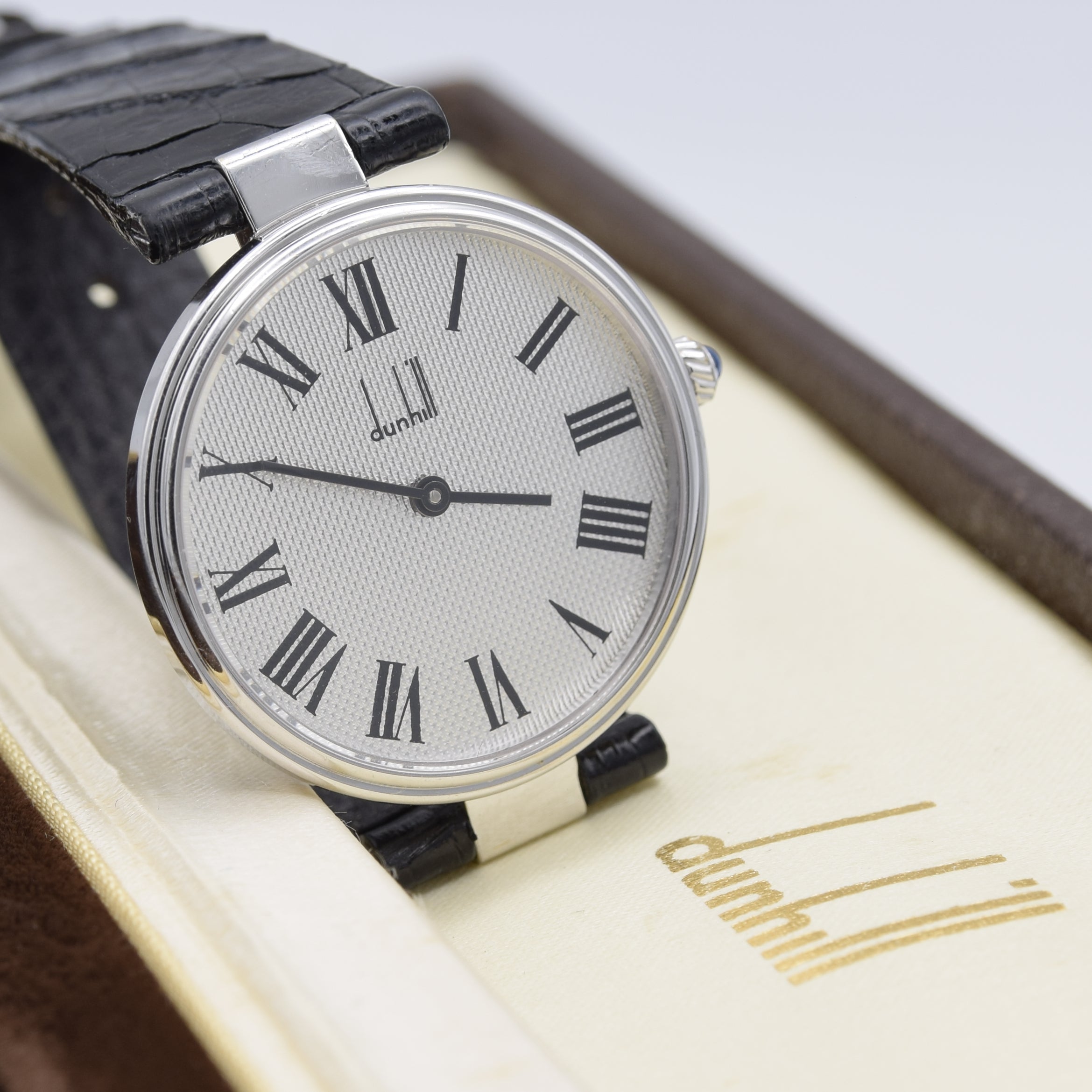 We have here a stunning ,vintage original watch by Alfred Dunhill from 1977 in outstanding condition . The super sharp and quite rare "Clous de Paris" "hobnail" guilloché. dial looks crisp and clear with distinctive Roman numerals and a real Cartier feel. , All under the flat sapphire glass. The simplicity of the full Roman numeral dial and no date function give the watch an elegant sense of symmetry. Note also the Blue cabochon stone winder.