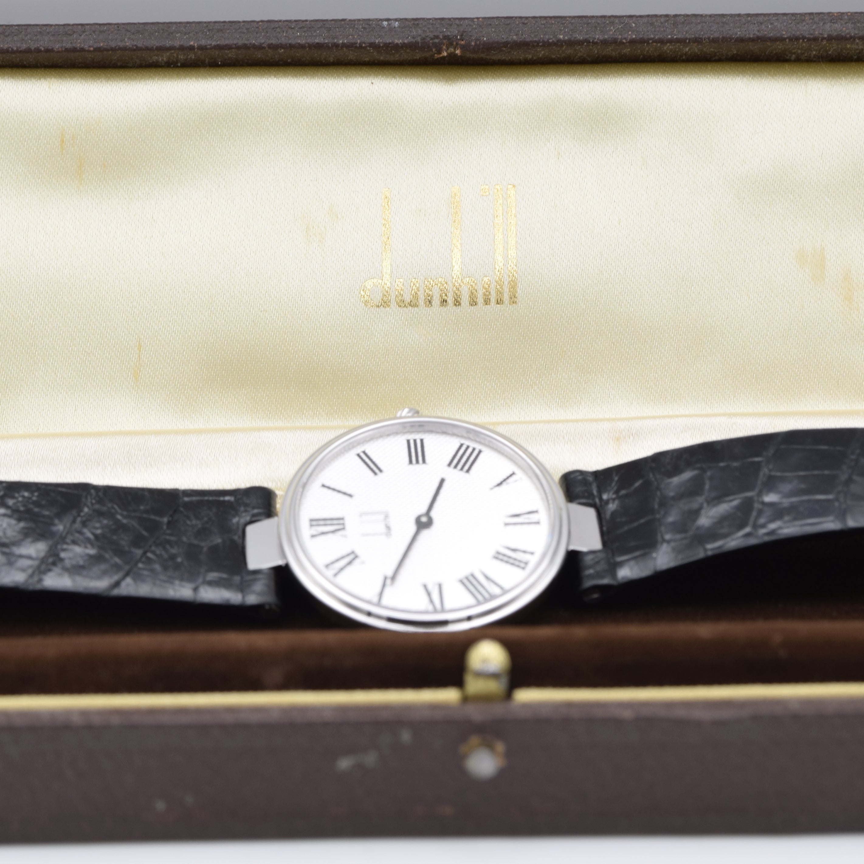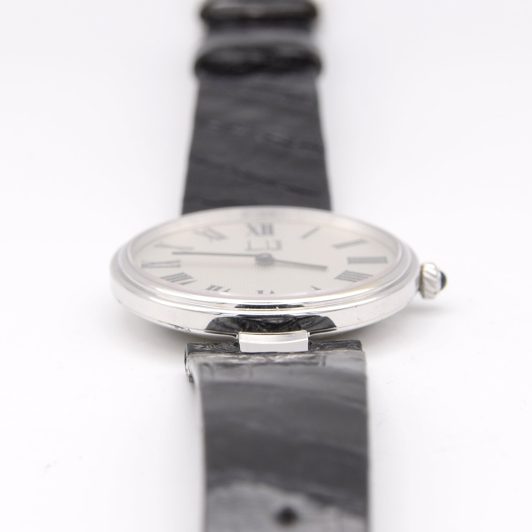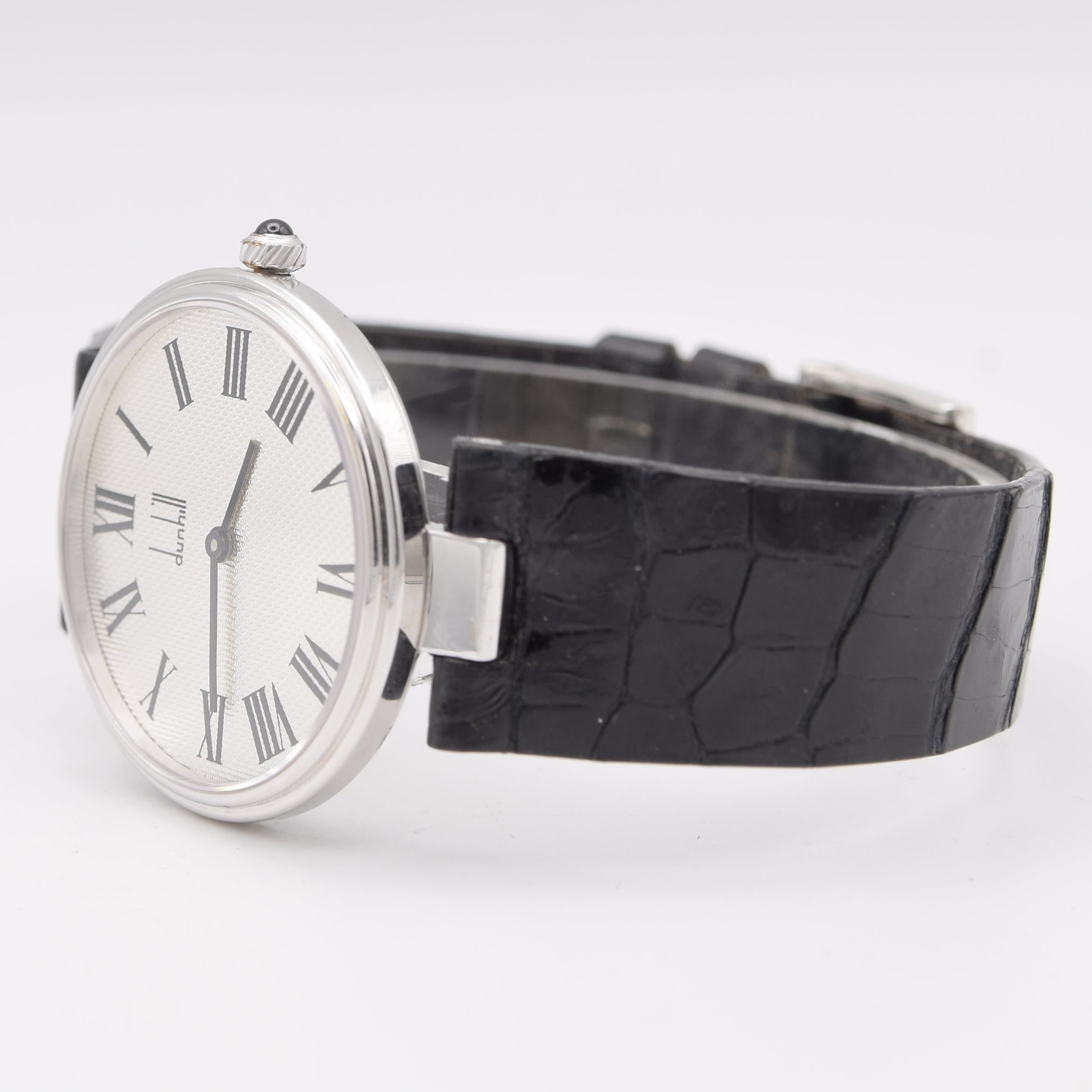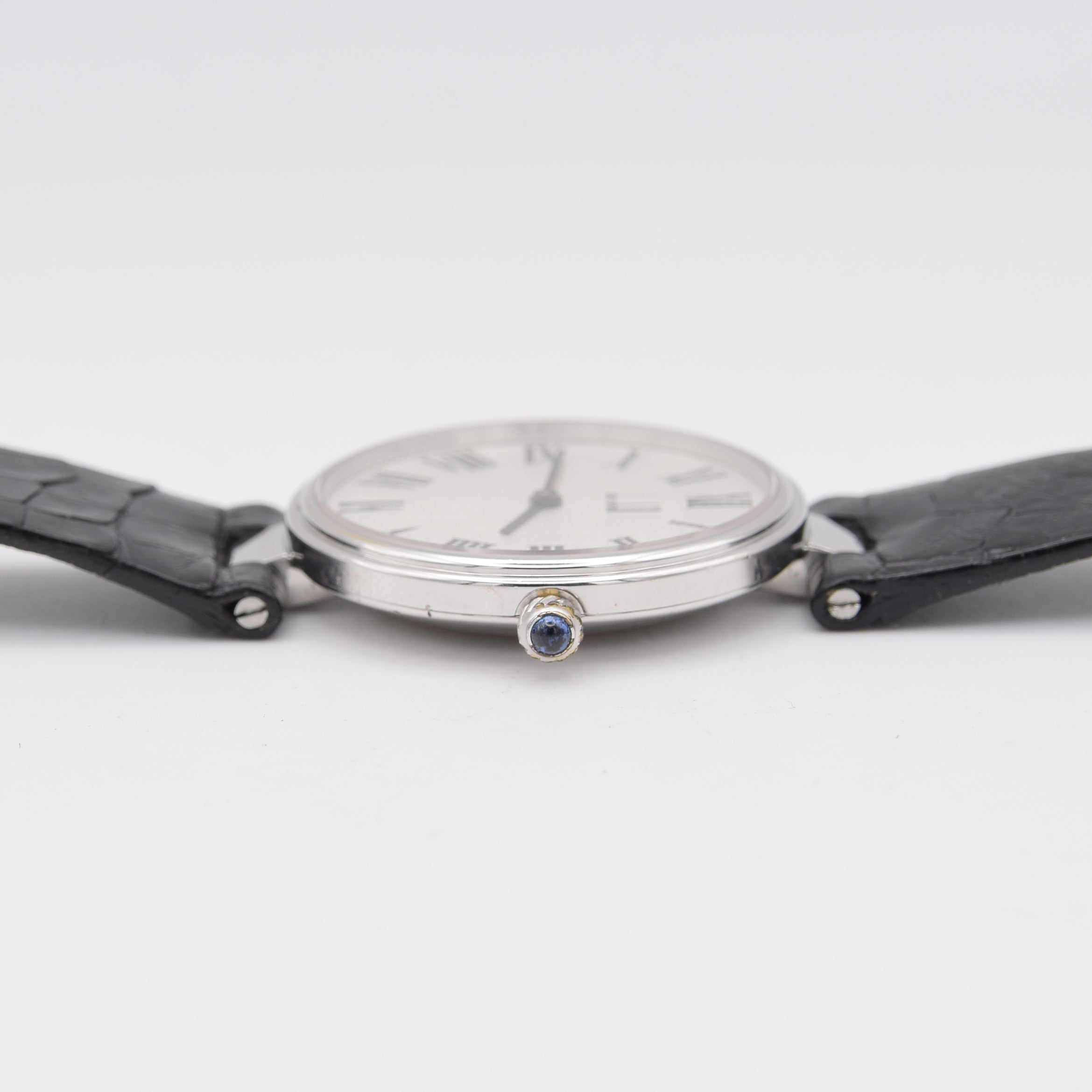 We have here a stunning ,vintage original watch by Alfred Dunhill from 1977 in outstanding condition . The super sharp and quite rare "Clous de Paris" "hobnail" guilloché. dial looks crisp and clear with distinctive Roman numerals and a real Cartier feel. , All under the flat sapphire glass. The simplicity of the full Roman numeral dial and no date function give the watch an elegant sense of symmetry. Note also the Blue cabochon stone winder.
