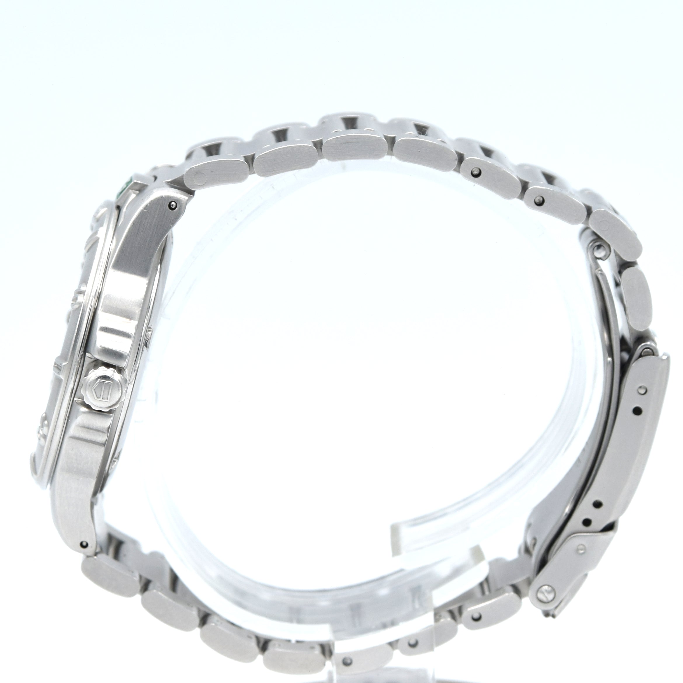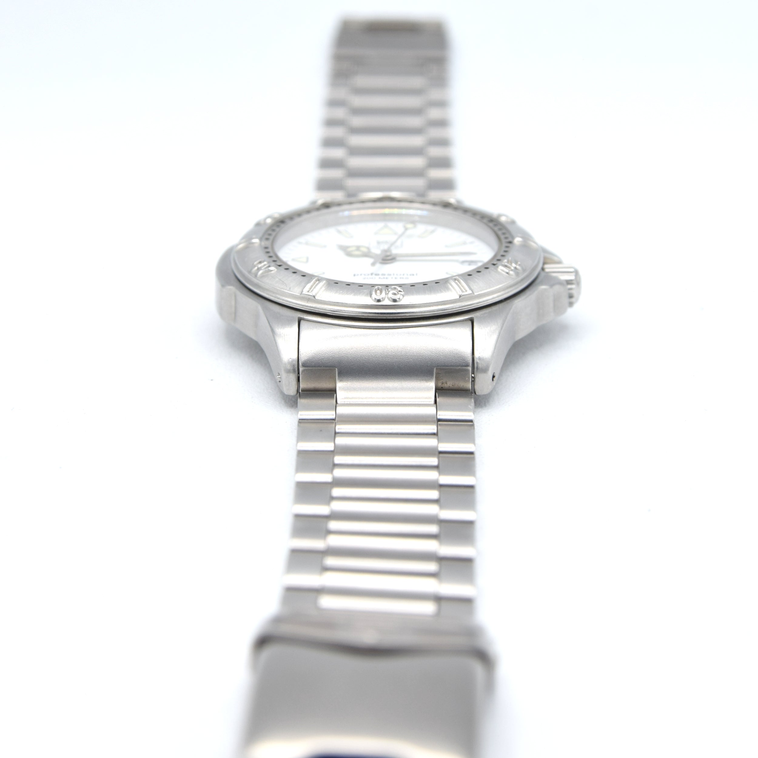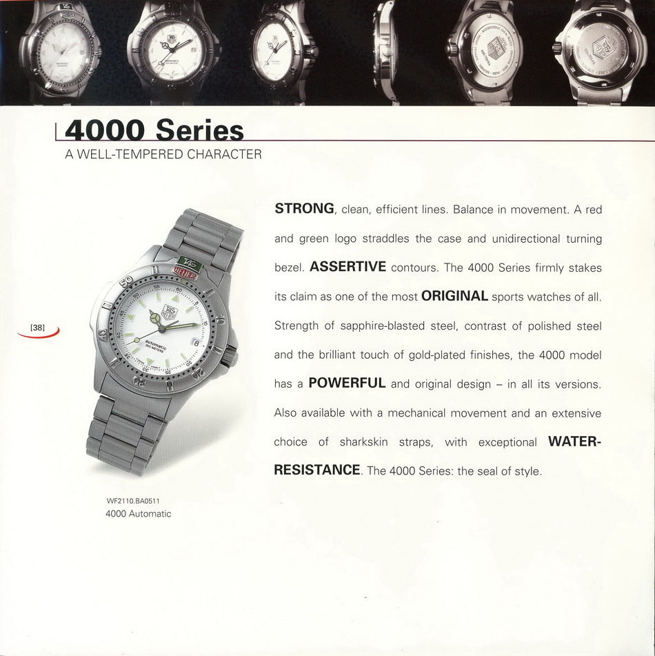 It’s a proper everyday tool watch with the classic 4000 design language: a clean, highly legible dial with strong lume plots, a rotating dive-style bezel, and a 200 metres rating printed proudly on the dial. The TAG Heuer 4000 Series is one of the most instantly recognisable “Six Features” era sport watches, with its bold, integrated case/bracelet design and the distinctive split TAG / HEUER shield at 12 o’clock. TAG Heuer positioned the 4000 as a slightly more “upmarket” sibling to the 2000 Series, with softer case lines and a cleaner, more refined overall look.