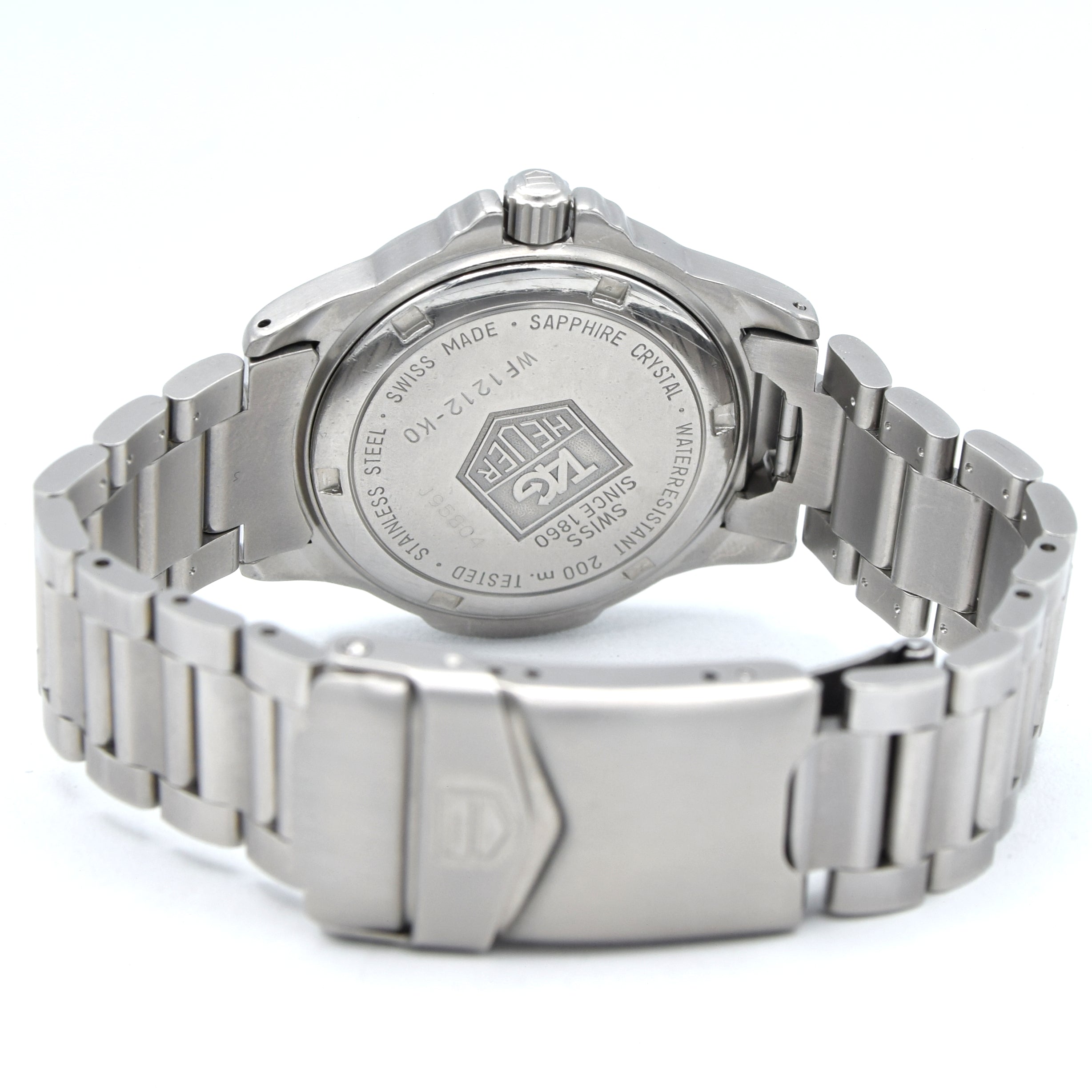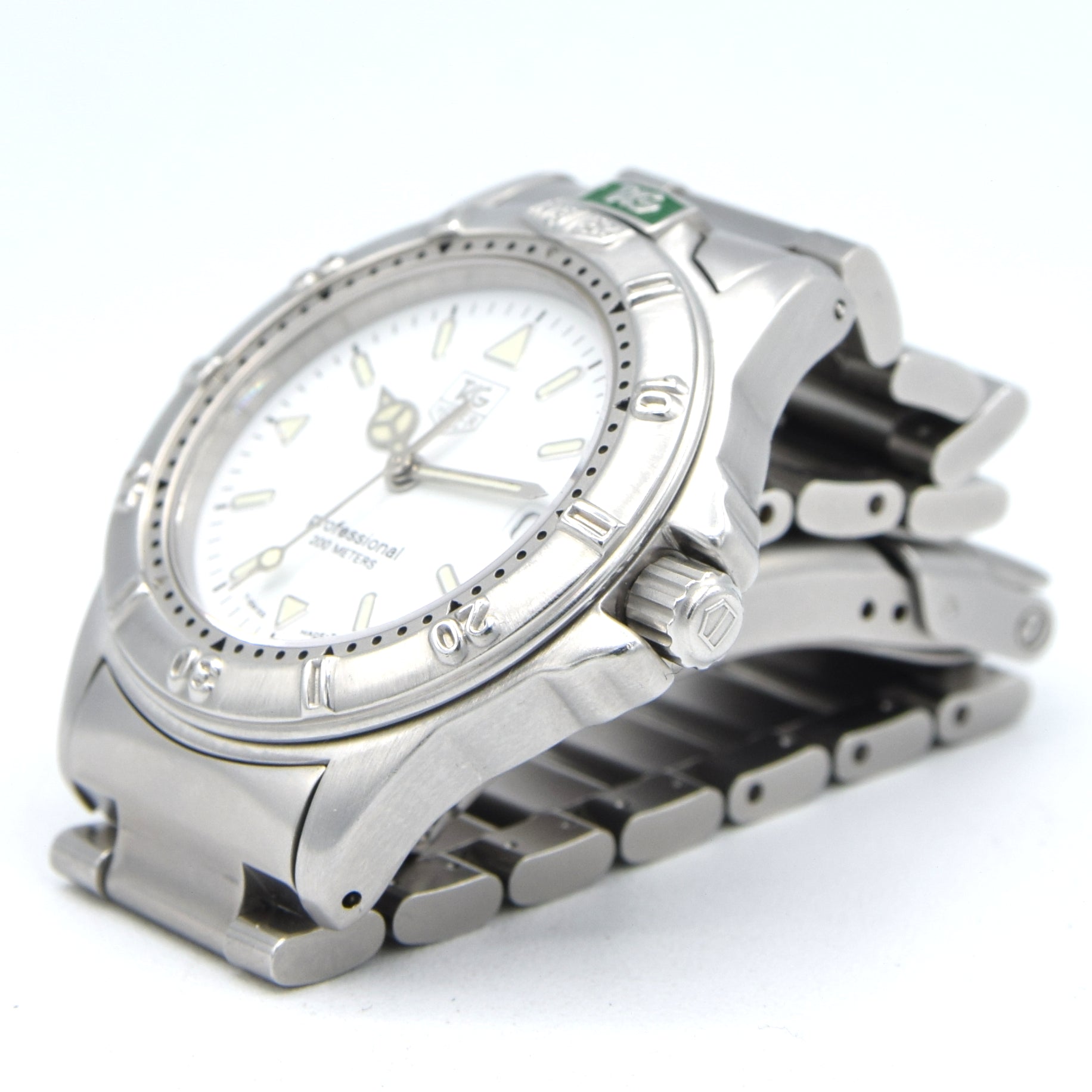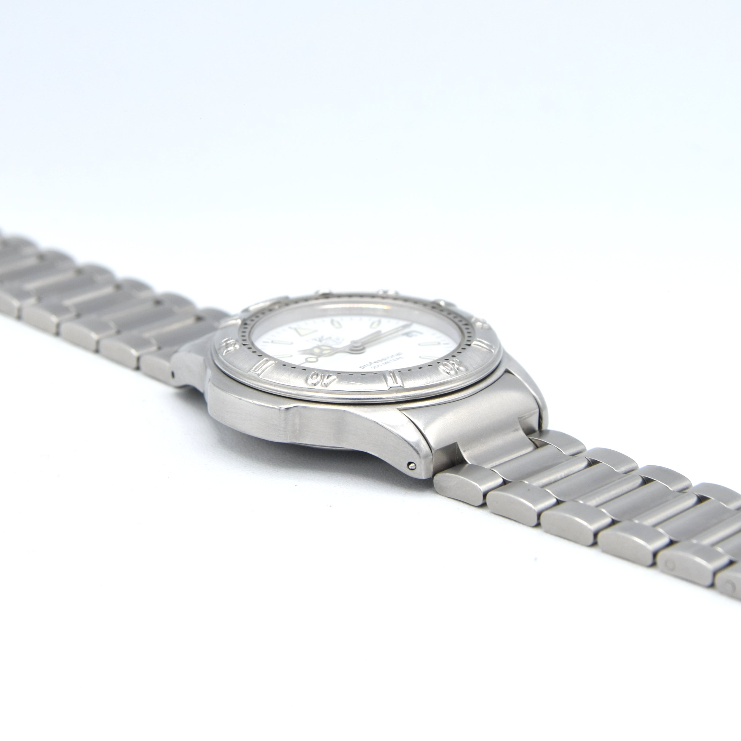 Interesting bit: the 4000 Series sits in that sweet spot after TAG’s takeover of Heuer (mid-80s) and before the modern reissues boom — a time when TAG Heuer were making robust, well-finished sports watches meant to be worn hard. They’ve quietly become a favourite for collectors who want genuine Swiss heritage without the inflated hype-tax. reference WF1212-K0, in stainless steel on its original bracelet. This example stands out with a crisp polar white dial (a great, less commonly seen look in the range), framed date window at 3 o’clock, and classic luminous hour markers with the bold triangle at 12.