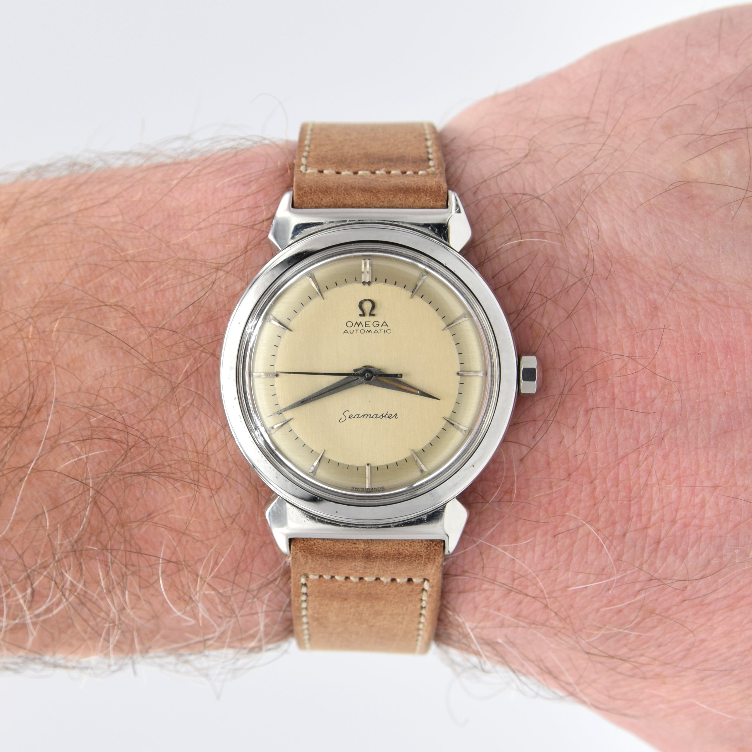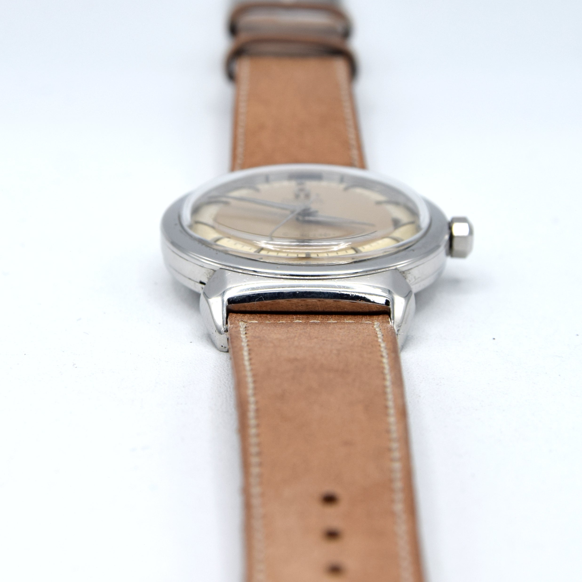 We absolutely love the combination of the fully restored silver dial and the rare hooded lugs on this Seamaster. The Caliber 354 is one of the most reliable and collectible bumper movements Omega ever produced, and the hooded case reference is a collector’s dream. This watch perfectly balances 1950s vintage charm with a fully restored condition that is ready for another lifetime of wear.