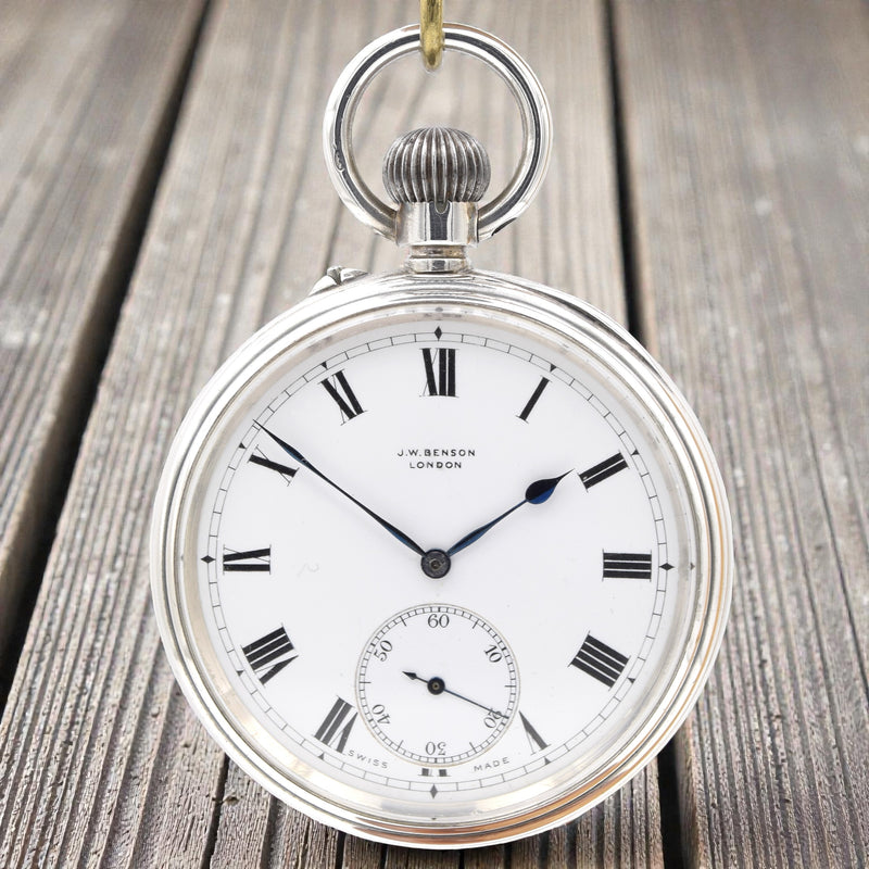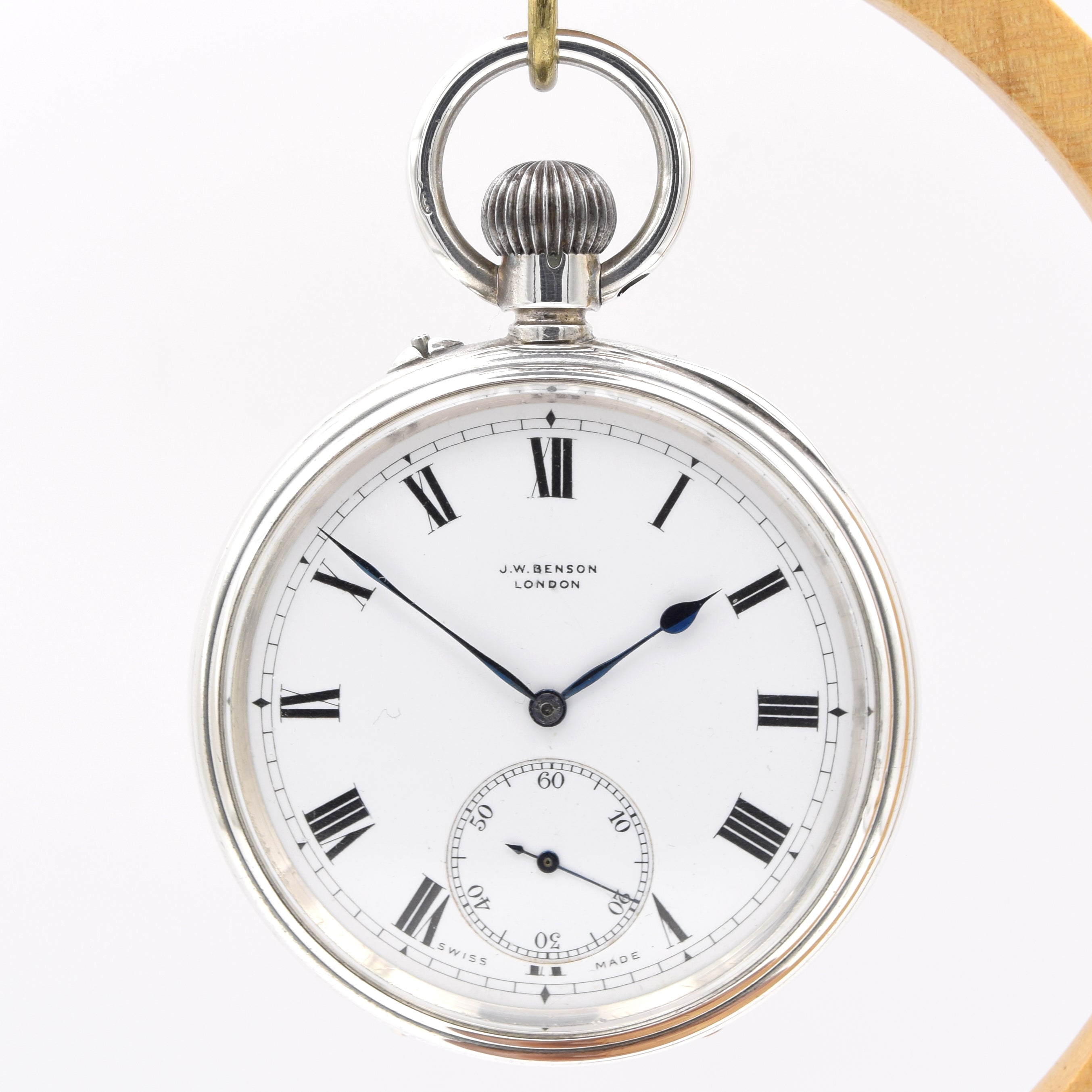 This elegant open-faced pocket watch, retailed by the famed J.W. Benson of London, is presented in superb, fine original condition. The watch is housed in a substantial solid 925 sterling silver double-hinged case which provides excellent protection and a satisfying weight in the hand. The clear, pristine original glass protects the faultless original white enamel dial, which is signed "J.W. Benson, London" and features bold black Roman numerals and a subsidiary seconds dial at 6 o'clock. The elegant blued steel hands contrast sharply with the white dial, ensuring superb legibility. Inside, the watch is powered by a high-quality, fully jewelled Swiss-made longines lever movement—a testament to Benson's practice of sourcing the best movements available for their top-tier British cases. Chain sold separately!