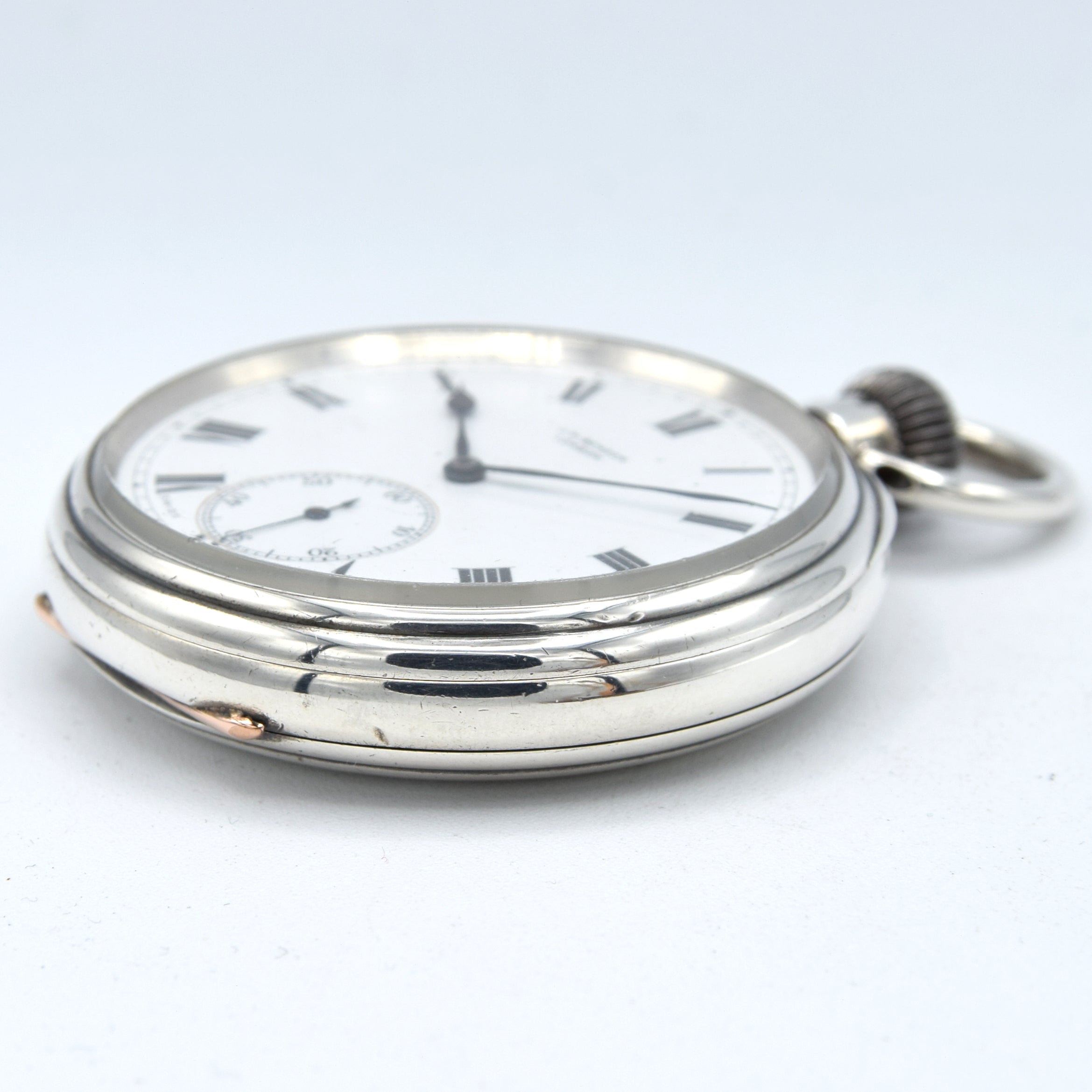 1908 Jw Benson retailed solid sterling silver open faced topwind pocketwatch by longines