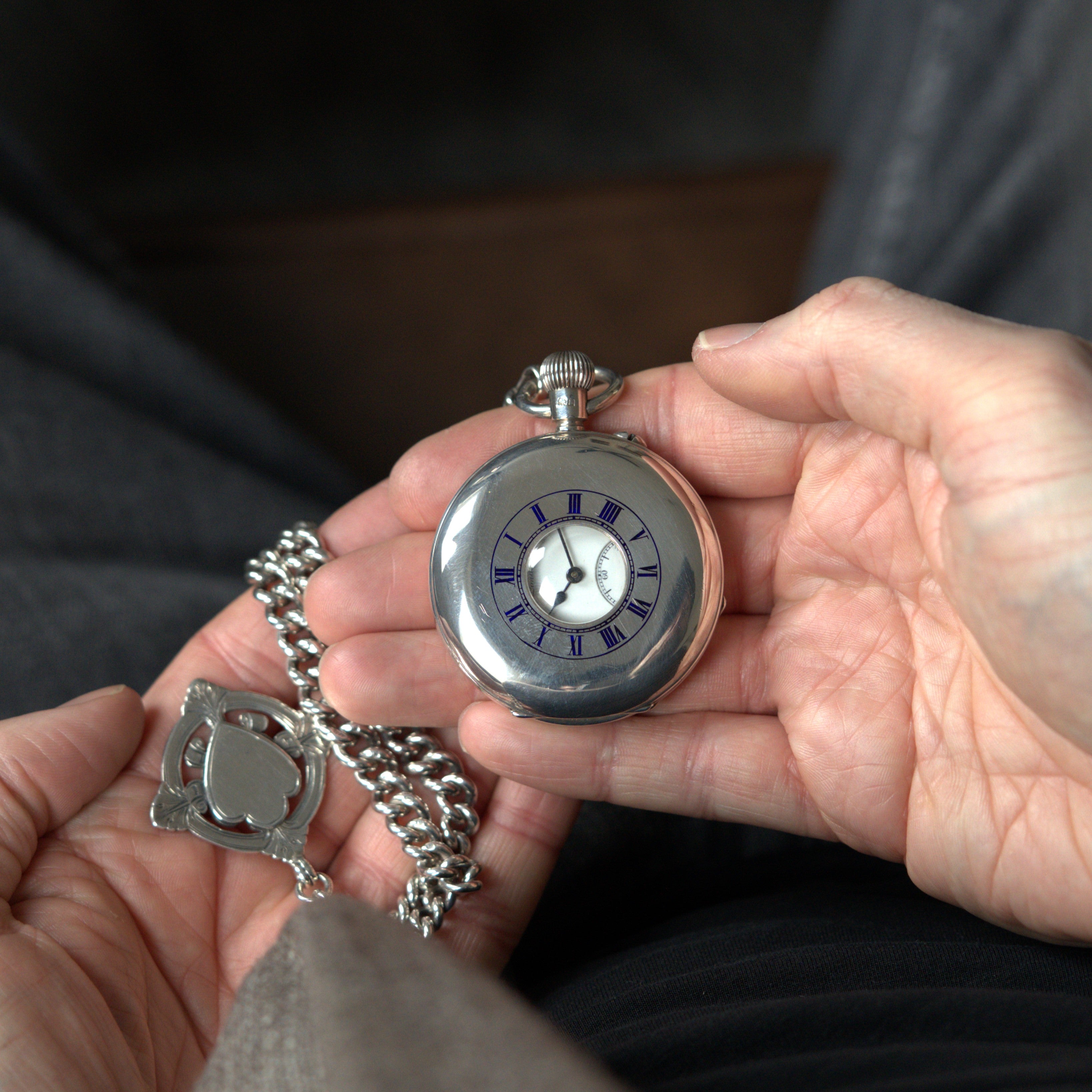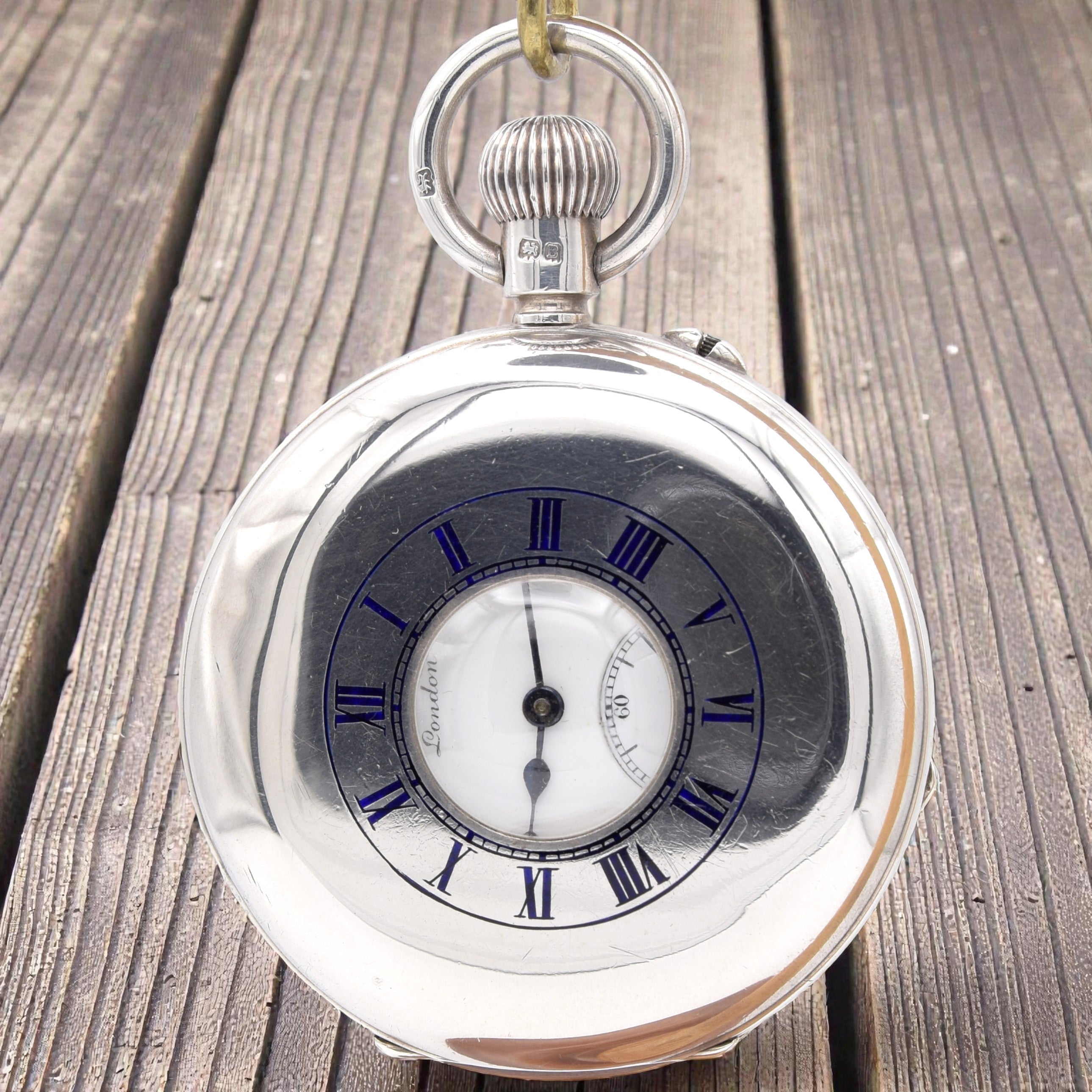 The defining characteristic of the Half Hunter style is the small crystal window set into the front cover. This allows the time to be checked discreetly without fully opening the watch. The outer cover features bold blue Roman numerals enamelled around the window, perfectly matching the blued steel hands inside.