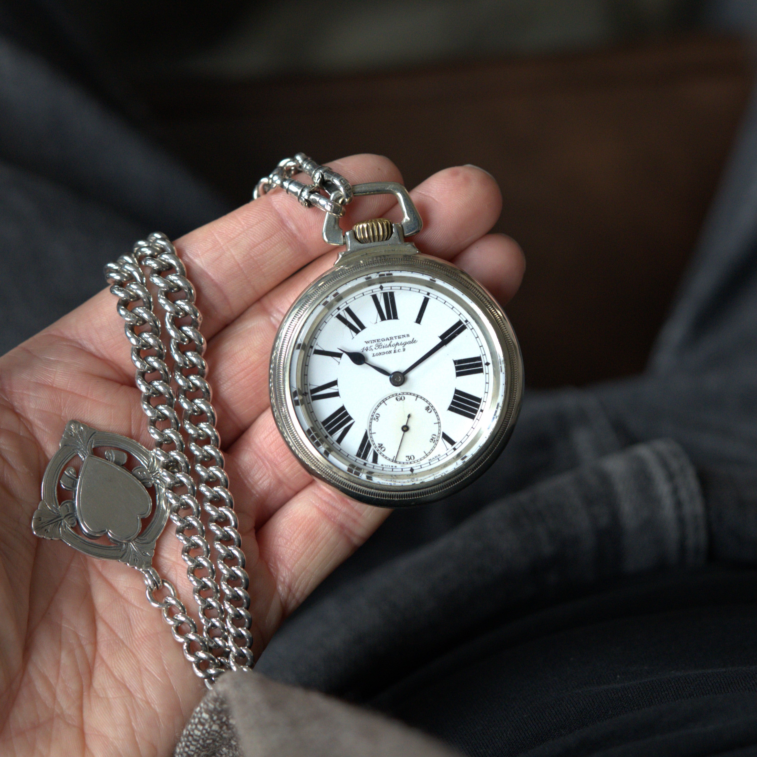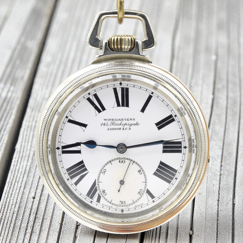This impressive pocket watch from the 1930s is a piece of British retail and horological history. It was retailed by Winegartens of 145 Bishopsgate, London EC2, a major London-based firm known for quality timepieces and jewellery.