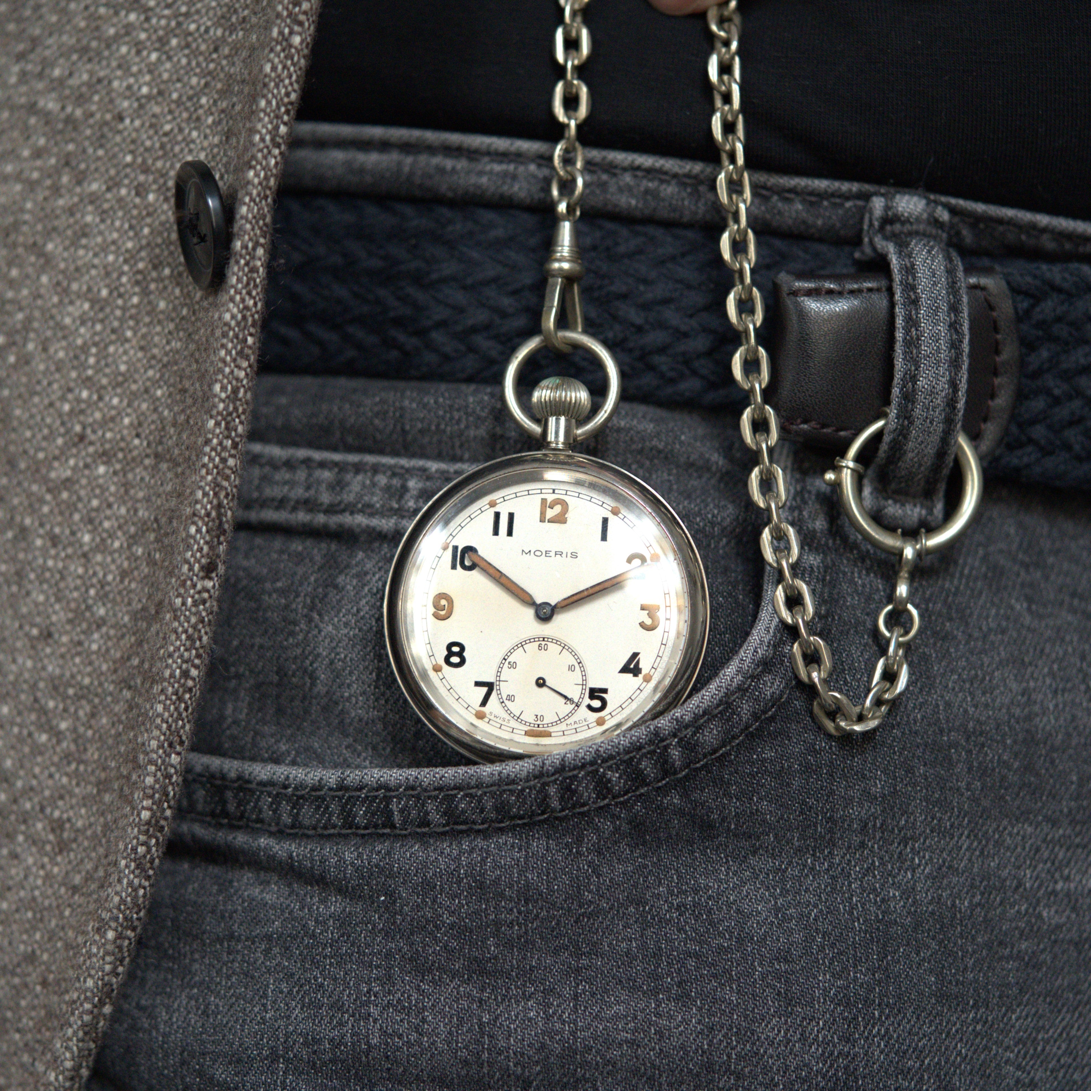 This Moeris pocket watch comes in beautiful original condition , featuring a stunning original dial design and the G.S.T.P. marking on the case back, this is an official British military issue timepiece from the Second World War. Chain pictured - Sold Separately