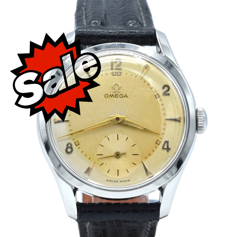 One of Omega's most robust vintage manual dress watches from the 50s era. These cases really are built like tanks! While under the hood it's powered by the tried and tested Omega in-house caliber 265 of the famous cal 30t2 family. Another sought-after vintage Omega due to its totally and ridiculously amazing two tone original dial! With a beautiful, even, eggshell Honey patina. Mixed Arabic numerals and batons at 12-2-4-8-10 positions and notice the lume points throughout the markers. A highly attractive dial with an unusually simple and understated appeal, while still possessing amazing design. Subsidiary seconds dial, which is also in-bedded. The dial has a soft even patina giving no doubt on originality. Two-piece, screw-back, fully-signed Omega case with armored crystal. This is a more substantial piece at 36mm with drilled spring bar holes for extra sturdiness