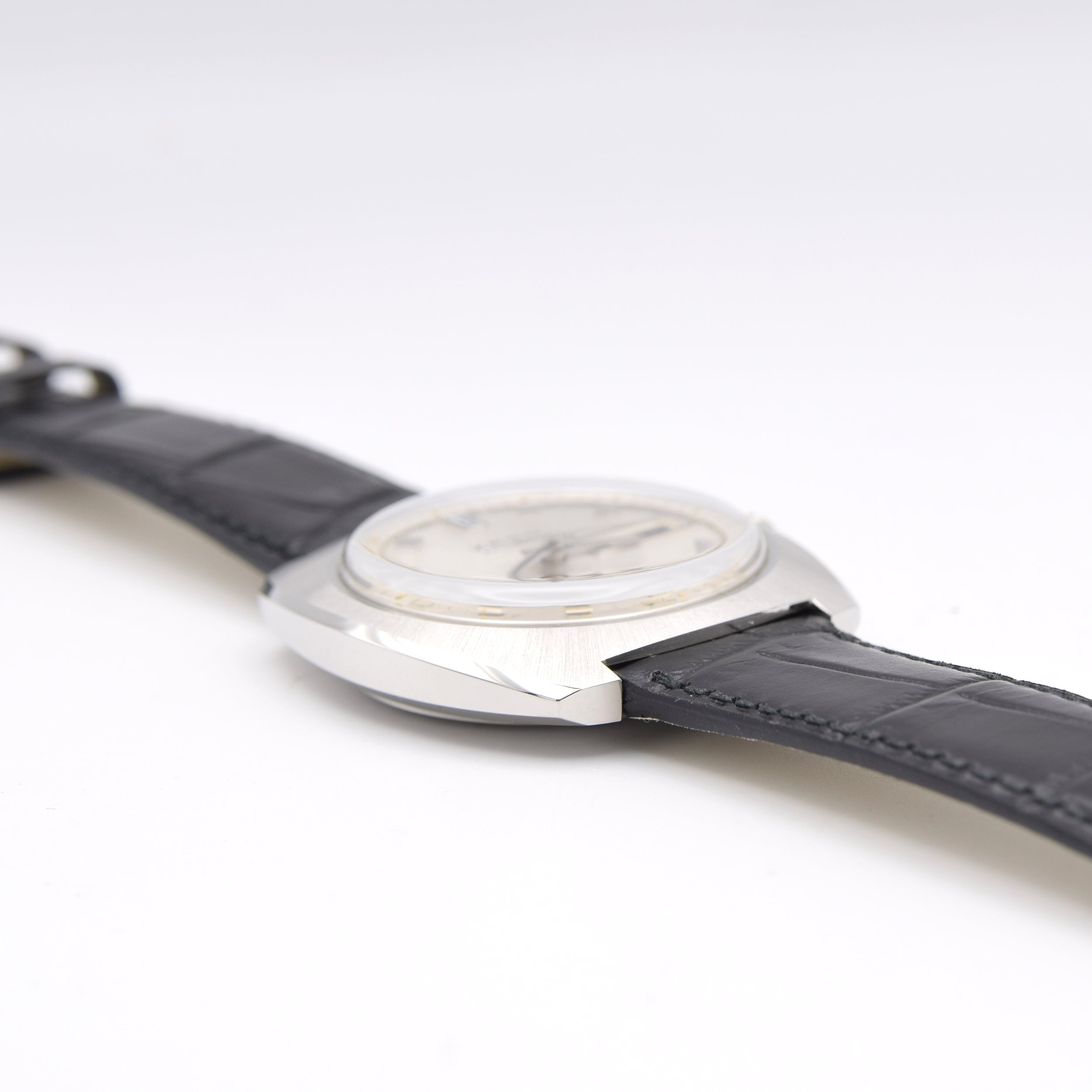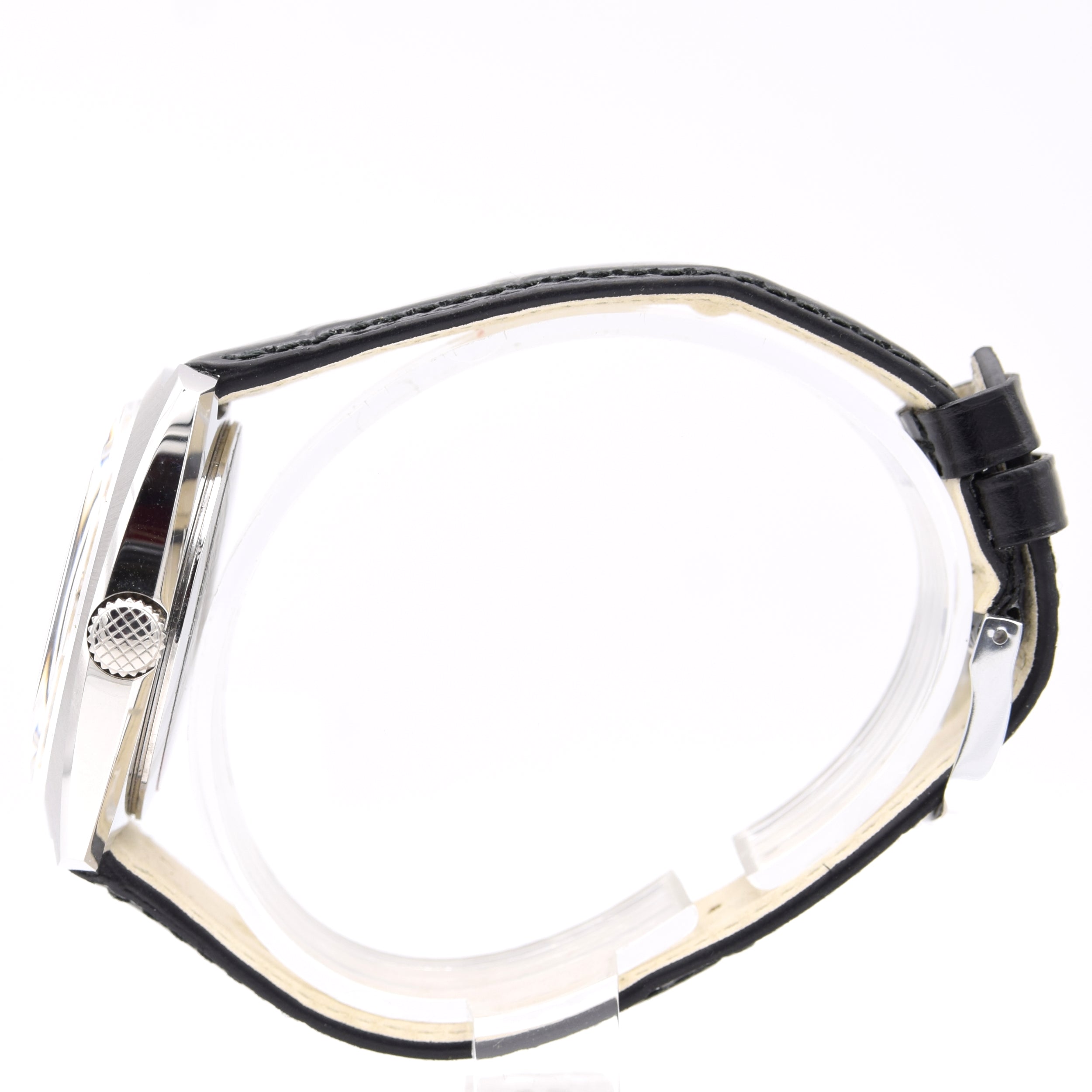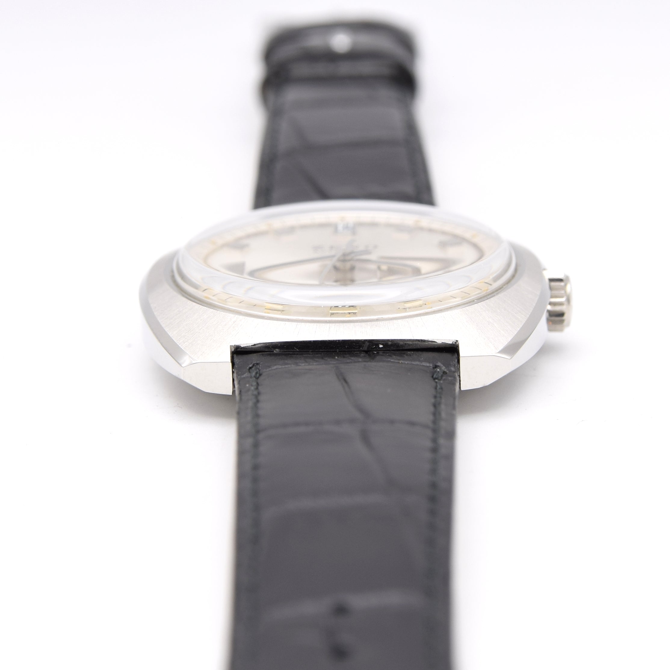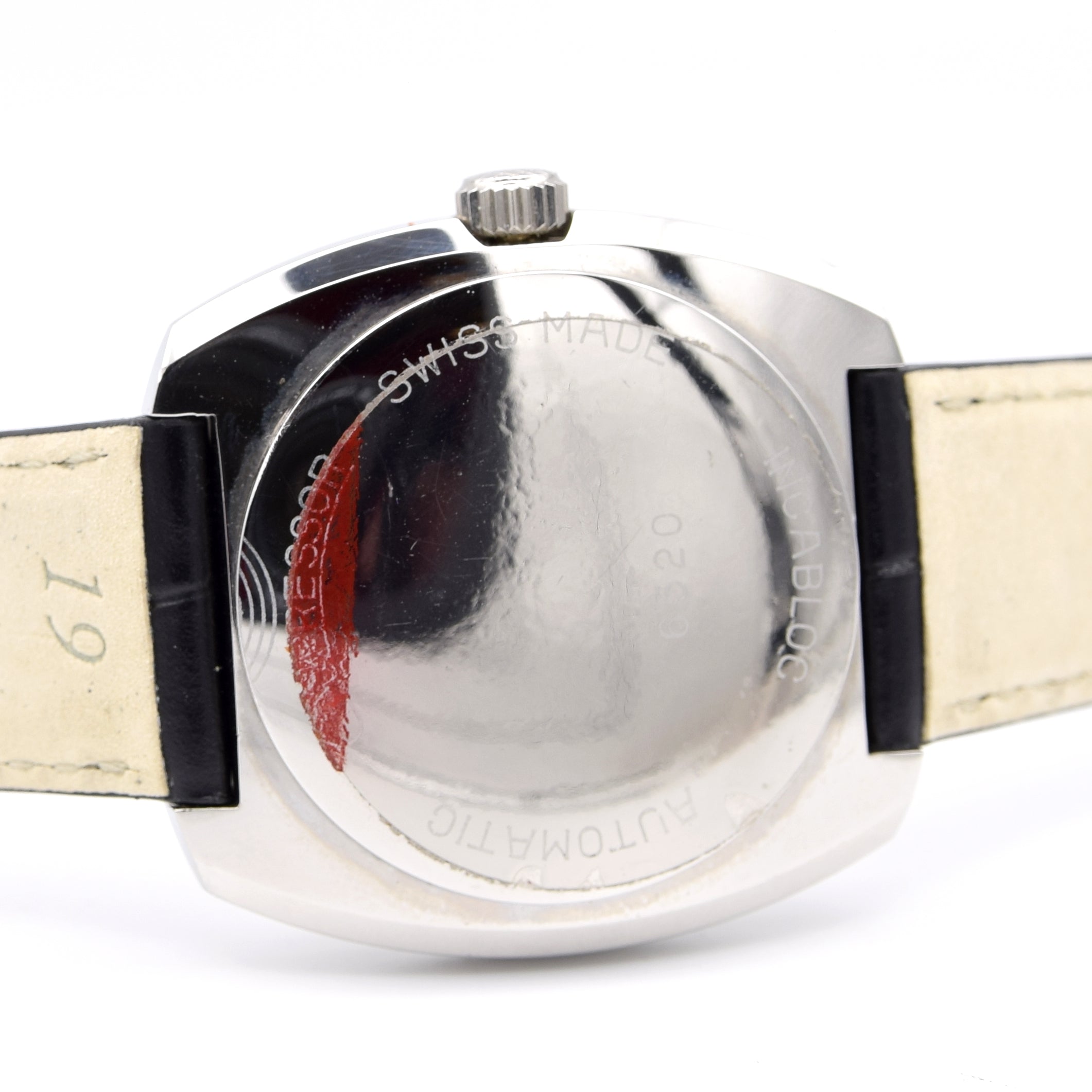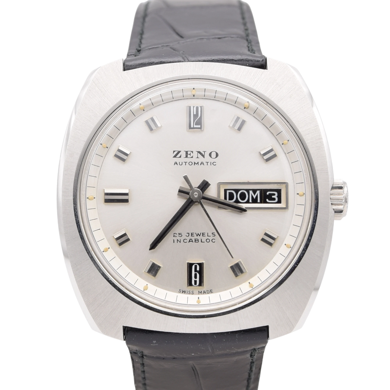 Big, bold, and very 1970s: this is a Zeno automatic in a chunky 37mm x 38mm stainless-steel cushion case with the clean, architectural lines that the era did so well. The wide brushed bezel gives it real presence on the wrist, while the hidden-lug design keeps the silhouette tidy and makes it wear surprisingly comfortably for the size.