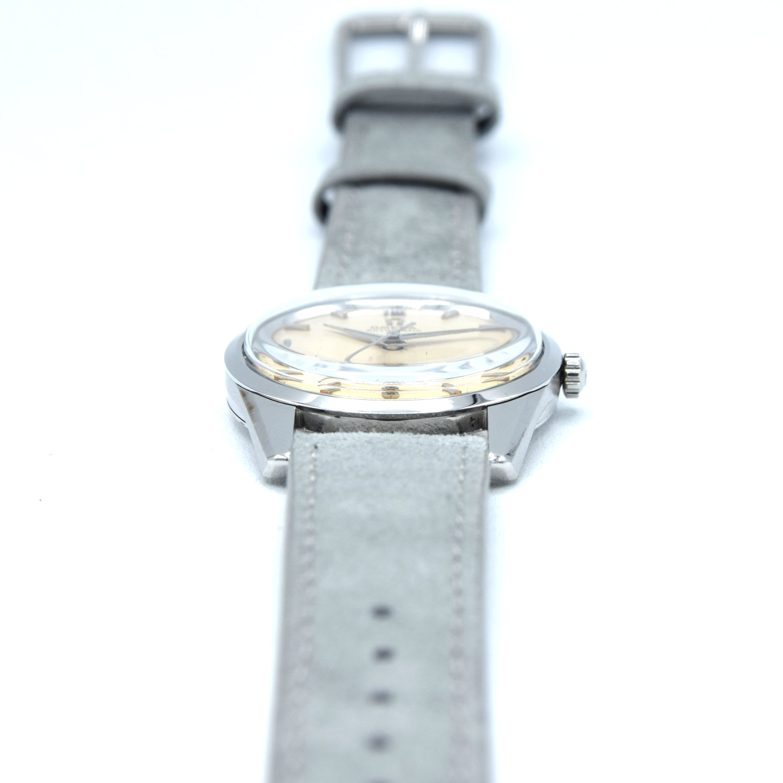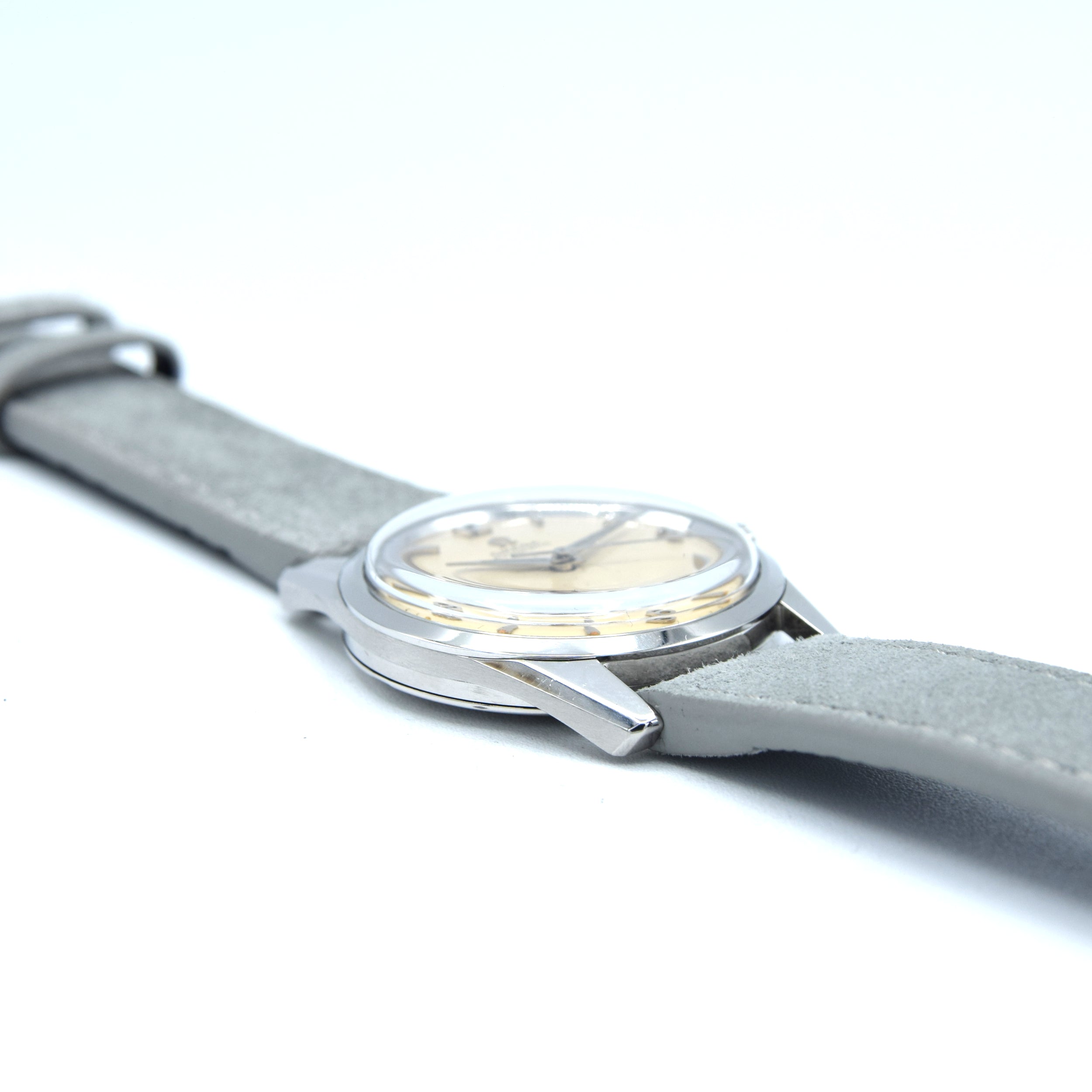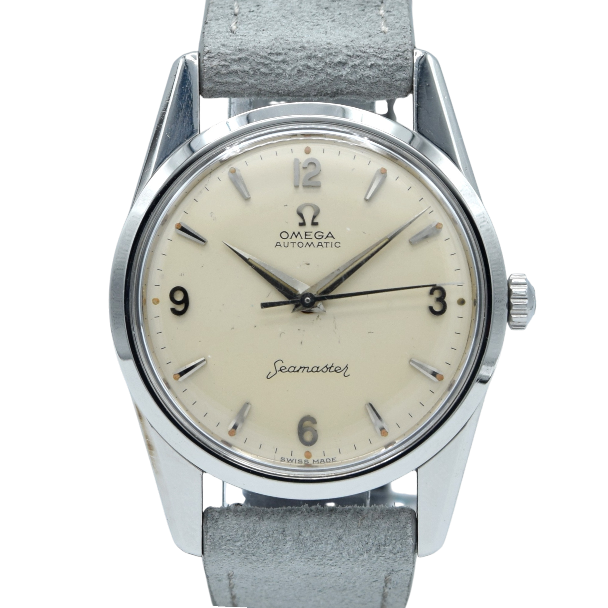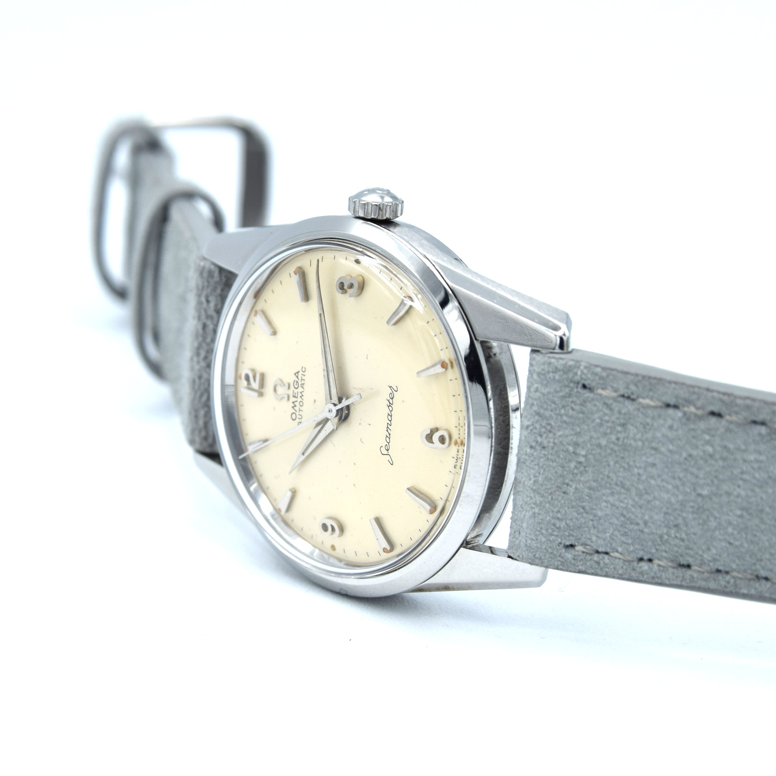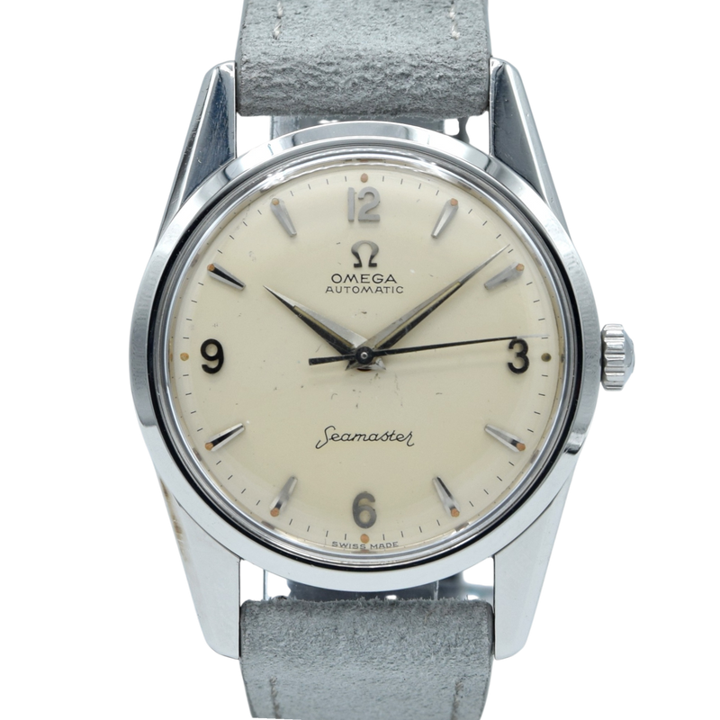 The 34mm, stainless steel, screw-back case has the famous hippocampus back is a comfortable wear for both men and women. Inside, we have Omega's automatic caliber 552 fully serviced by us and running strongly. We've paired the watch on a more modern up to date suede strap but it looks good on anything - Other options available on request