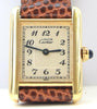 This stunning Cartier Tank has all Arabic numerals on it's creamed dial, as well as the railway-style minute tracking, Roman numerals, blue steel hands, the cabochon winding crown. Set in a sterling silver 925 gilt vermeil case, this ladies-sized watch is style perfection.