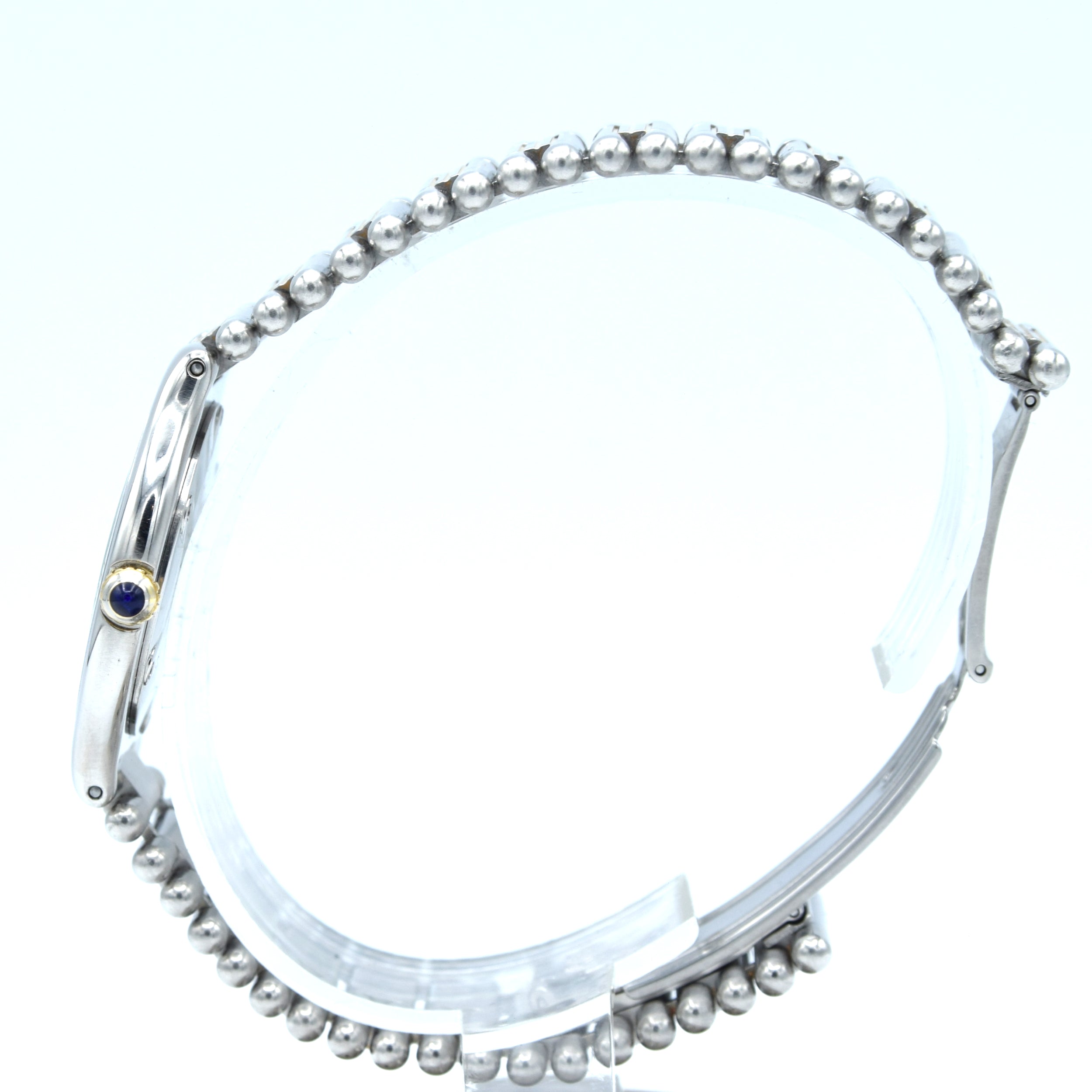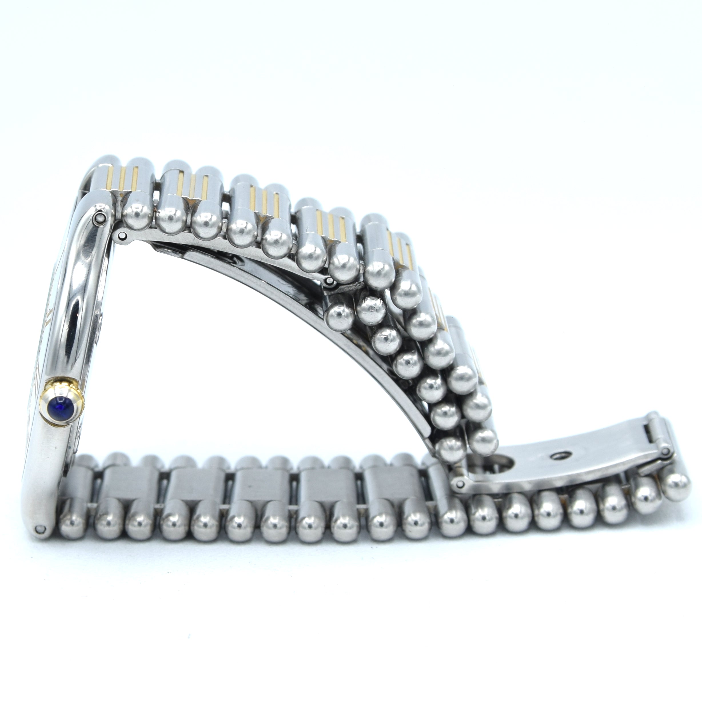 This example features the signature engraved Roman numeral bezel with gold accents, the clean Cartier signed dial, and that superb two-tone bracelet that wears comfortably while still feeling substantial on the wrist. Powered by a reliable Swiss quartz movement, it’s a true “grab-and-go” Cartier that keeps excellent time with minimal fuss.