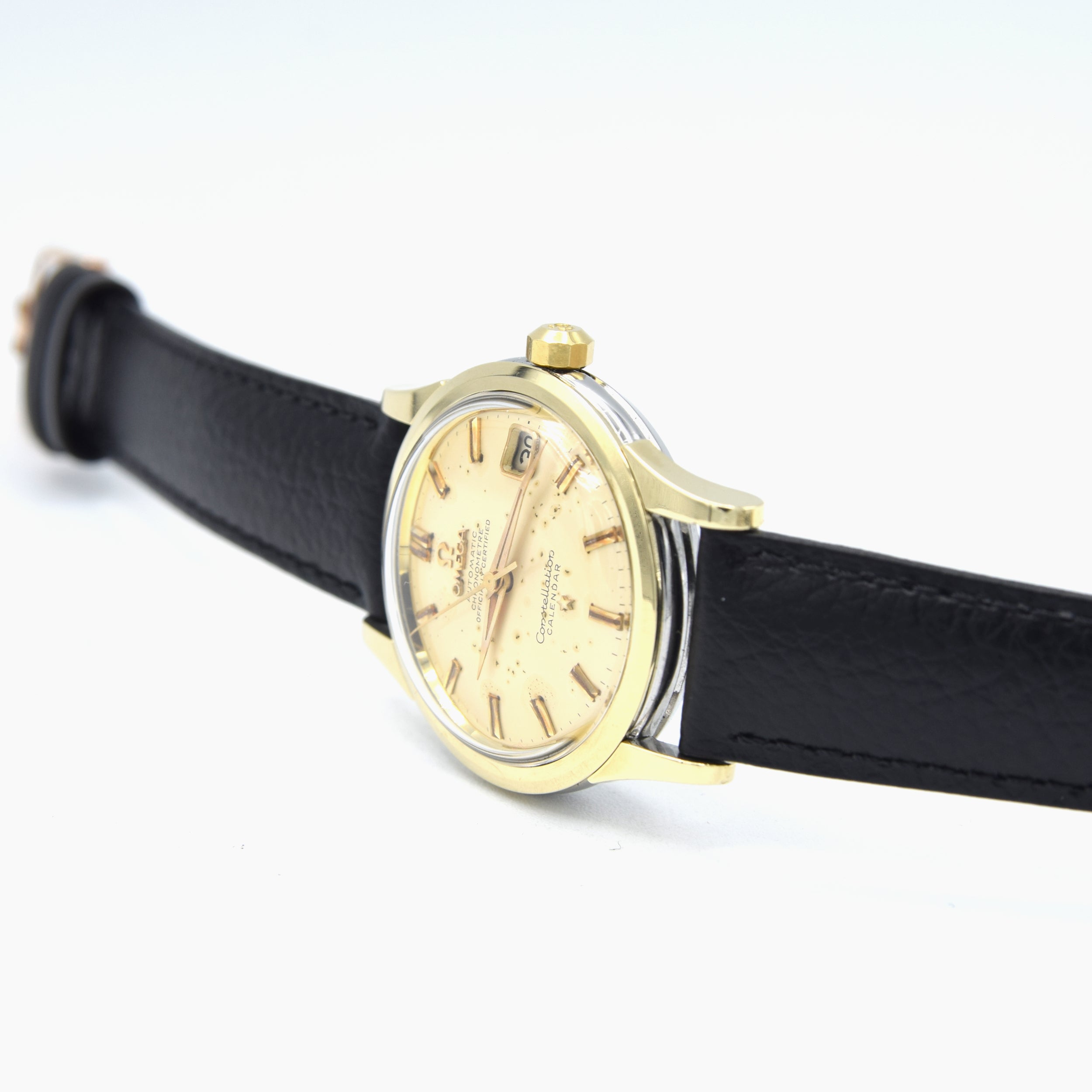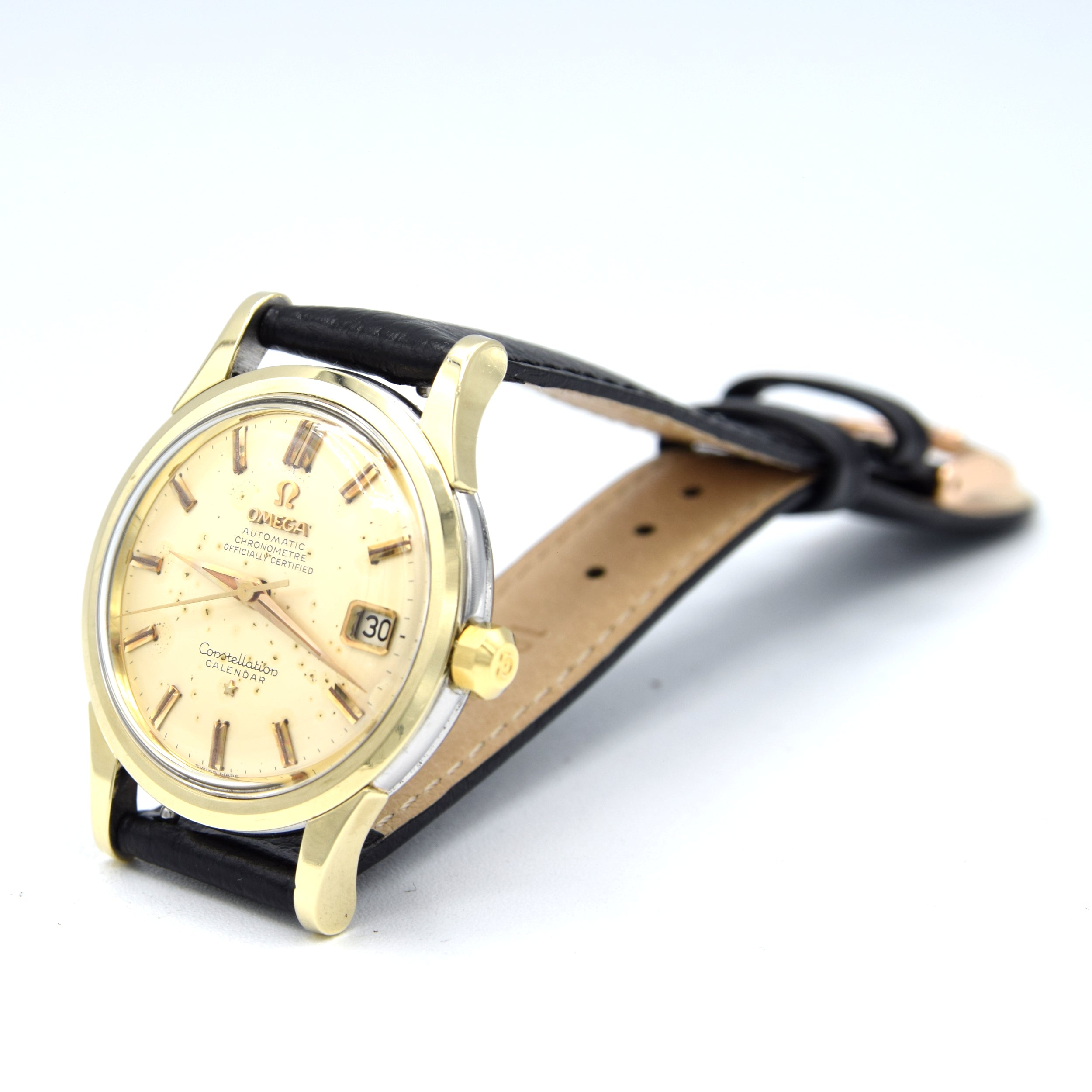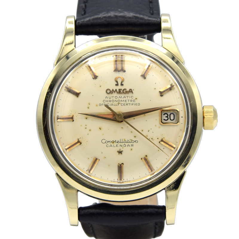 We have here a tried and tested fabulous favourite - The Omega Constellation Calendar from 1958. This 2943 model has an aged original off-white/ivory dial with gilt baton markers - old lume type strips and double baton markers at 12 o'clock. Gilt, dauphine hour, minute and central seconds hands sit in the centre. The dial is signed 'Omega, Automatic, Chronometer, Officially Certified' at 12 o'clock with the famous Omega logo and 'Omega' both in applied gilt, which makes them really pop. At 3 o'clock is the date window, also framed in gilt, giving an elevated sense of luxury to the watch. At 6 o'clock, the dial is signed 'Constellation, Calendar.'